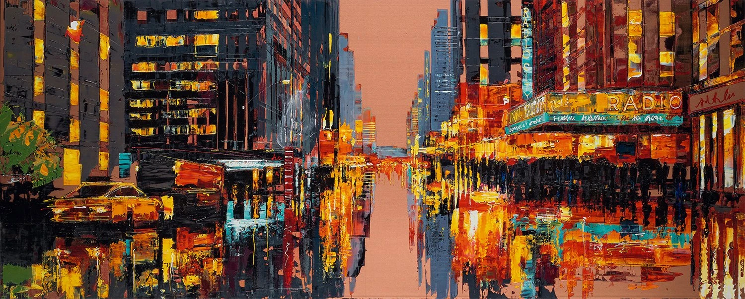 A glowing panoramic view of New York City is accentuated by the electric warmth of copper in this giclée on stainless steel substrate by Paul Kenton. Exposed areas of copper replicate lights of the roaring city reflecting off windows and puddles in the road; splashing and spraying as the vivid yellow taxis brush past.