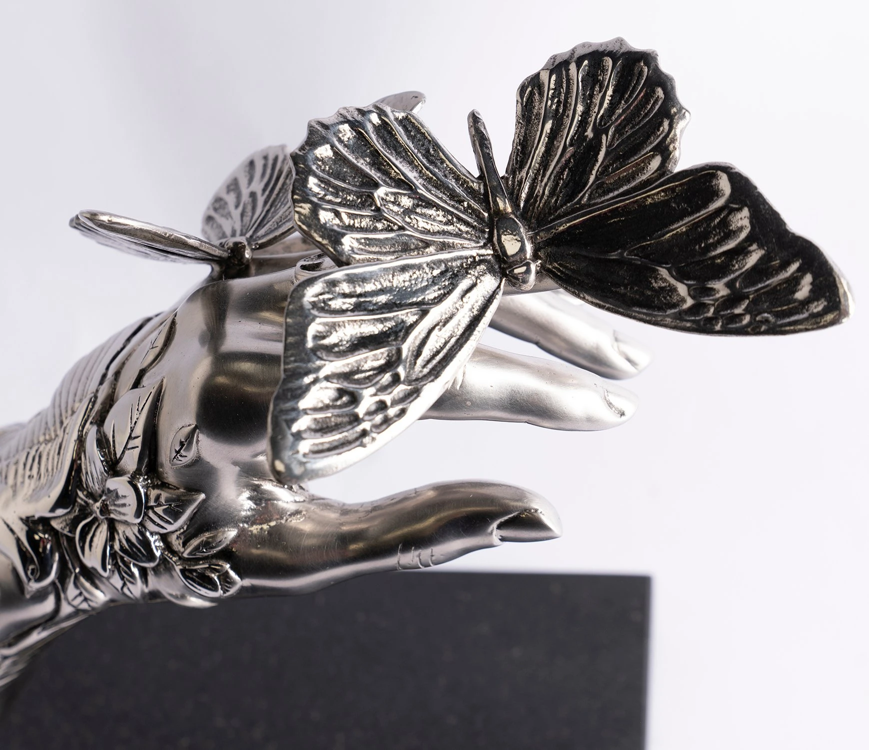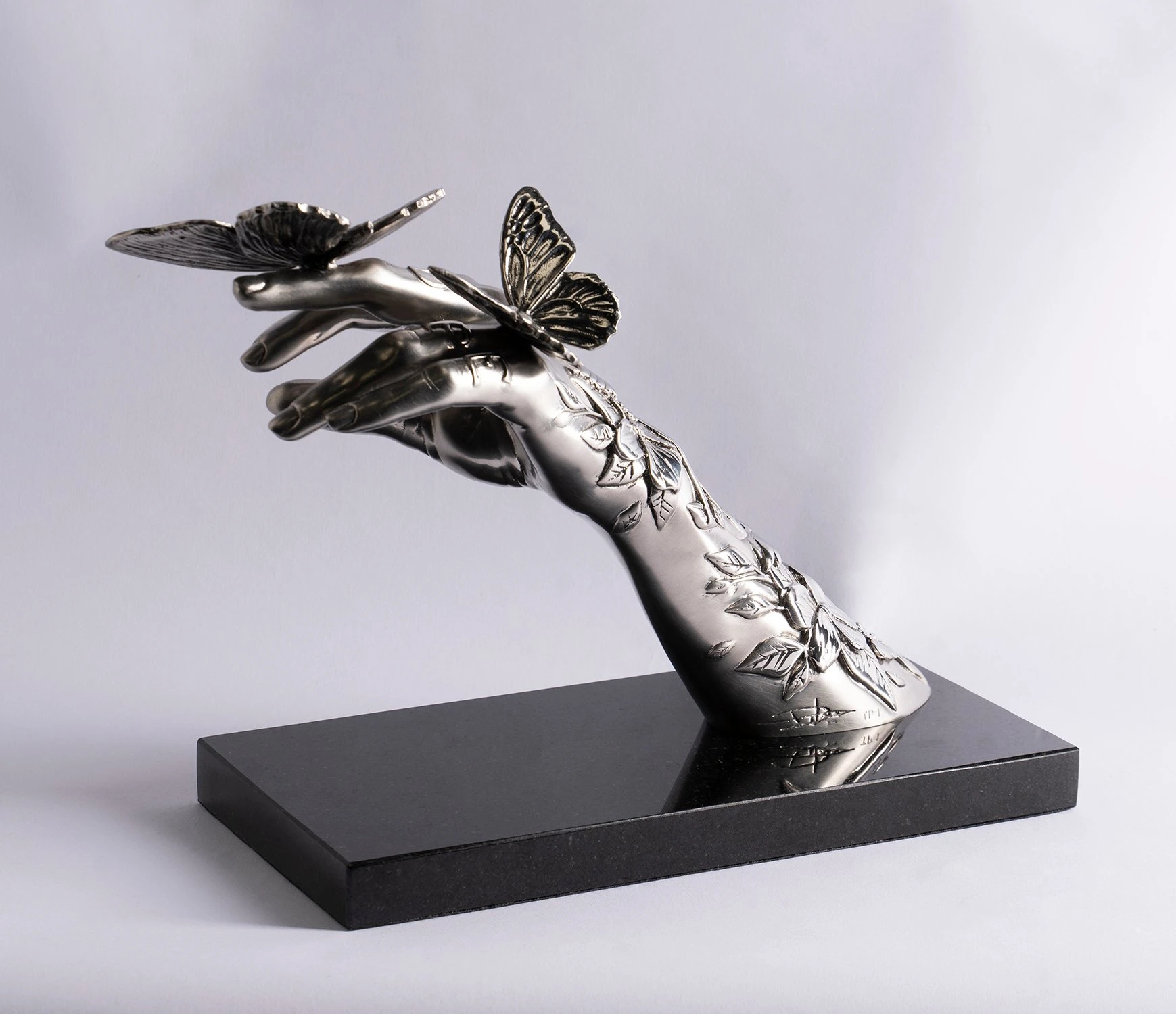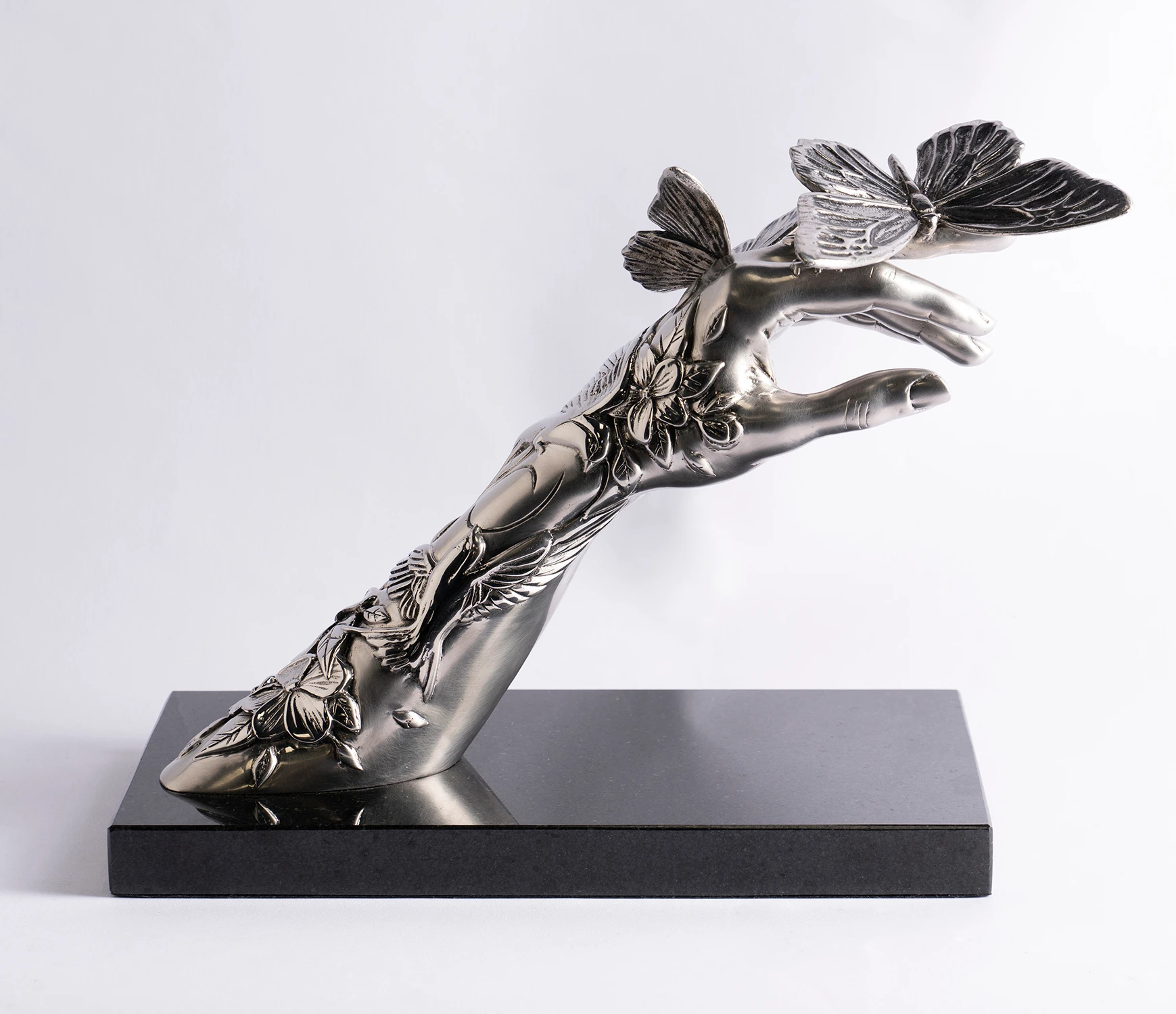 The timeless majesty of classical sculptors Michelangelo and Bernini are combined with the rugged delicacy of Dan Lane’s contemporary masterpieces in this elegant stainless steel sculpture. The smooth female arm, mounted on a smart black granite base, is juxtaposed with 3D tattoos that emerge out of the arm like aspects of nature;Â perfectly complementing the meticulous steel butterfly perching, as if weightless, on the fingers of the piece.