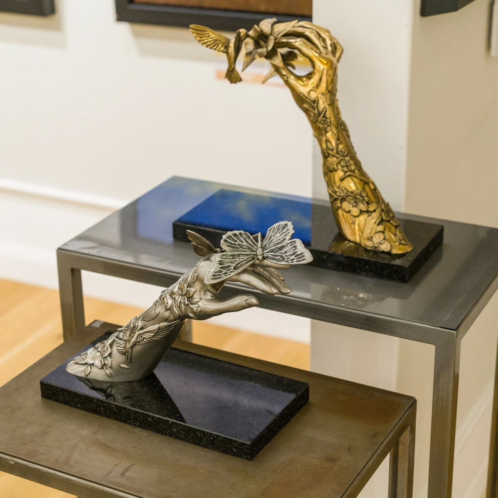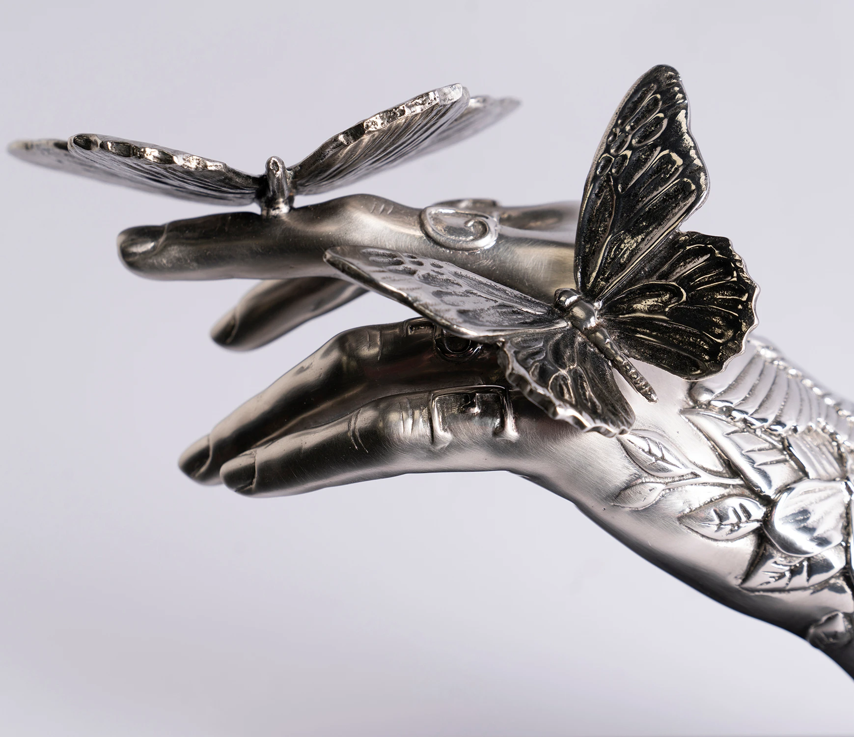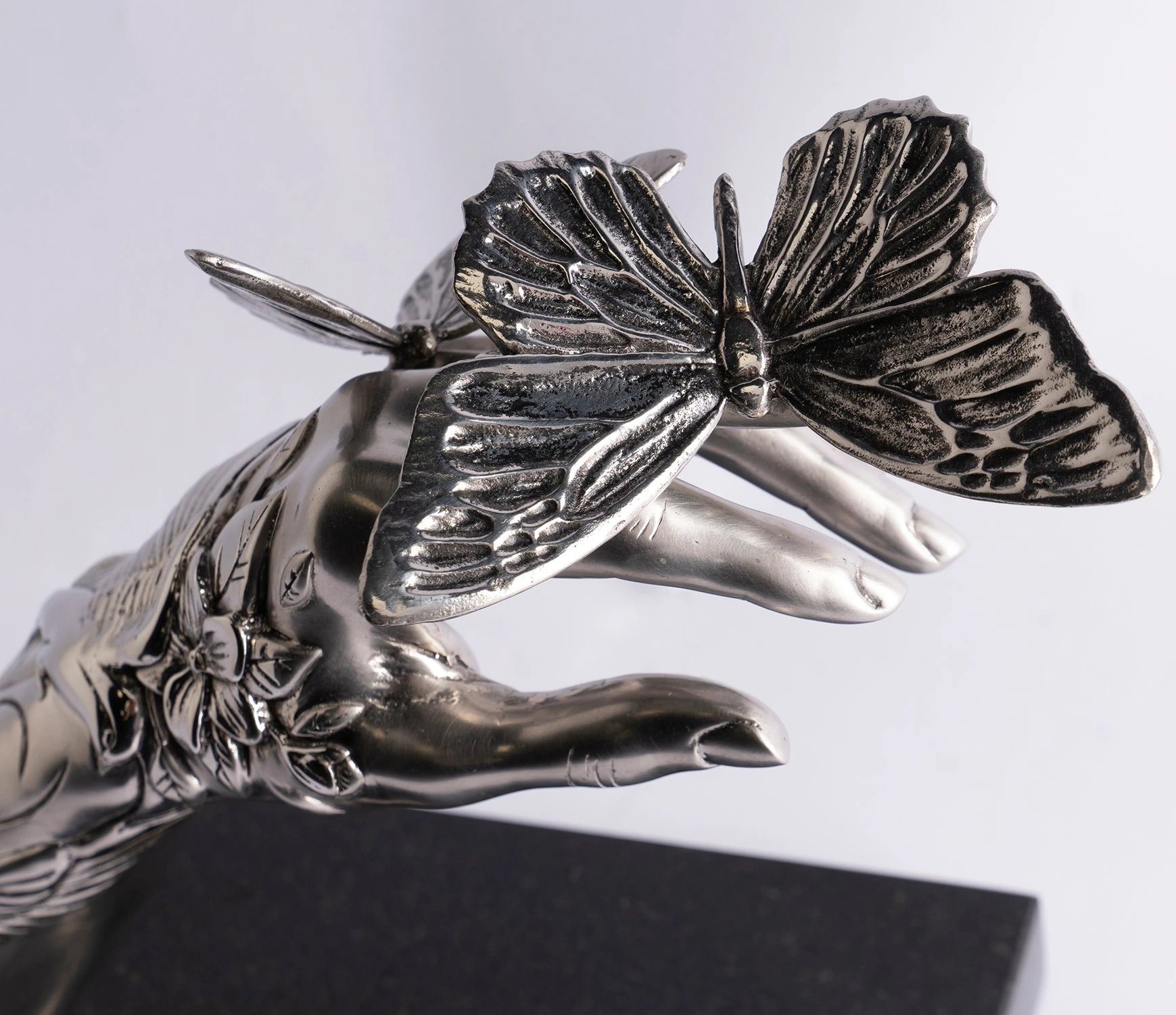 The timeless majesty of classical sculptors Michelangelo and Bernini are combined with the rugged delicacy of Dan Lane’s contemporary masterpieces in this elegant stainless steel sculpture. The smooth female arm, mounted on a smart black granite base, is juxtaposed with 3D tattoos that emerge out of the arm like aspects of nature;Â perfectly complementing the meticulous steel butterfly perching, as if weightless, on the fingers of the piece.