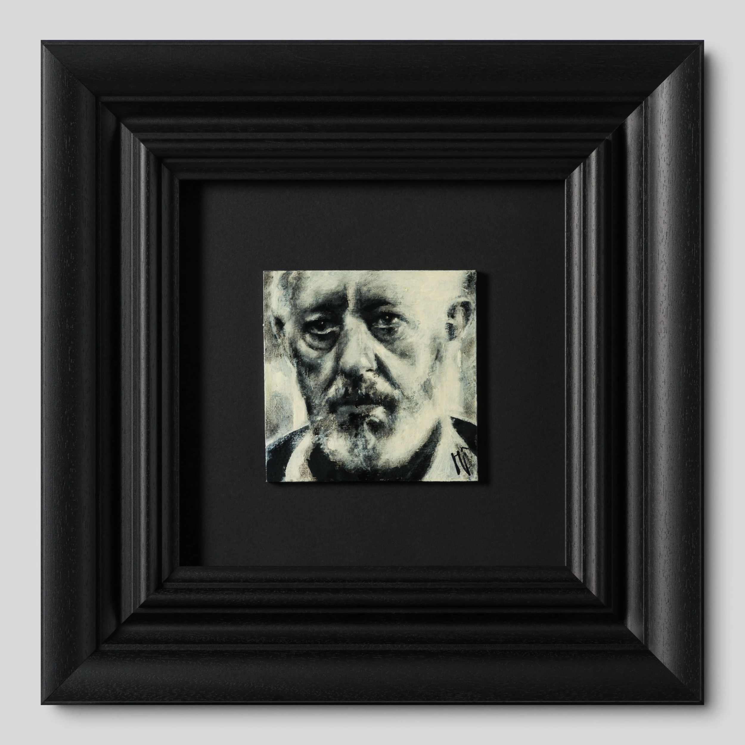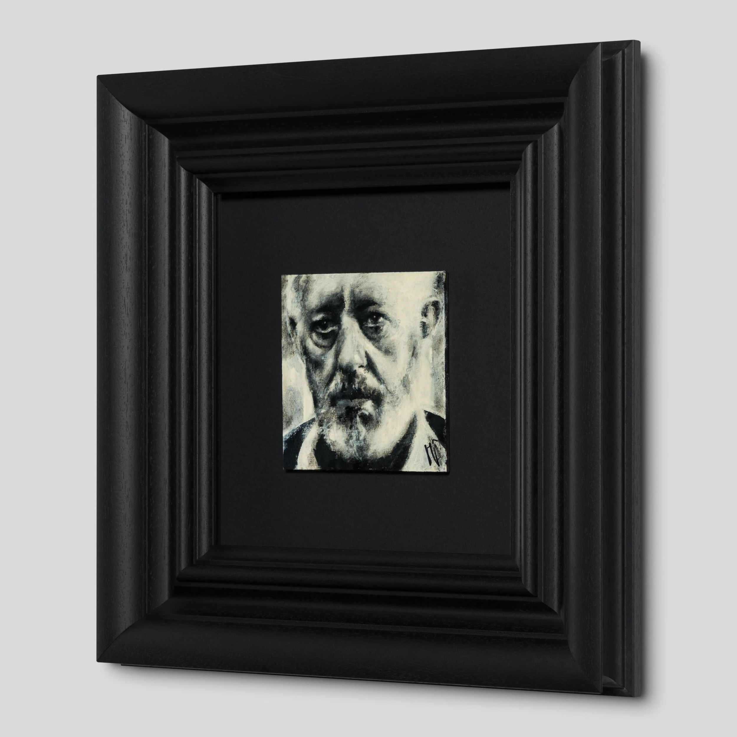 Jon Jones’s new collection, , is centred on the artist going back to basics and his roots, painting people that have a special place in his heart. Often depicting celebrities or the Peaky Blinders gang, his haunting portraits are perfect for both traditional and contemporary spaces. Perplexing, and melancholic, Jon’s work is created from the heart, capturing expressions, moods and feelings. All the individual portraits are from people who have interested or inspired the artist in this case Alec Guinness. The famous Star Wars actor delivered one of the most iconic lines from the sci-fi saga “Who Is the More Foolish The Fool Or The Fool Who Follows Him”. Using conflicting tones of cream white, black and grey to create a highly atmospheric figurative artwork with an essence of realism capturing a monochrome scene.