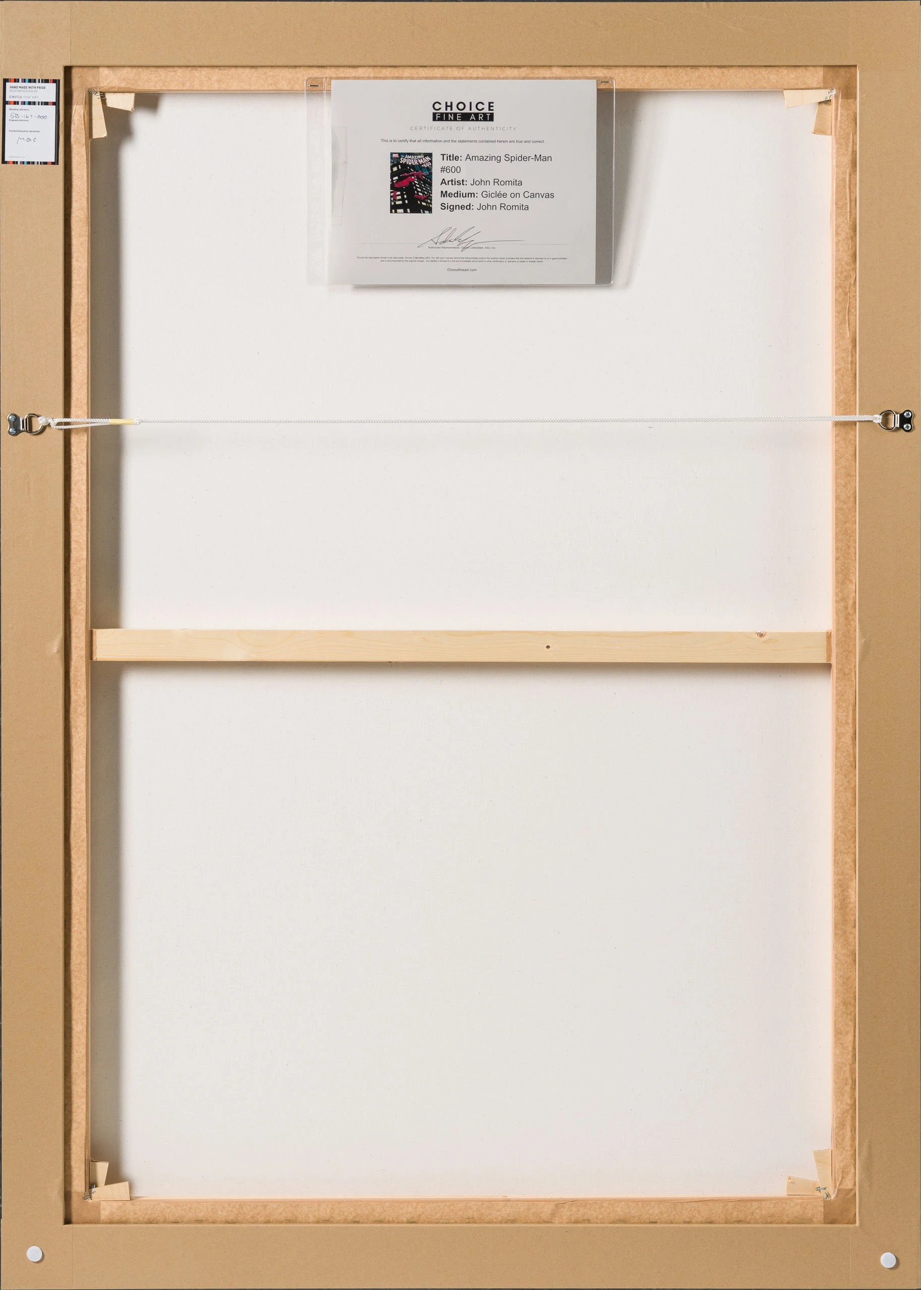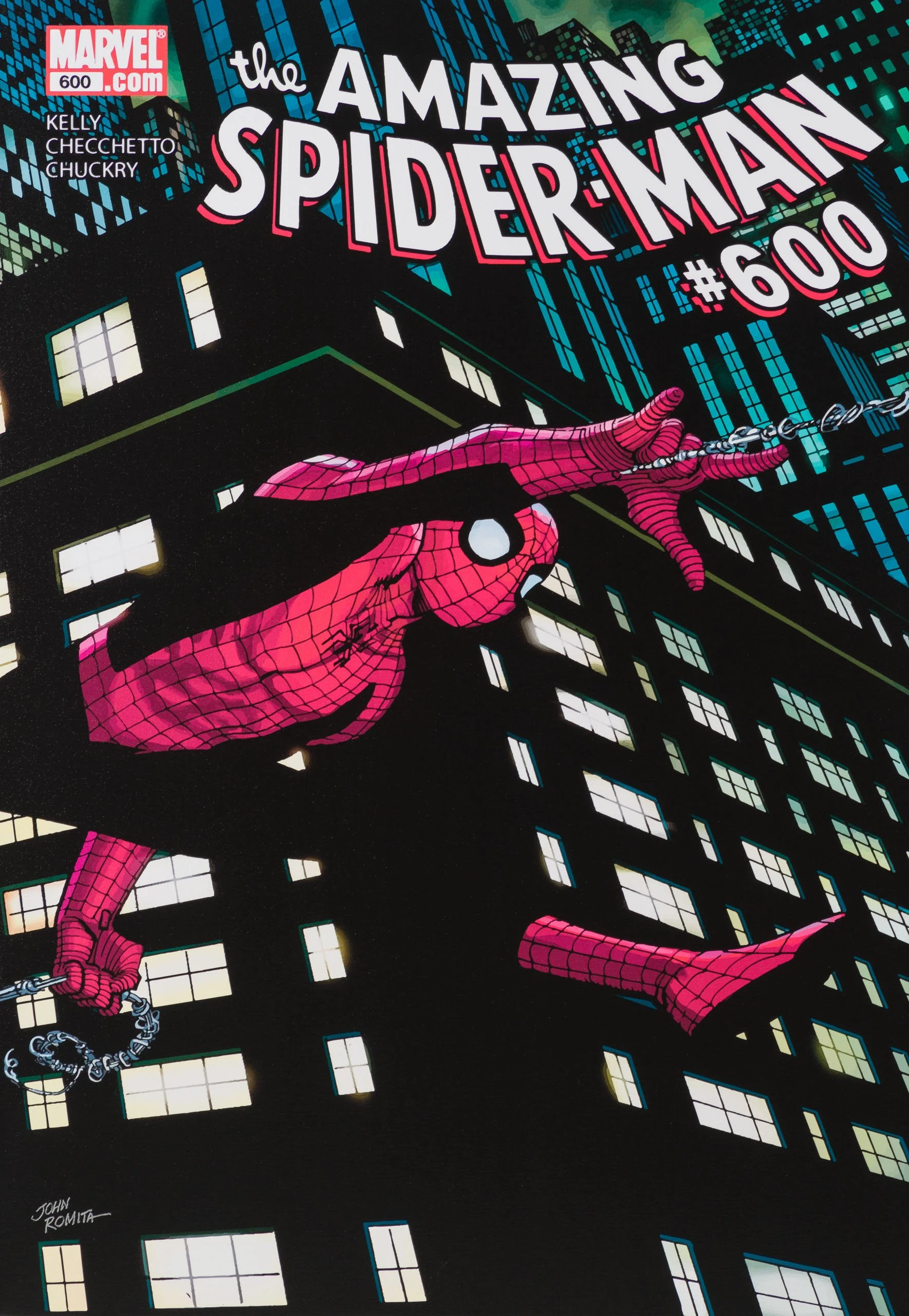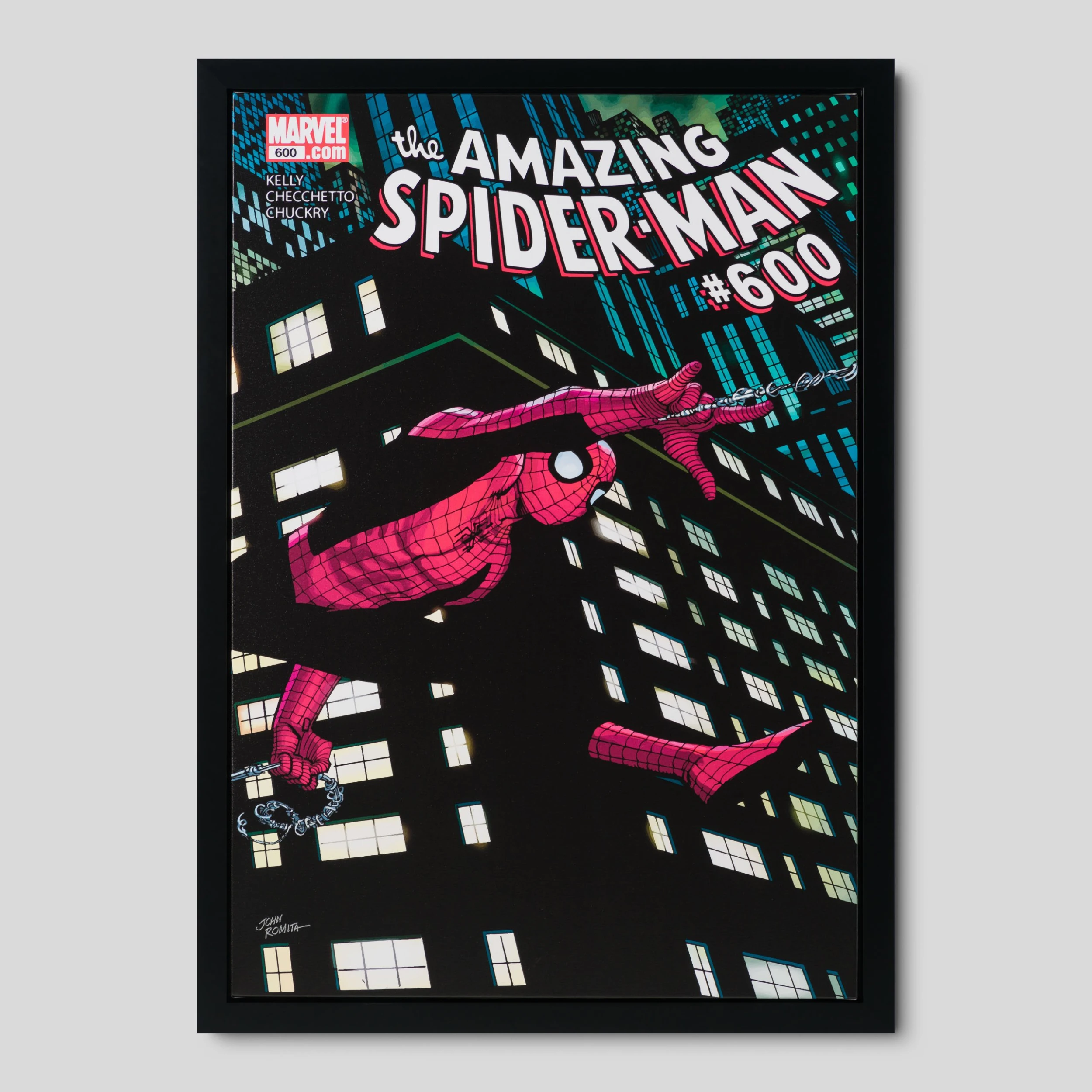 Published in 2009, “Amazing Spider-Man #600” is a Marvel Superhero unique edition of the issue’s cover, hand-signed by John Romita Sr. Spider-Man first appeared in Marvel comic books in August 1962, in Amazing Fantasy #15 in the Silver Age of Comic Books.
