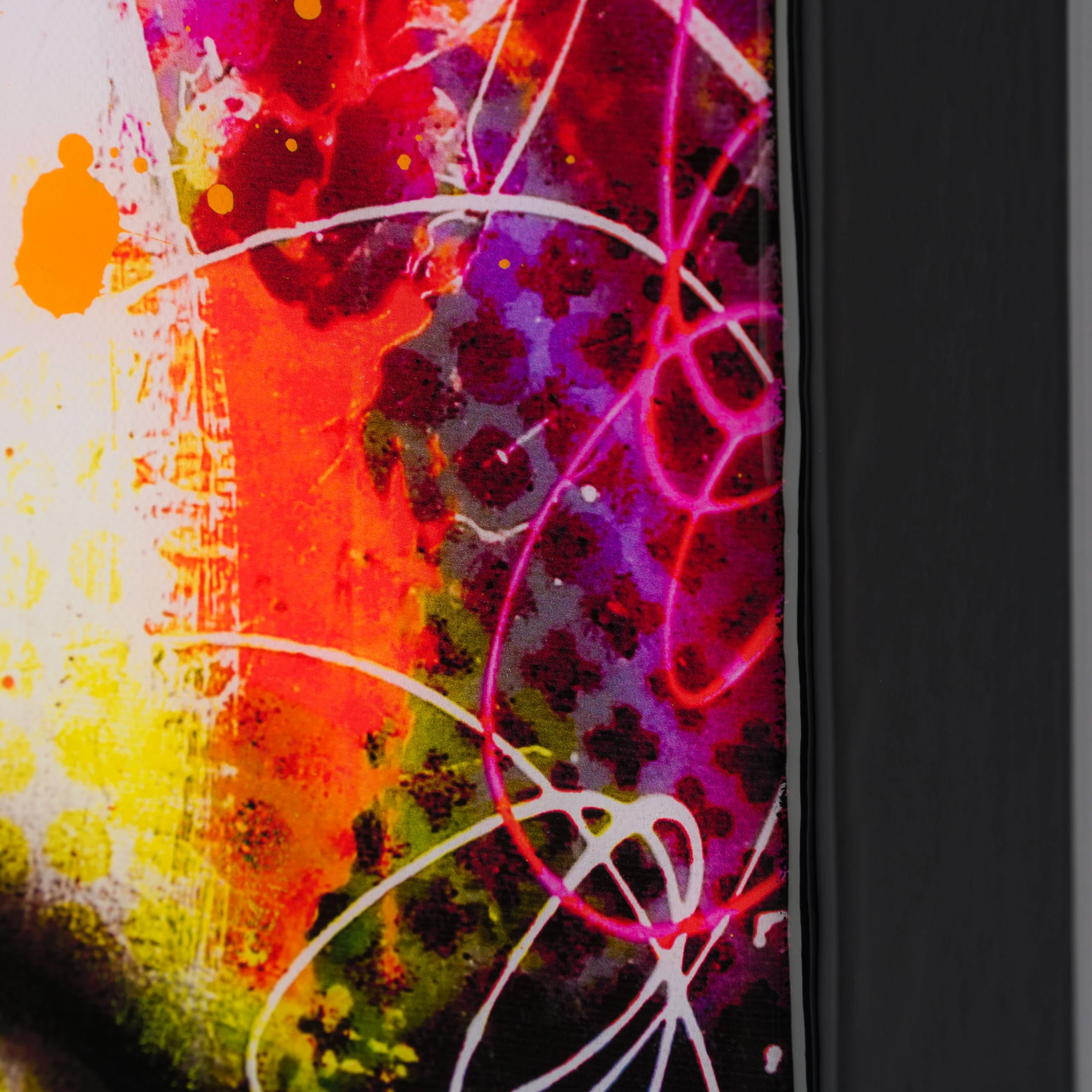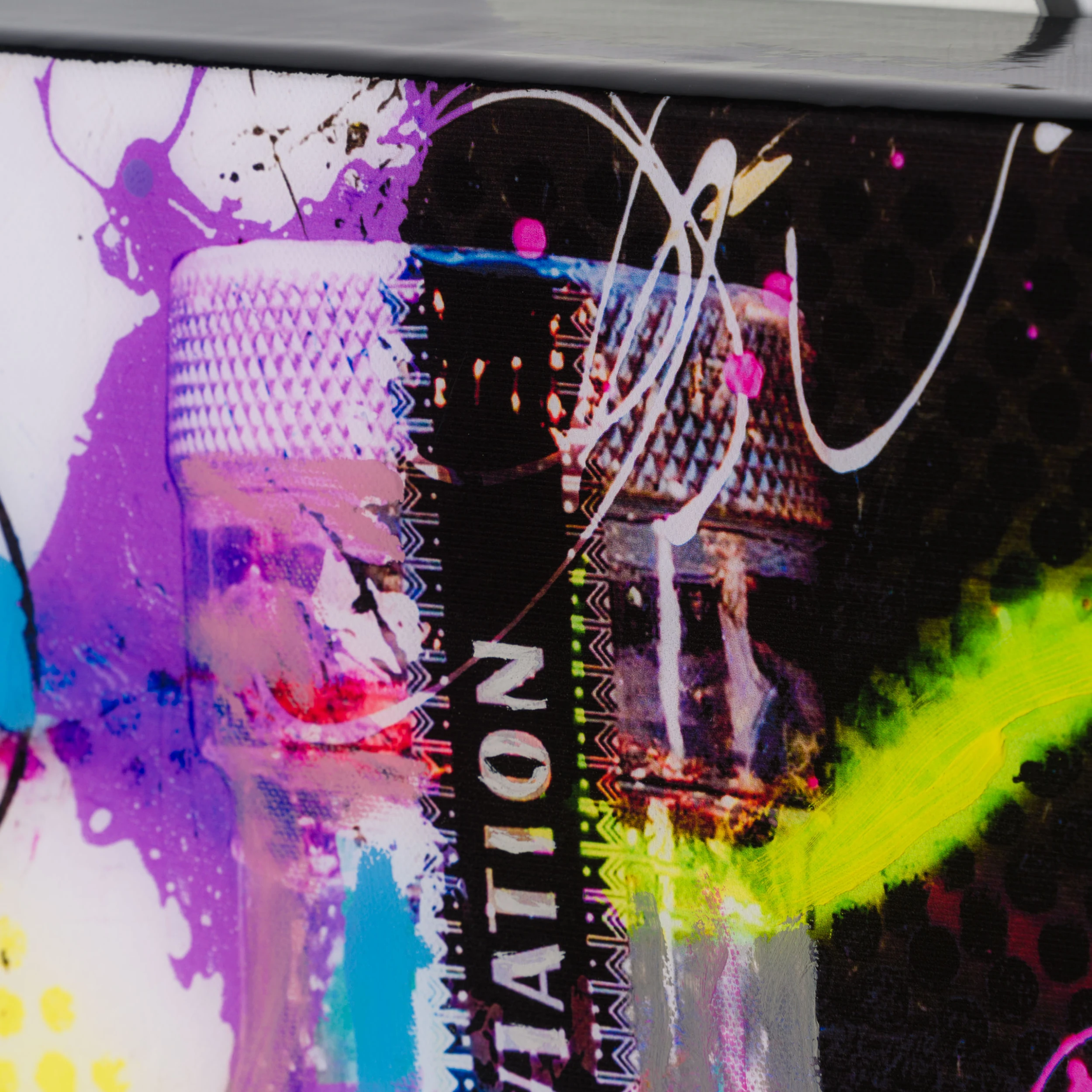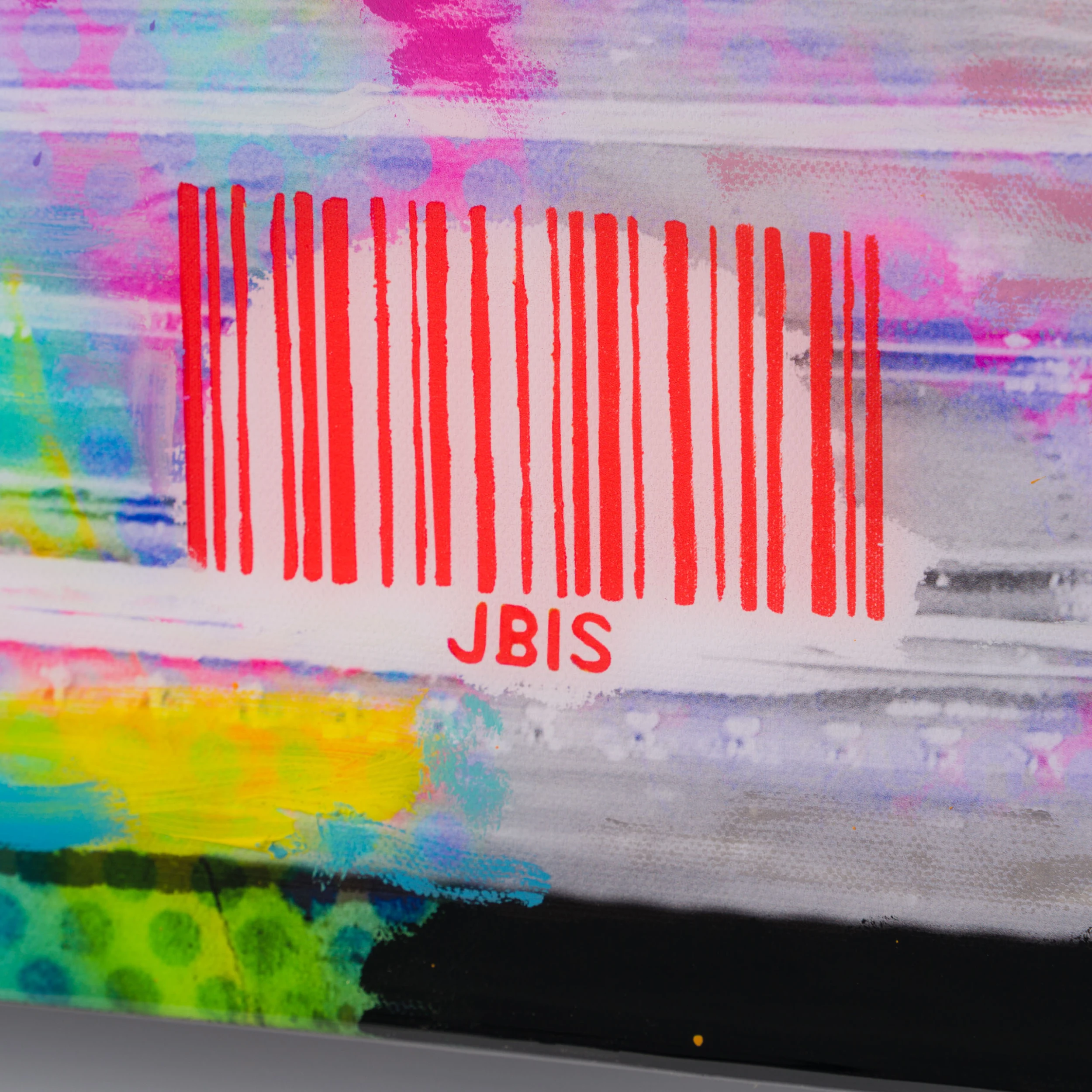 Epitomising the Bisaillon Brothers’ interest in mid-20th century pop culture and 21st century technology, this artwork sees the duo combine their techniques and philosophies in a vibrant mosaic of different mediums. These include: resin, acrylic paint, graphic design and code; all of which feature in the above original. The latter involves Michael Bisaillon’s own trinary code which he applies as a comment on the conflict between digital and analogue in contemporary society.