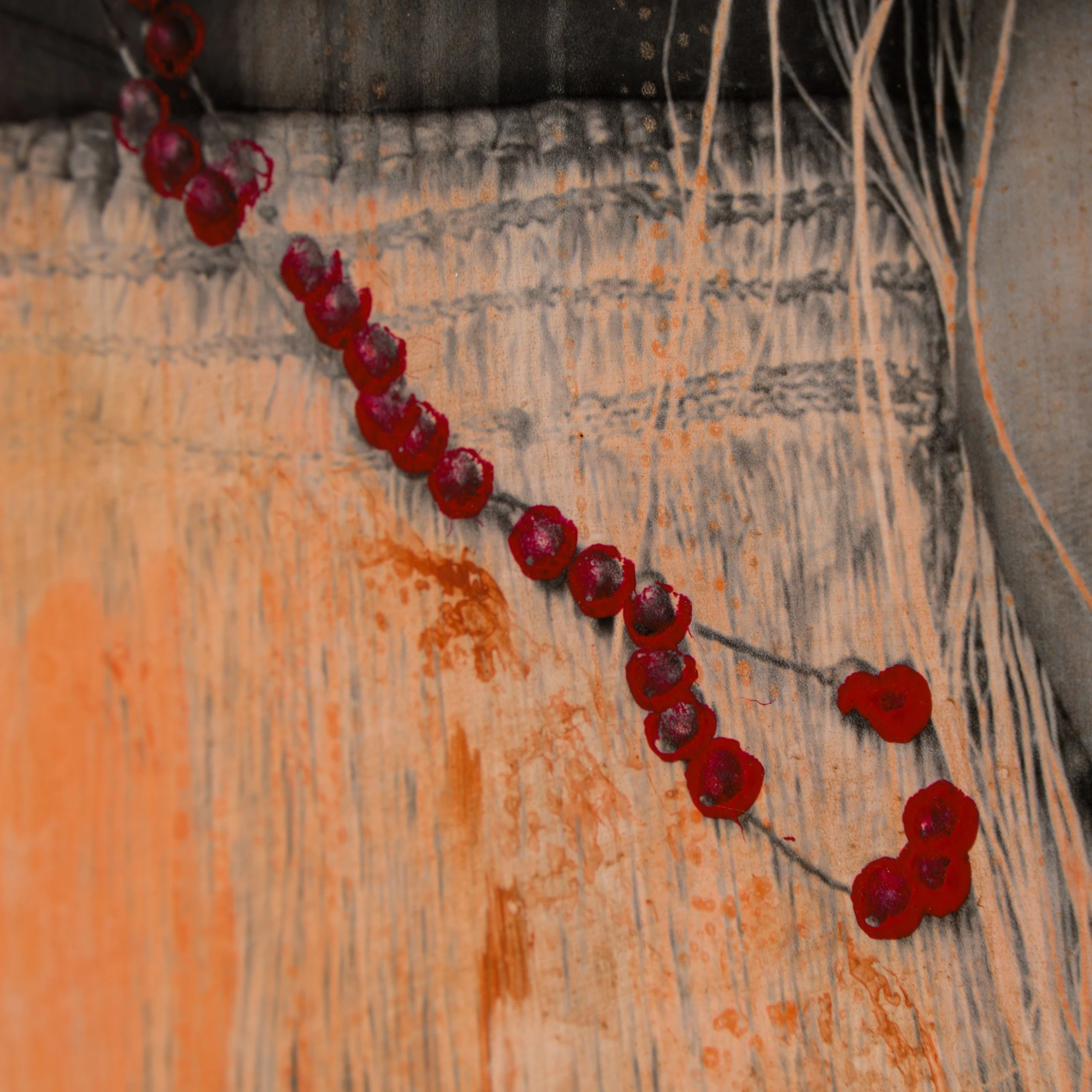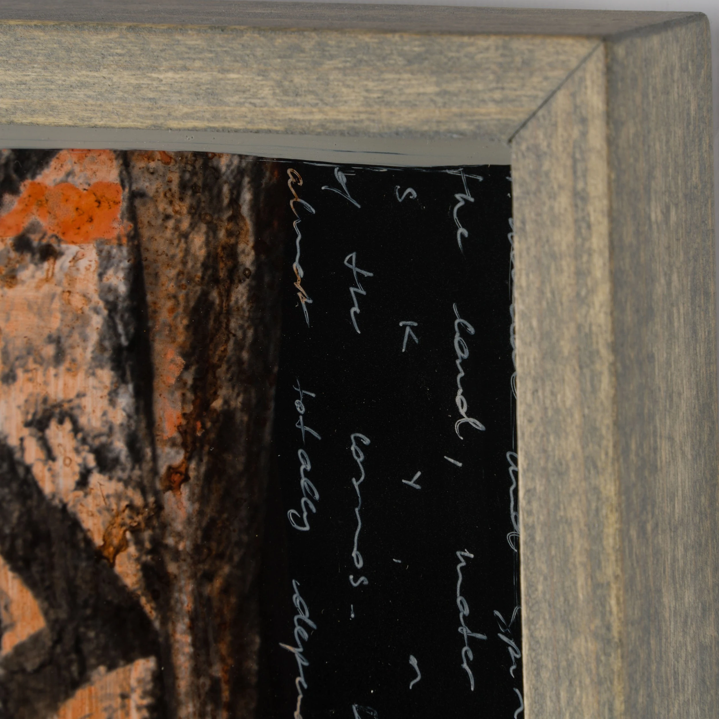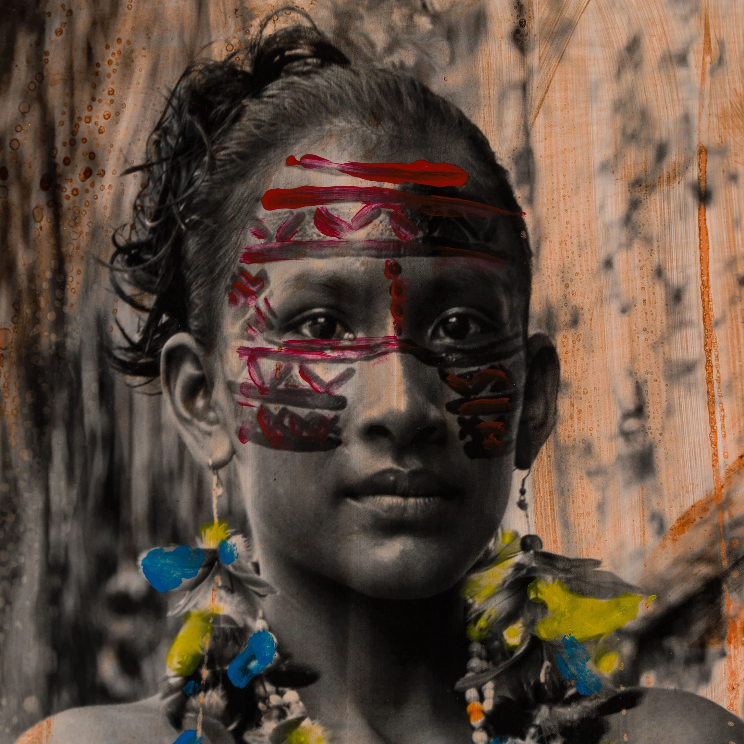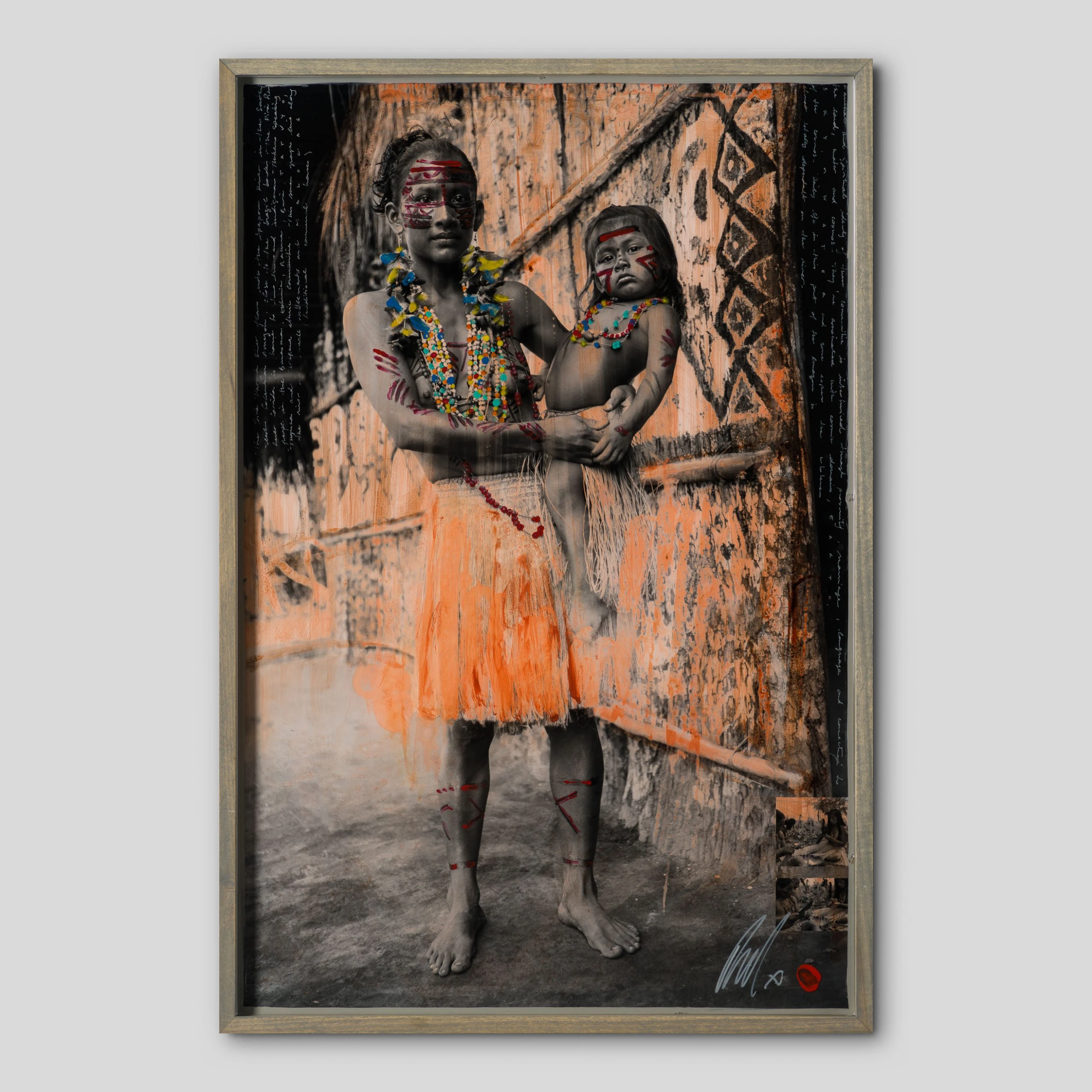 With Moroccan pigments and Vietnamese paints, Mazzucco’s pieces are characterised by the juxtaposition between wildlife and cultural photography, this incredible piece forms part of his introspective collection Grass Roots 2023. “Amor de Mãe (Mothers Love)” features photography mainly in sepia earthy tones, enhancing the raw beauty of the images. The piece tells a story in layers. The overlaying of photography, paint, handwriting, and resin adds life into the composition, creating a statement original. The pops of orange added sporadically throughout the composition create the spontaneous dynamic that this wildlife piece represents. The use of different images sizes and its repetition create the intrinsic depth, characteristic of Mazzucco’s originals.