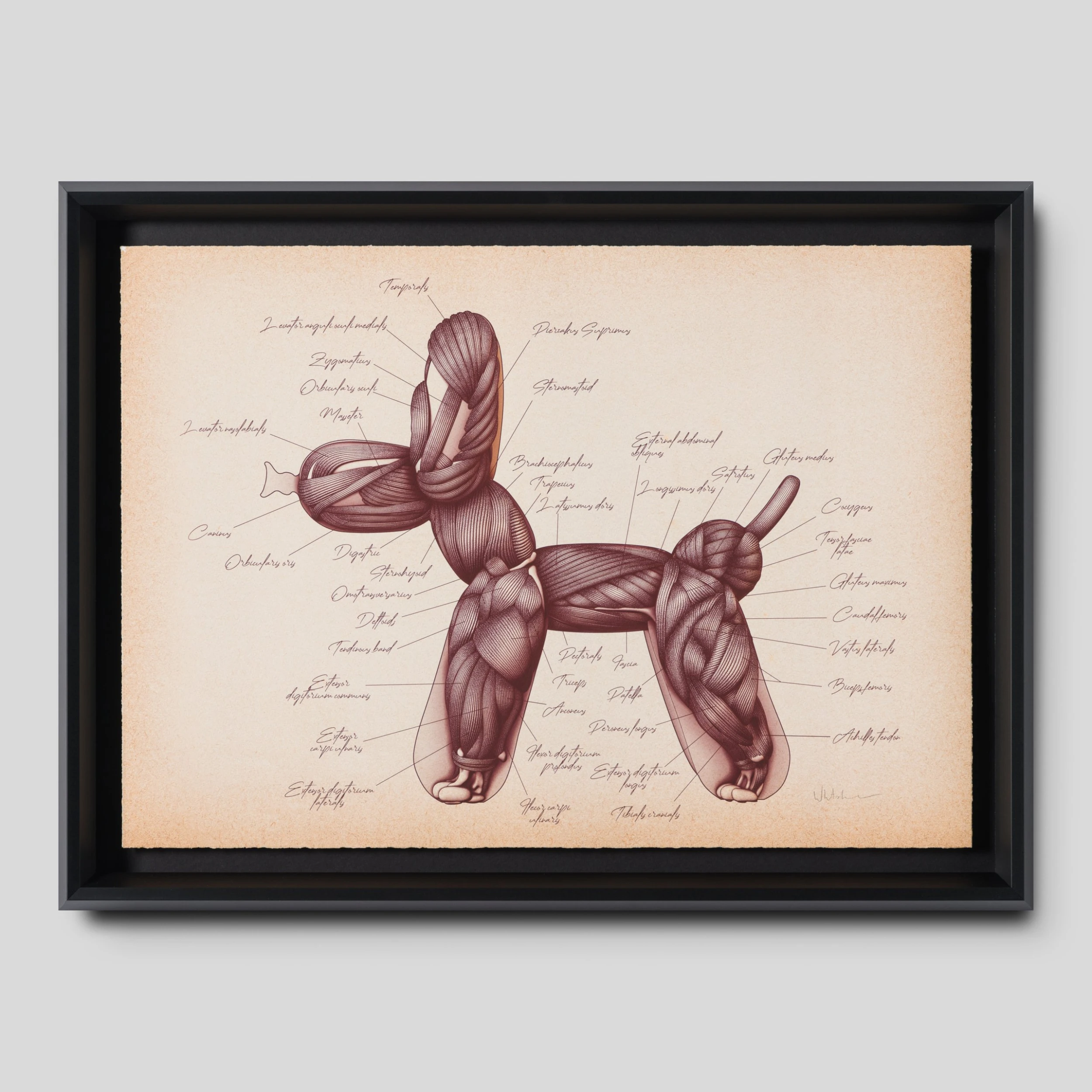 From the marvellous mind of elusive artist Whatshisname, we see the the insides of one of his famous balloon dog sculptures! Portrayed in an antique style, we also see amusing annotations and medical illustration that harness the modern satire of his contemporary pop pieces.