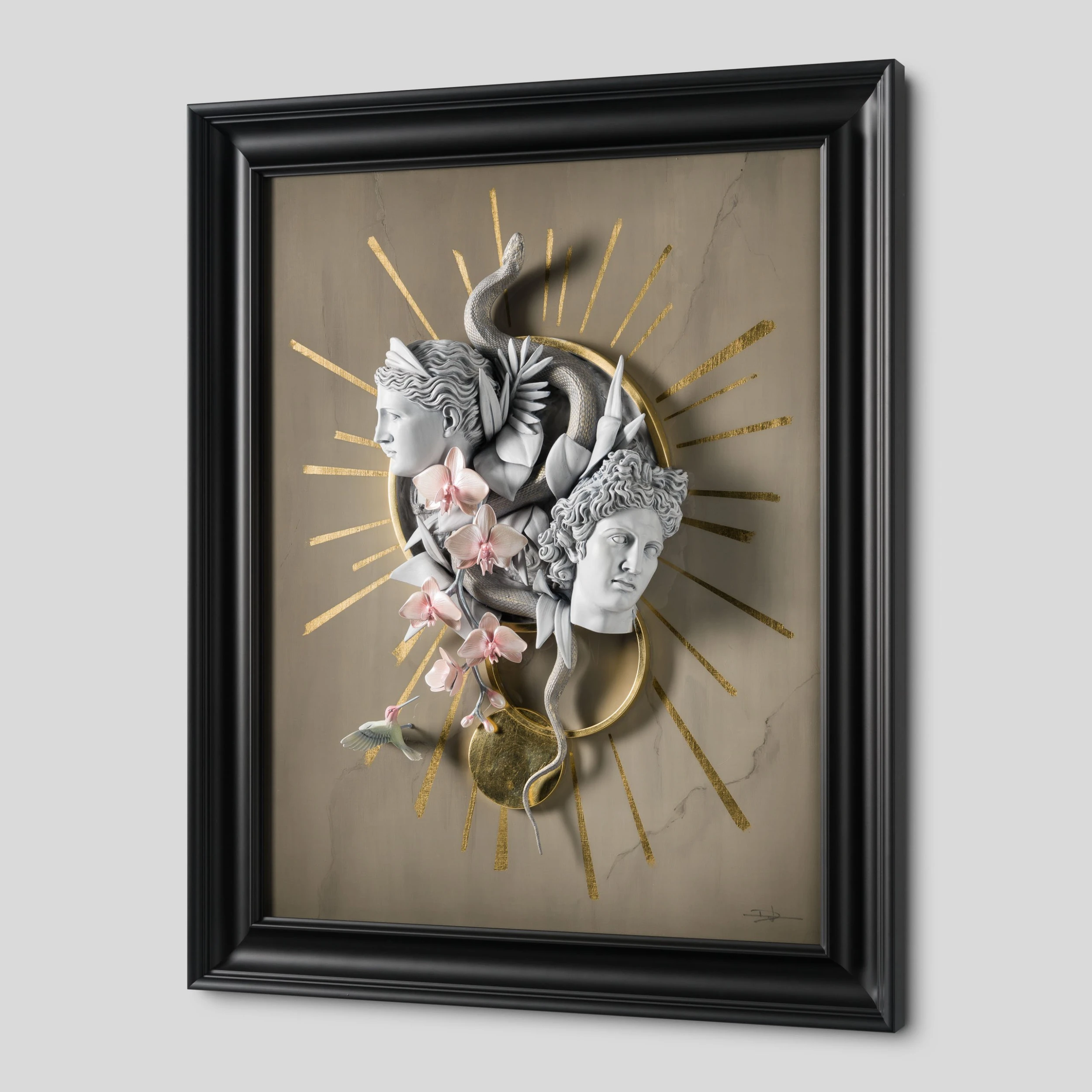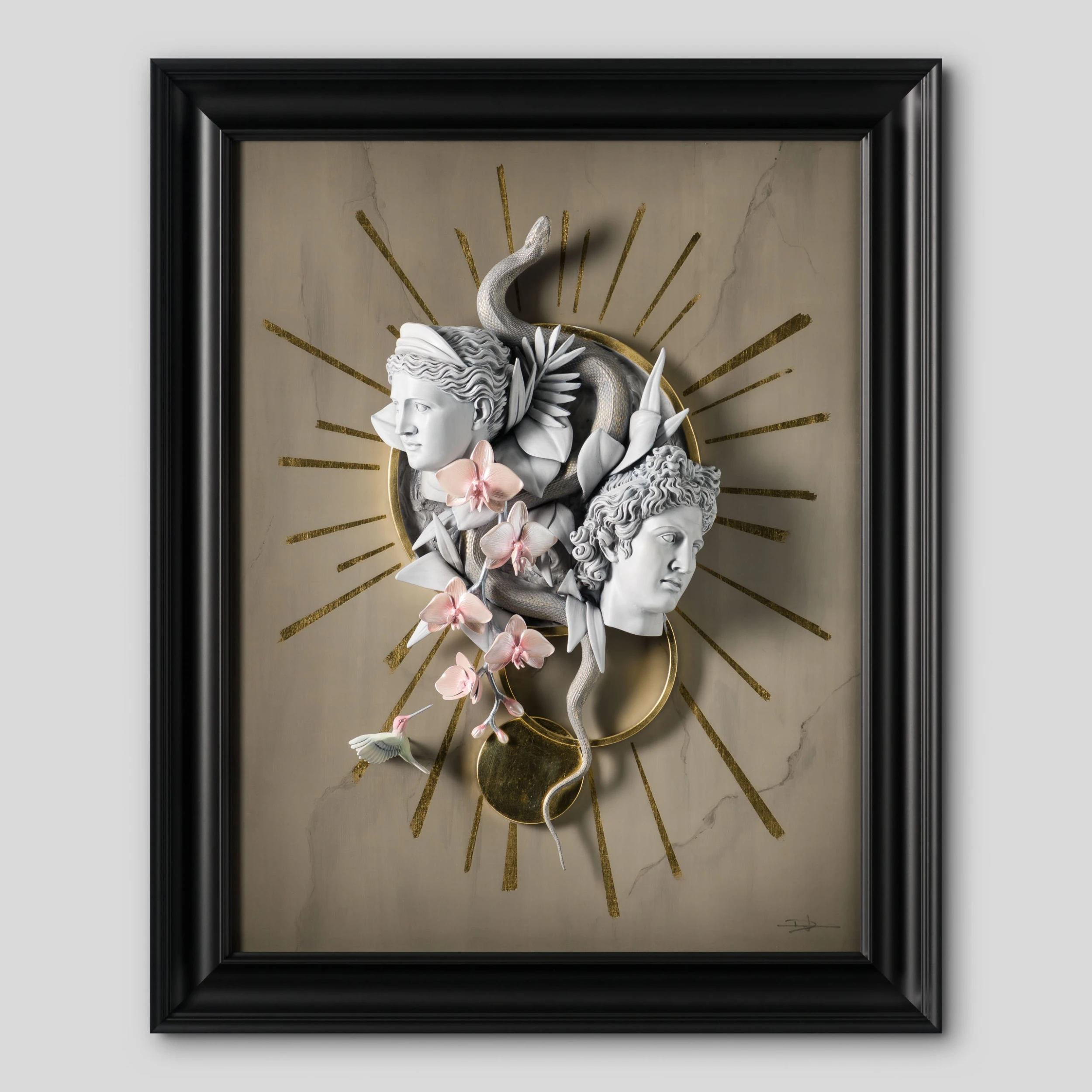 The wall sculpture resembles the portraits of some of the most classical works from Baroque and Renaissance masters whilst featuring the artist most popular symbols – the flowers, the hummingbird and the gold elements.