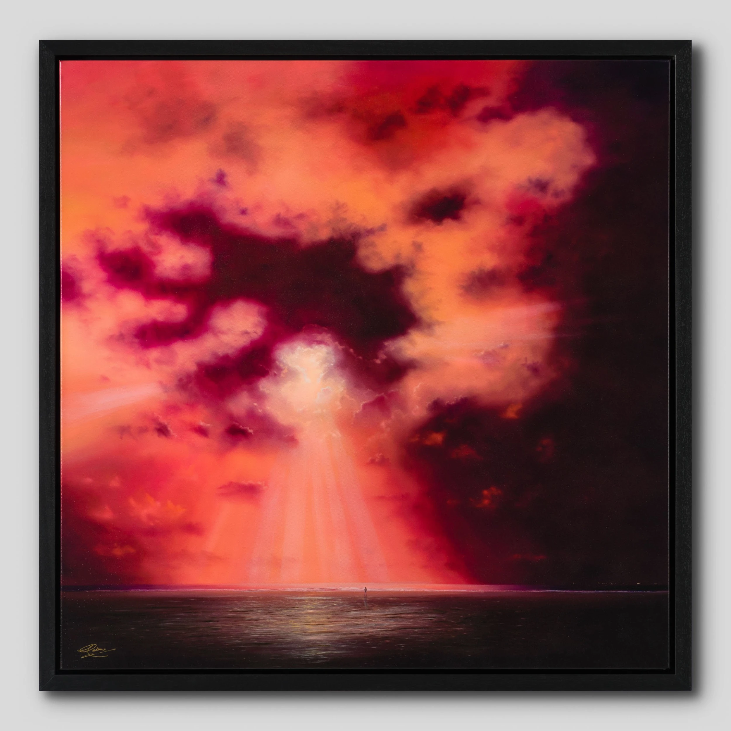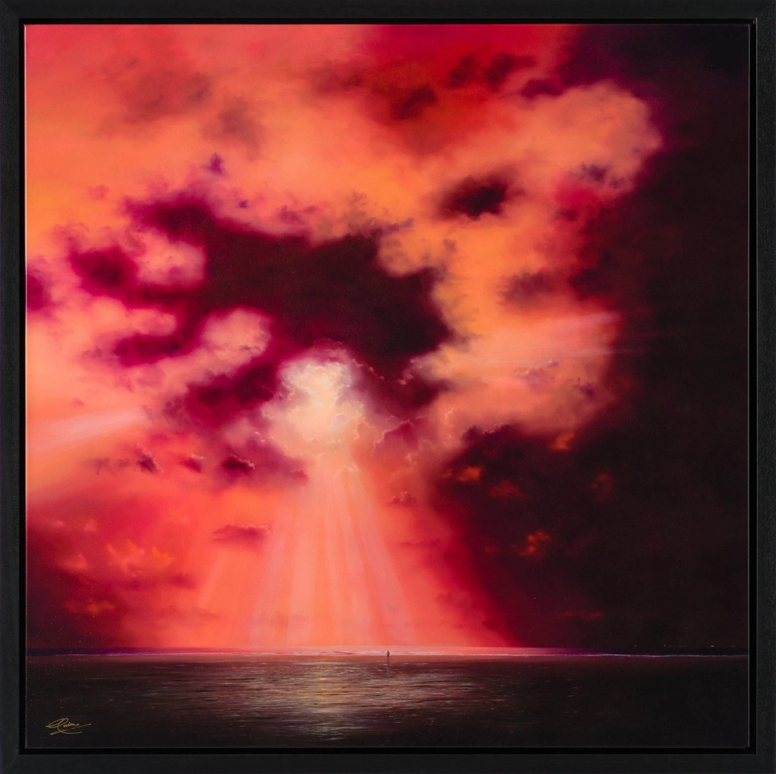 In “One Man Show”, the artist creates a magnificent piece where the main focal narrative is the beam of light, with the light peering through the soft coloured clouds to the beams of light on the shoreline, this artwork has an ethereal surreal feeling to it. With the title phrase and the musical, theatrical feelings it encompasses as inspiration, Coulson created this piece around it. as a conductor of the epic display in front of him, the human figure is witnessing nature as its greatest but in that moment it’s his ‘One Man Show”.