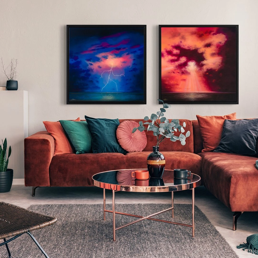 In his , Coulson created two emotionally striking pieces with impactful bold colours. The beauty of coastal scenes is reflected in soft, warm hues and bold patterns, representing self-reflection and inspiration as the main subjects. Lawrence’s paintings fuse the serenity and drama of landscape art. His majestic backdrops inspire a meditative mood, allowing the viewer to escape into the idealised scenery. With focal points of light beams and cracks of lightning, the perfect ethereal and dreamlike atmosphere is created for you to get lost in.