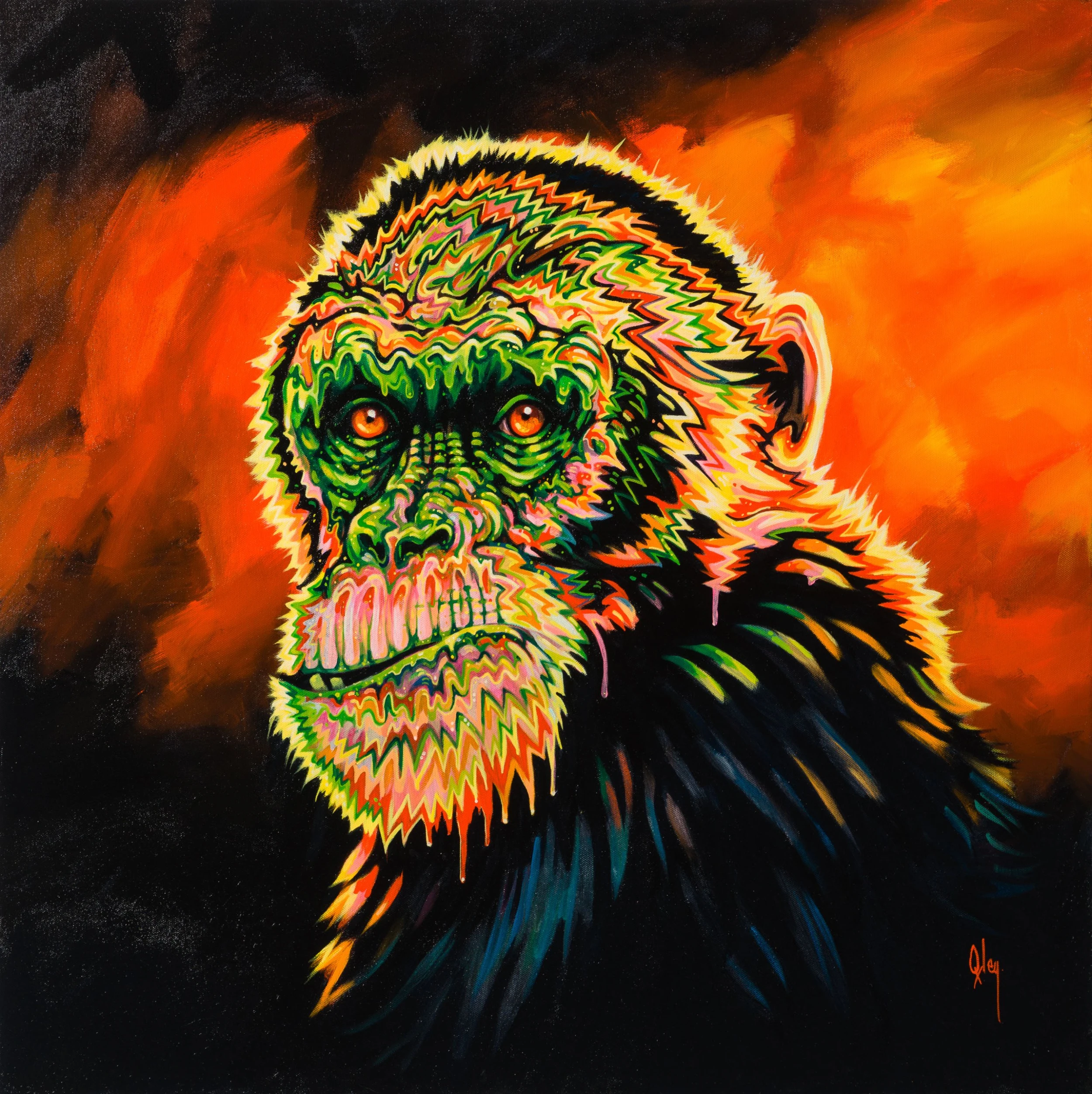 Many of Oxley’s pieces skilfully blend elements of surrealism and expressionism, infusing each piece with energy and emotion. His expressive brushwork is energetic and fluid, giving his paintings a sense of movement and spontaneity as his captivating portraits feature wild animals created through intense patterns and psychedelic colour. The traditional colours of the animal are overthrown by exciting vibrant shades, transforming it into an “ethereal, astral” being through his kaleidoscopic use of colour and form. The strong rainbow shades contrast beautifully with the white background.