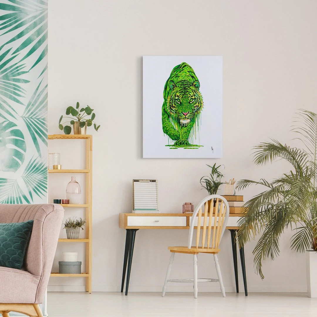 This loose style adds to the emotional impact of his artwork, giving life and movement to the tiger in a stalking pose, while contrasting with the fixed stare of the eyes. His ability to capture the essence and character of the animals he paints in unmatched, creating an enchanting visual experience that celebrates the beauty, power, and mystique of the animals we share the planet with.