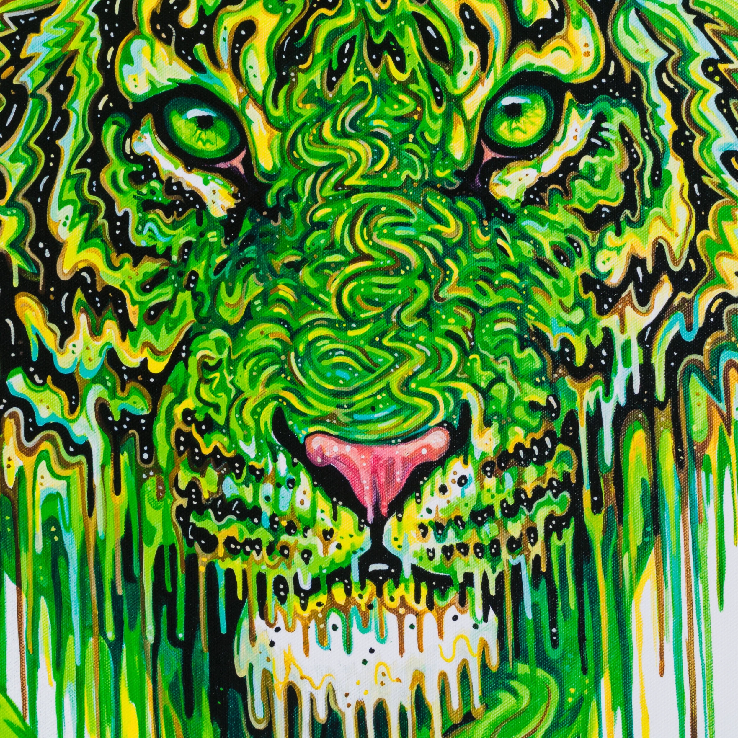Named after the herb basil leaves commonly associated with freshness and nature, in “Basil” the traditional colours of a tiger are overthrown by exciting shades green, transforming the animal into an “ethereal, astral” being through his kaleidoscopic use of colour and form. Many of Oxley’s pieces skilfully blend elements of surrealism and expressionism, infusing each piece with energy and emotion. His expressive brushwork is energetic and fluid, giving his paintings a sense of movement and spontaneity as his captivating portraits feature wild animals created through intense patterns and psychedelic colour.