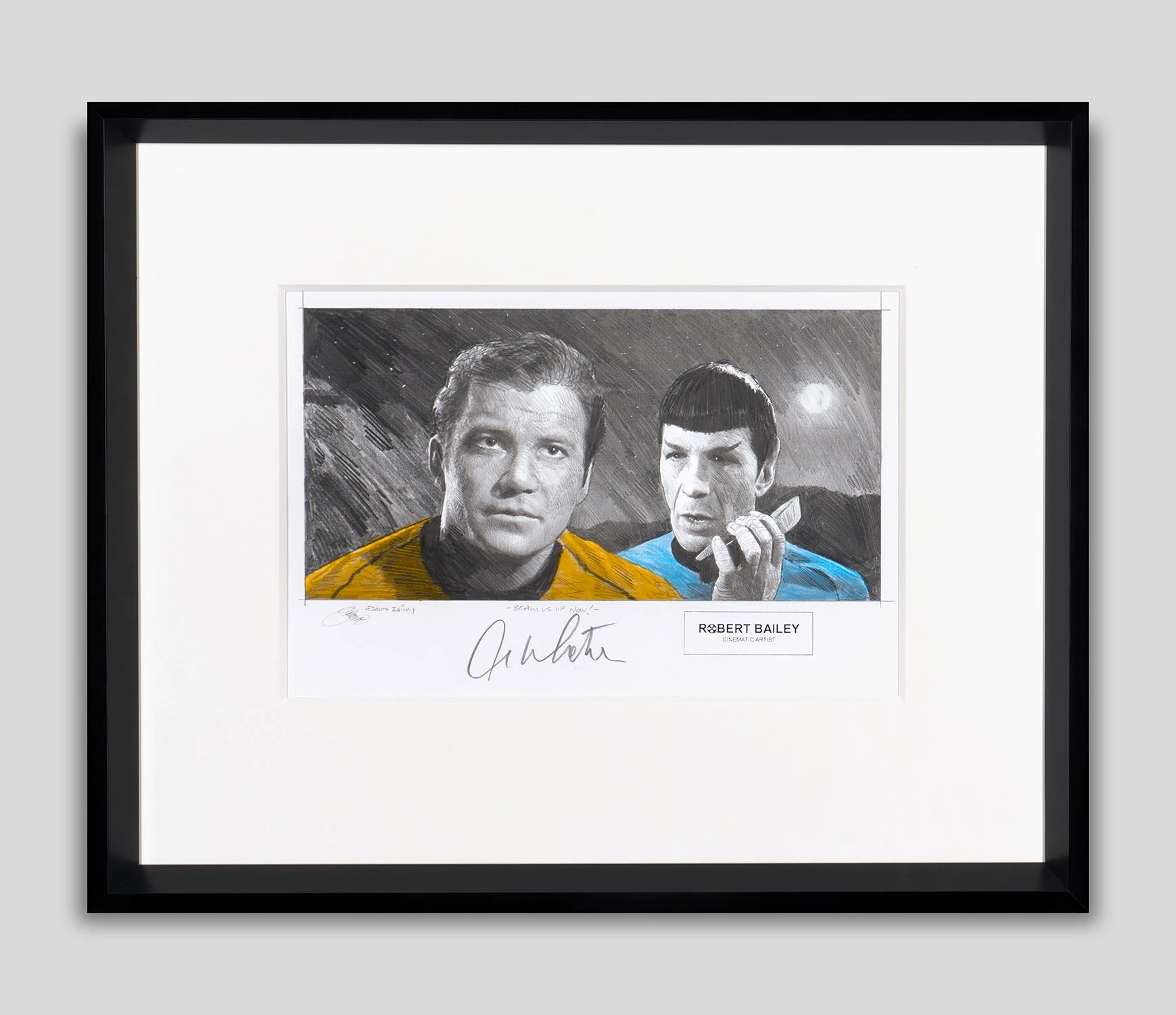 With bright pops of yellow and blue accentuating the different tones of delicate graphite, this otherworldly original drawing by Robert Bailey perfectly captures the iconic characters and retro quality of Star Trek: The Original Series.