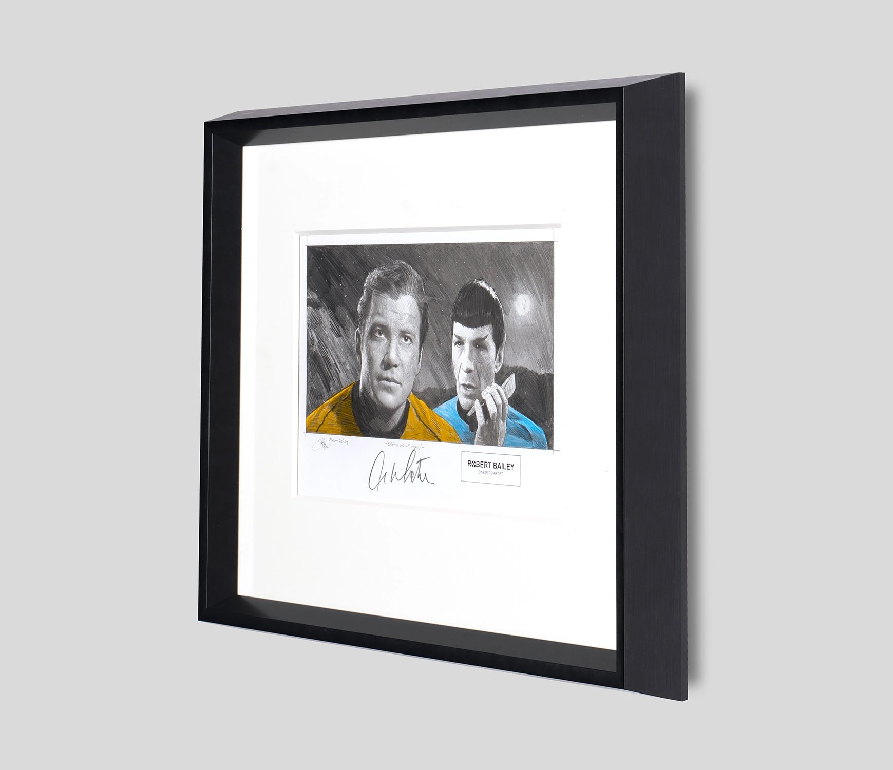 Hand-signed by William Shatner himself, who has since been into real space, this original artwork by Robert Bailey will add a touch of space-age magic into your home through a bold and bright colour palette and bespoke black wooden frame. View our full Robert Bailey portfolio .