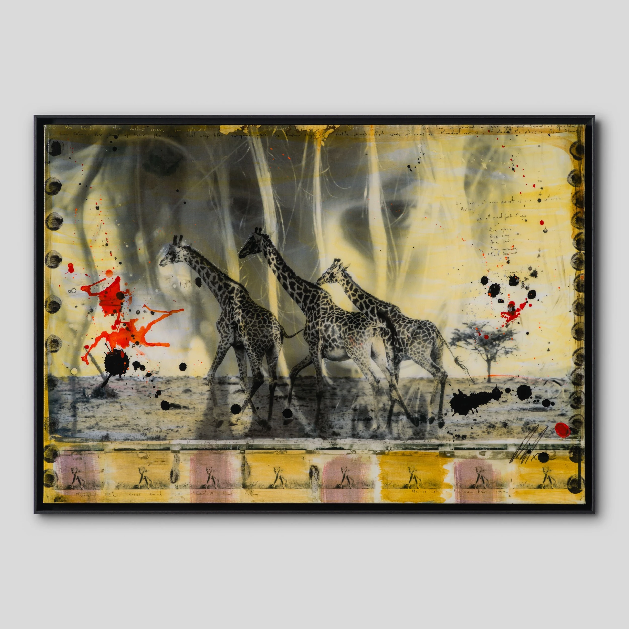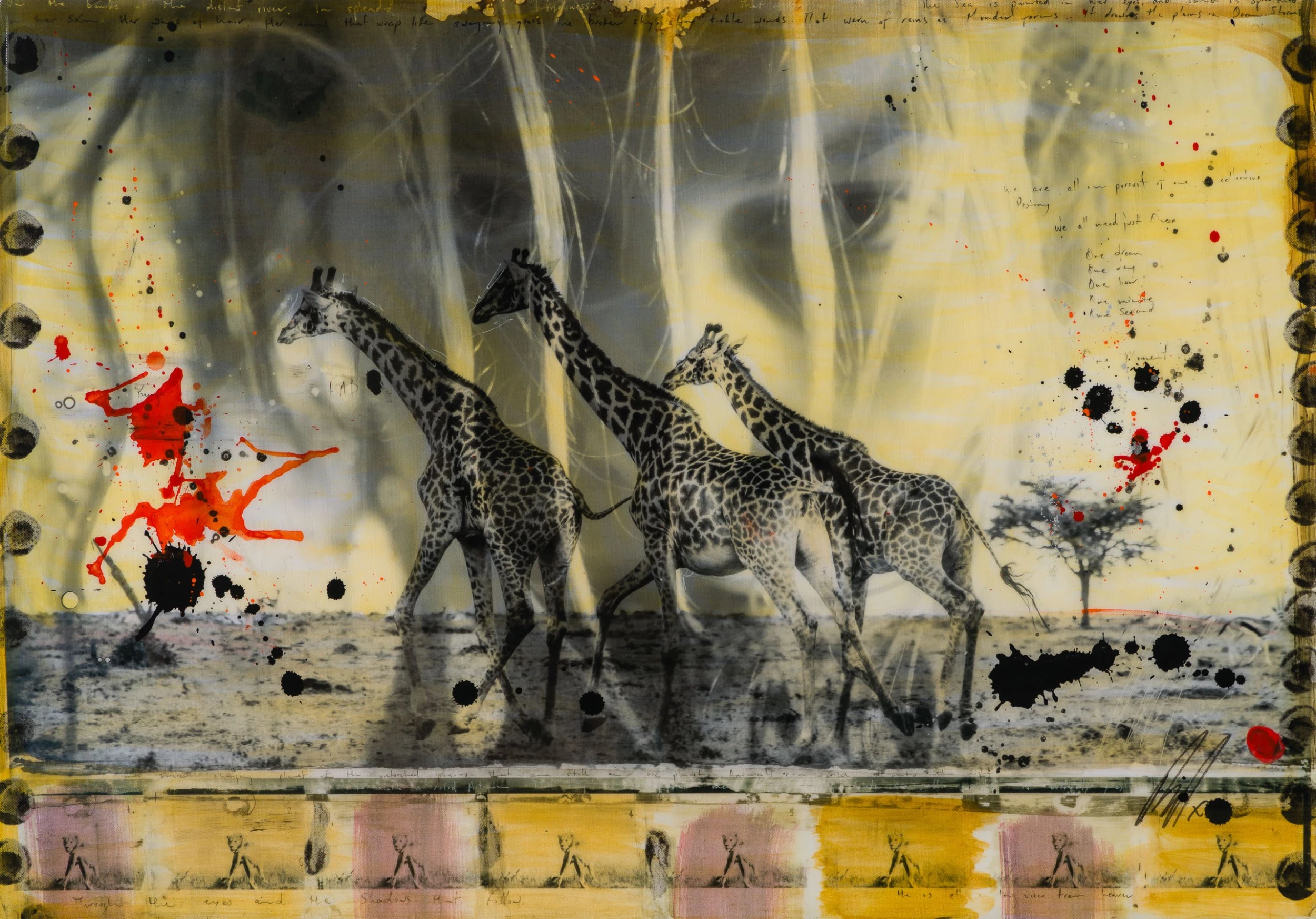 Mazzucco’s visual narrative captures the human form against a backdrop of startling landscapes that span the continents, from Icelandic glaciers to African and Brazilian wildlife. By layering paint, photography, resin and hand-lettered text, the globally acclaimed photographer and sell-out takes viewers on a documentary-style journey through geographic and emotional terrains. “Beauty layered with natural elements has always been my recipe. Nothing we create can compare to the perfect beauty of nature.”