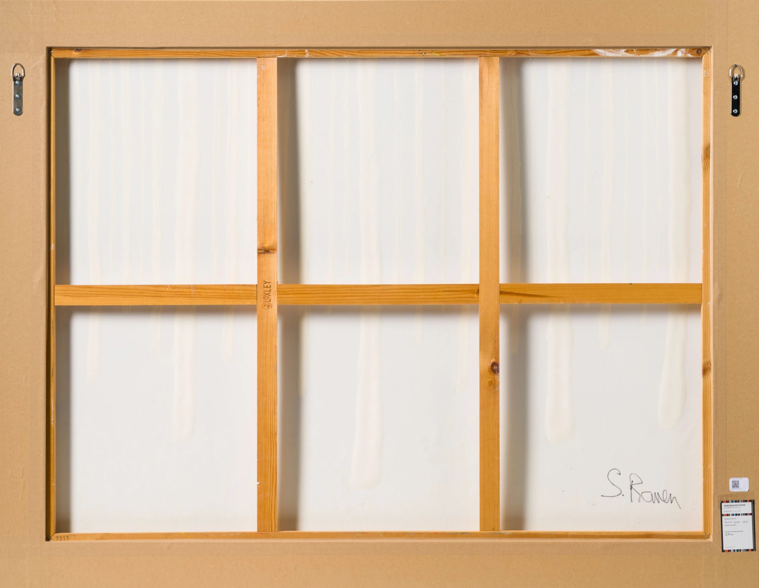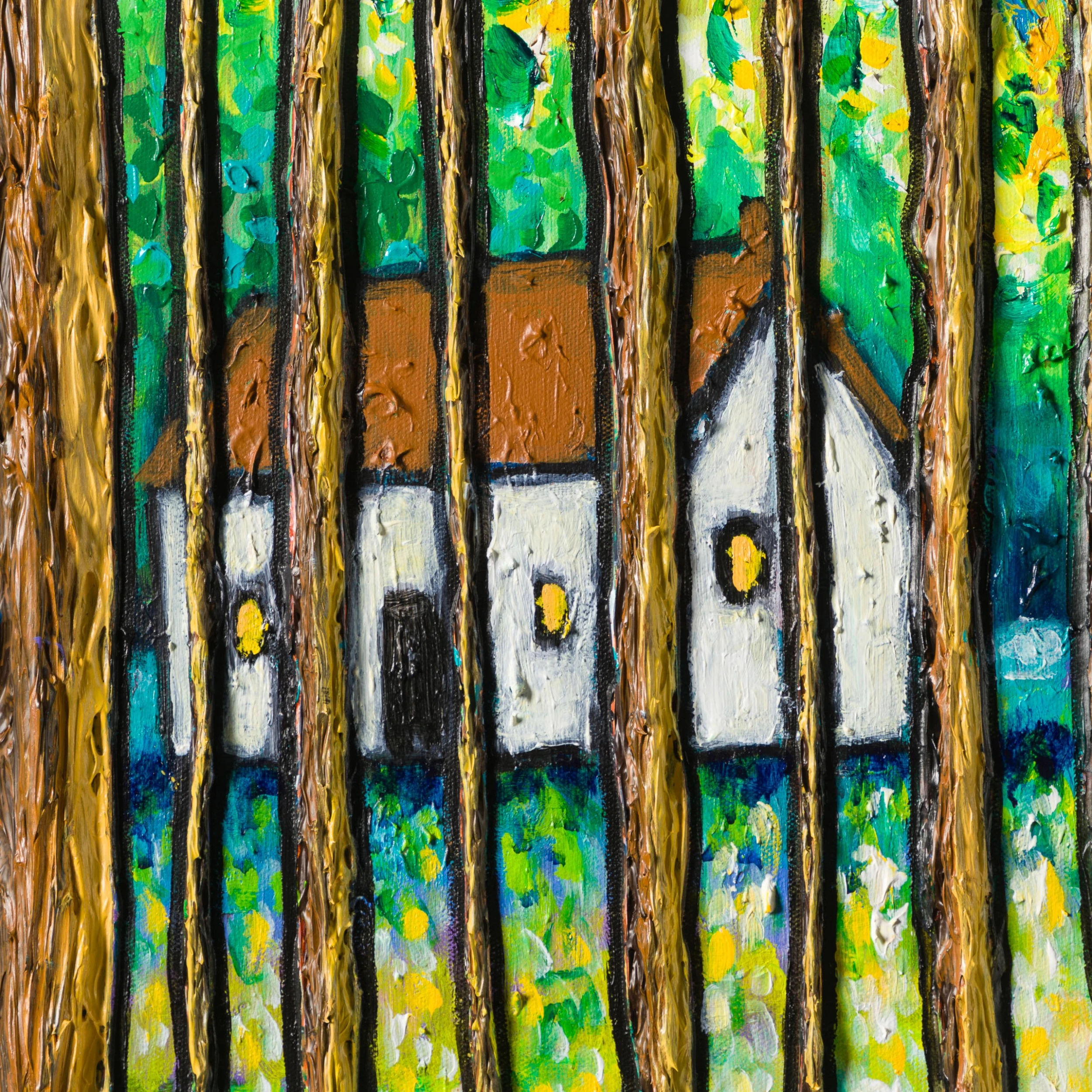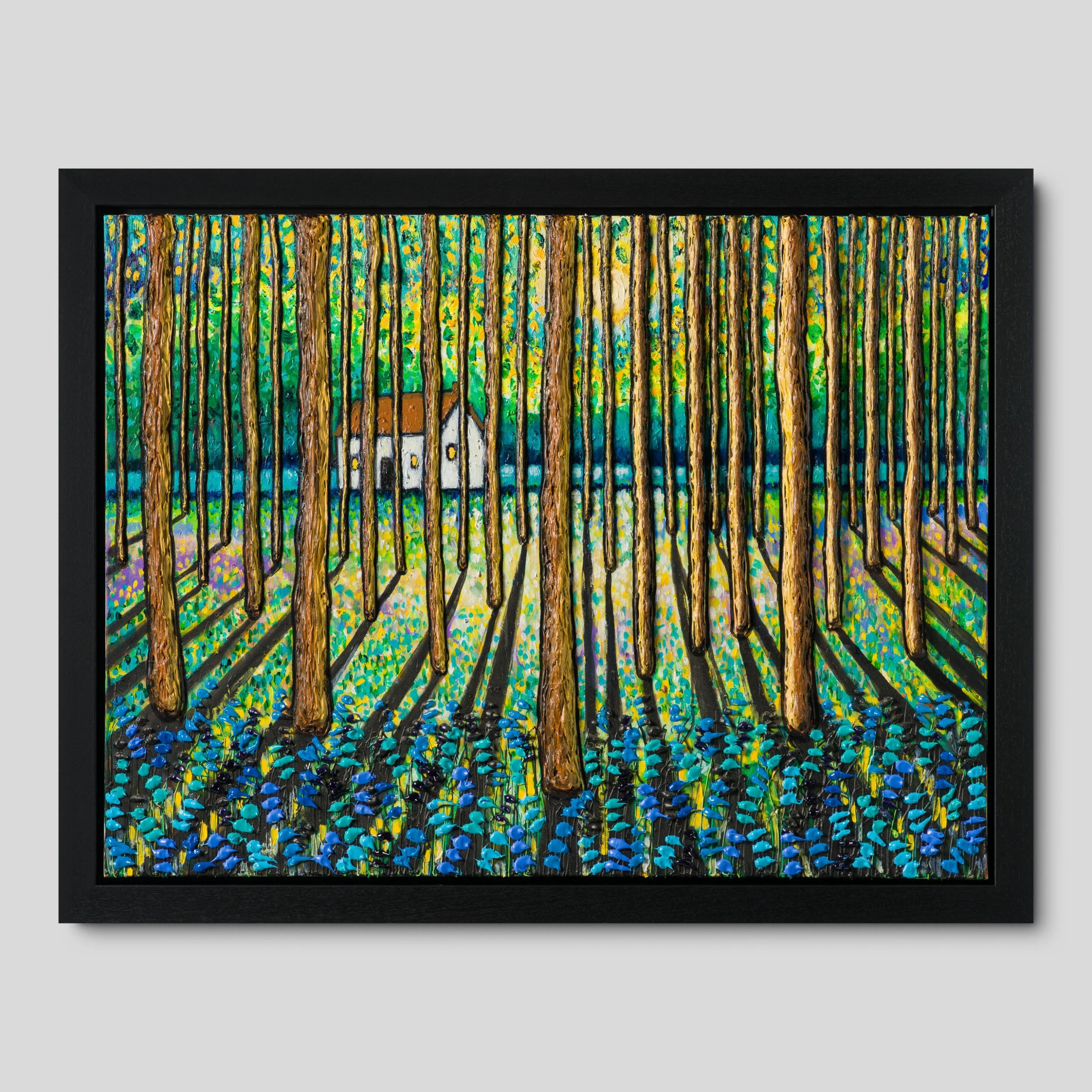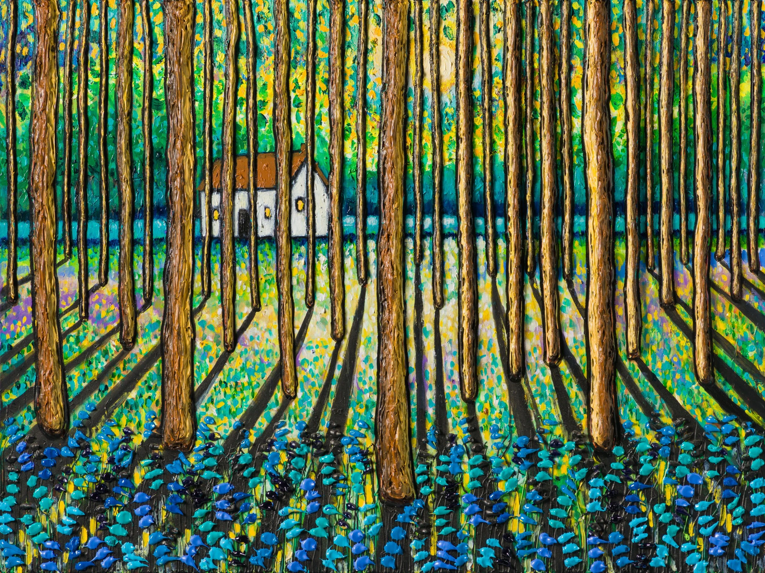 In “Cottage In The Woods”, the artist depicts the countryside with beautiful depth. In-between tree branches, Raven adds a white cottage, an element featured in multiple paintings in this collection. One of her most passionate pieces, this artwork is full of love for natural surroundings with bold and bright colours. Working with oil paints and acrylics, Scarlett adds splatters and daubs of paint to replicate the abundance of textures found outdoors. With stylistic influences from Anselm Kiefer, Gustav Klimt and David Hockney, her emotive works are inspired by her personal connection with nature.