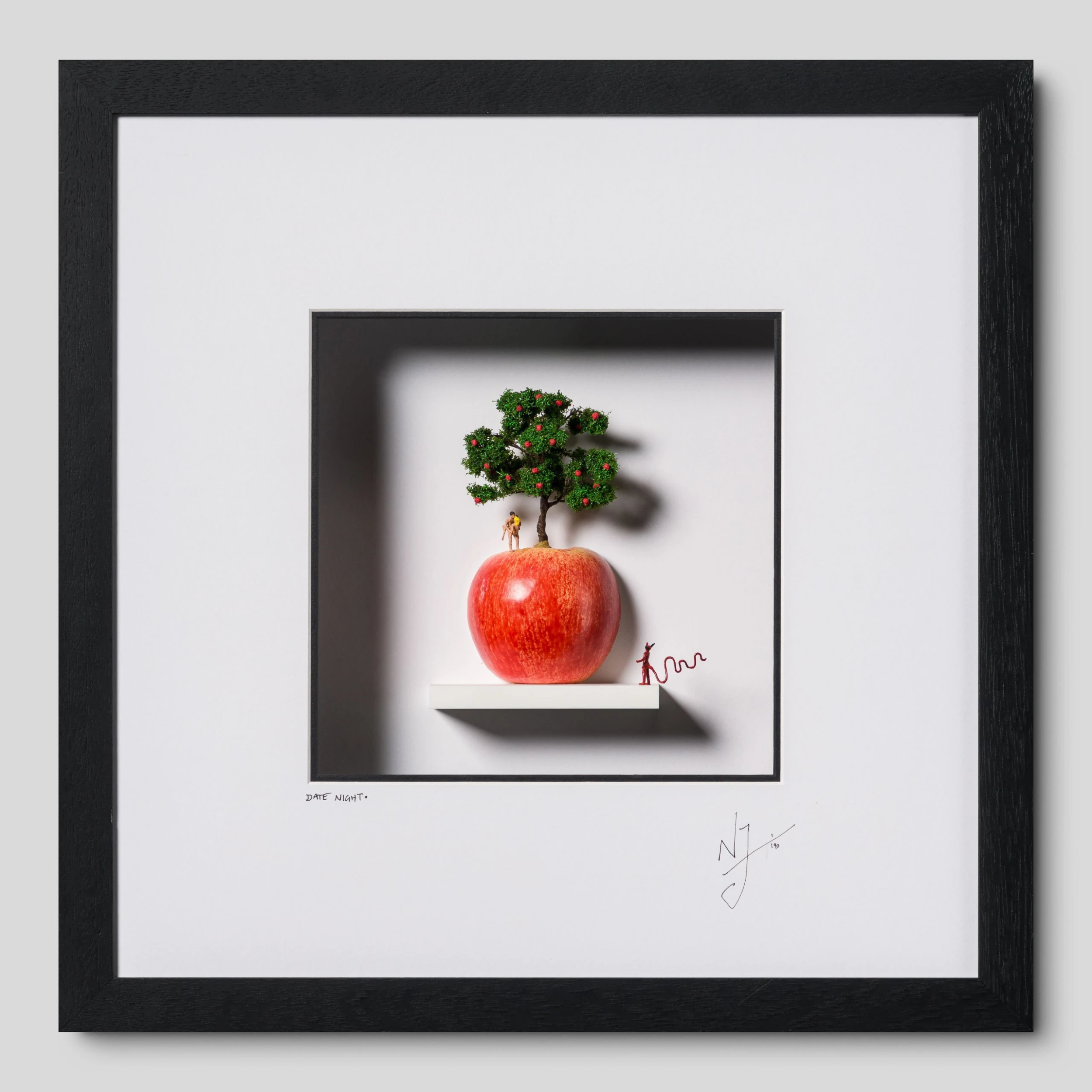 Representative of the Garden of Eden, ‘Date Night’ has a strong, overt religious context. The devil is looking up at two individuals consummating on top of an apple, representing temptation. Whether it’s capturing the essence of a fleeting moment, reimagining historical scenes, or interpreting fictional scenes, Nic’s possesses a unique ability to communicate with subtlety and finesse.
