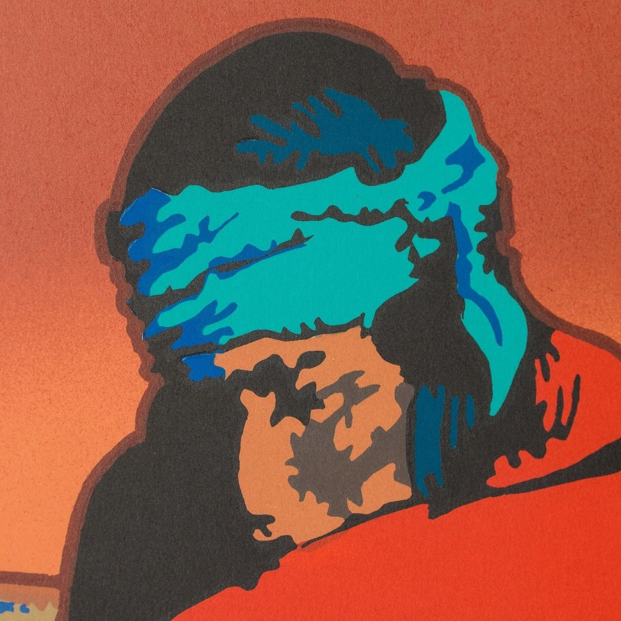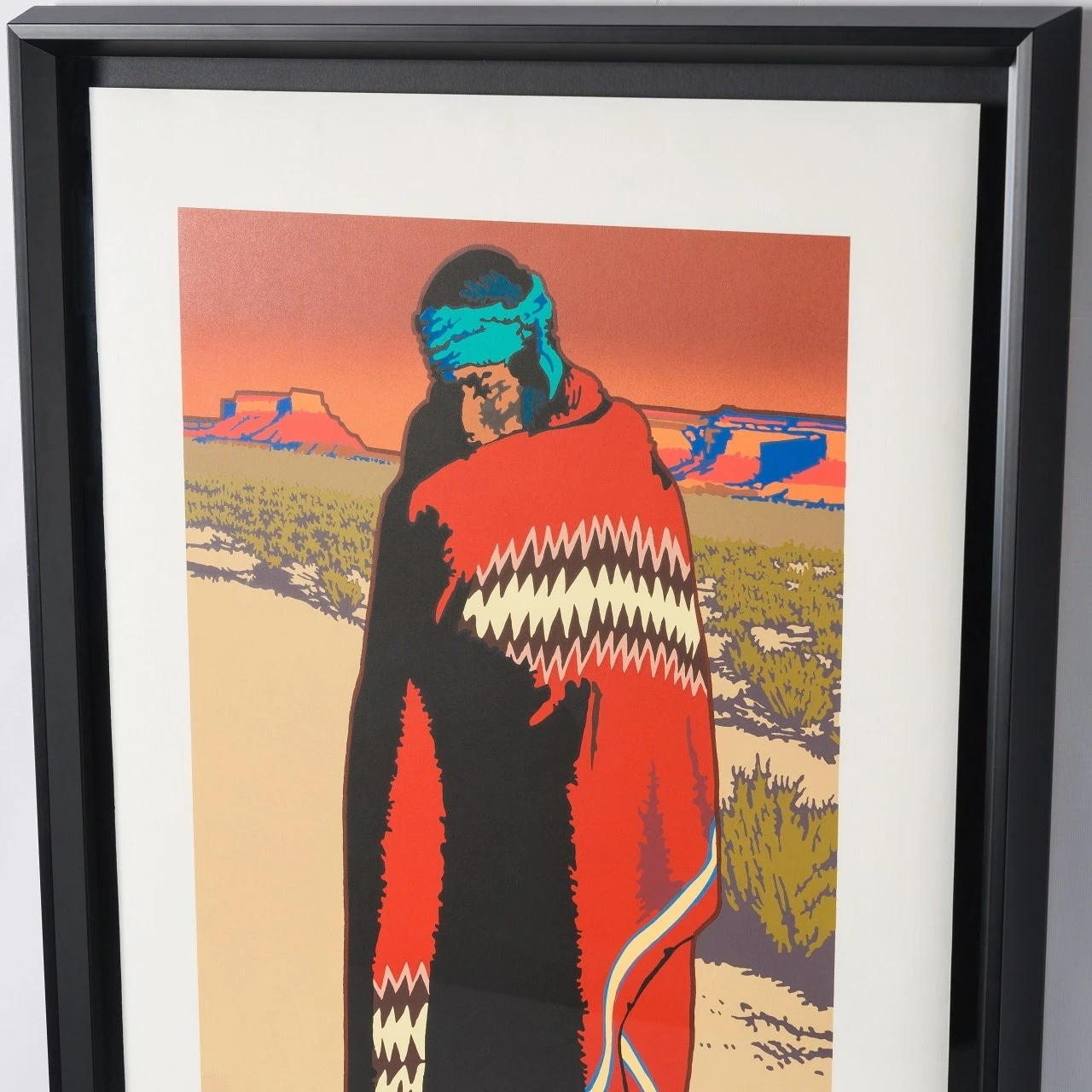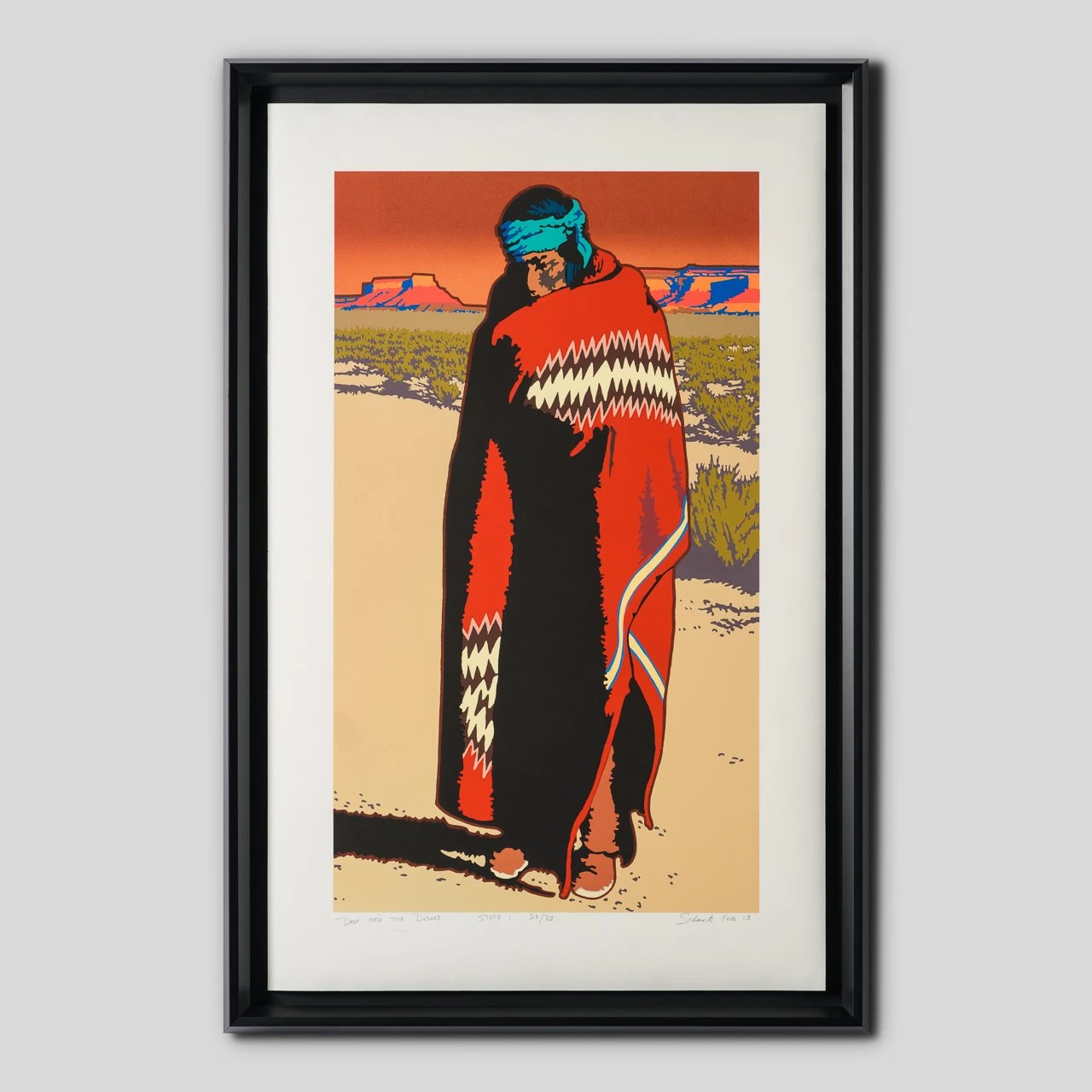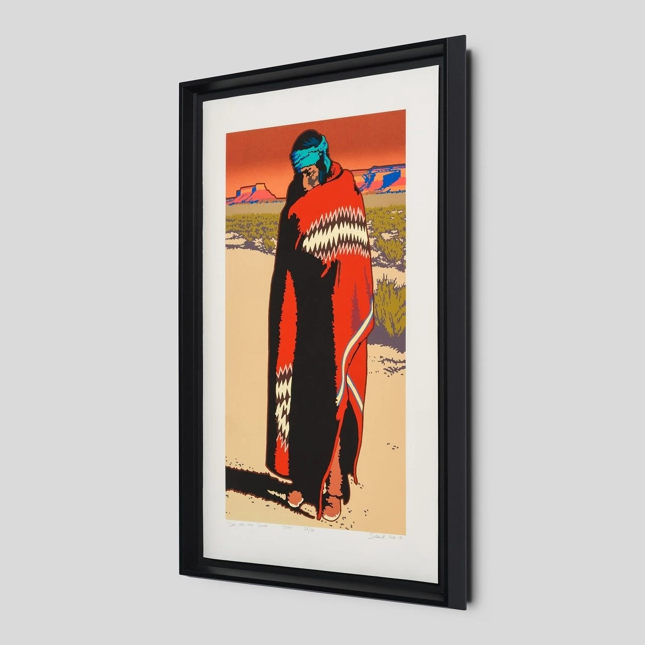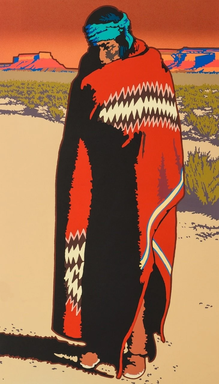 This hand pulled silkscreen is a perfect example of Billy Schenck’s affinity for the pop western genre. This striking artwork features bold contrasting shades of fiery orange and deep red offset by silhouettes associated with the wild west.