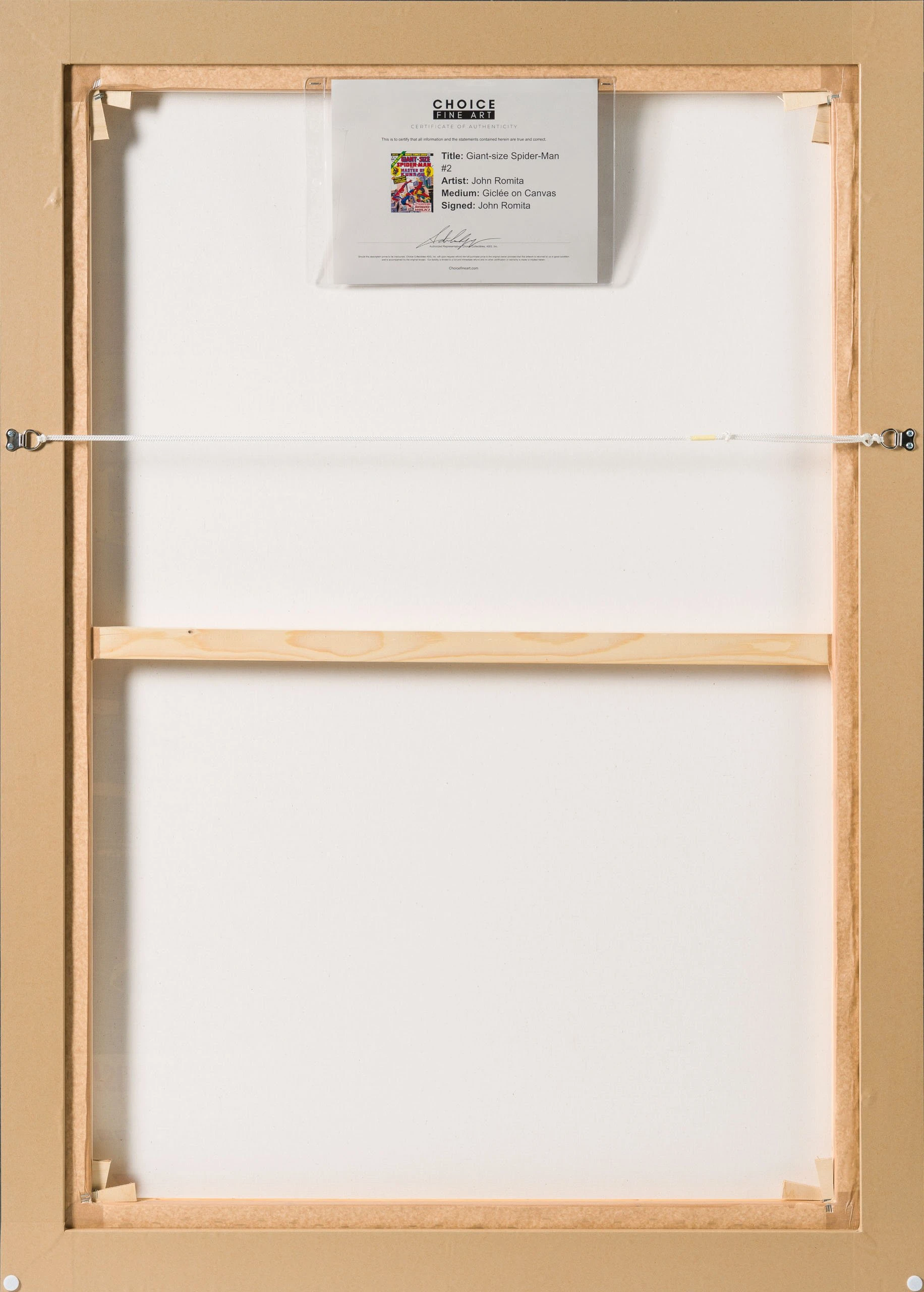 Published in 1974, “Giant-Size Spider-Man #2” is a Marvel Superhero unique edition of the issue’s cover, hand-signed by John Romita Sr. Spider-Man first appeared in Marvel comic books in August 1962, in Amazing Fantasy #15 in the Silver Age of Comic Books.