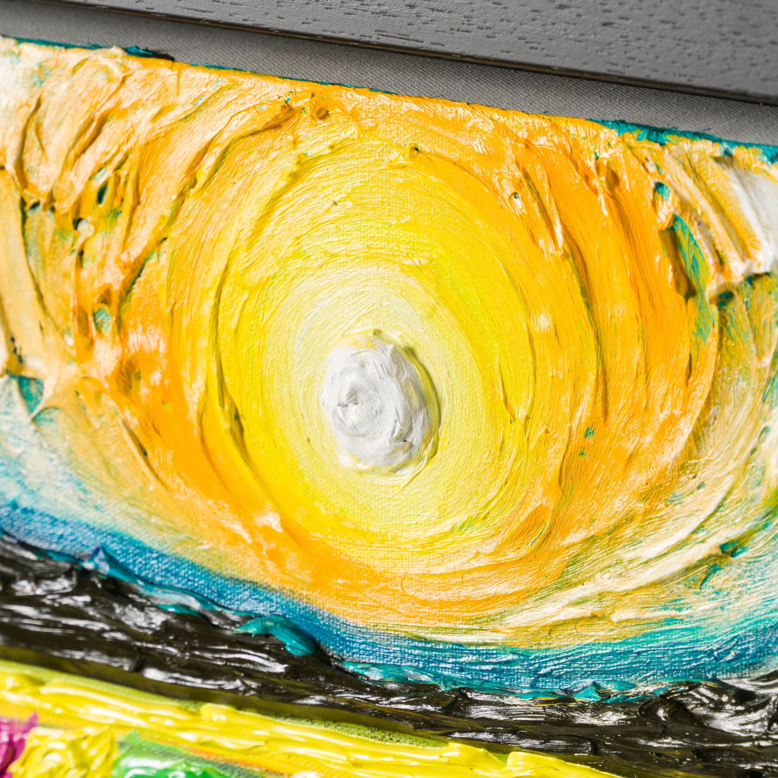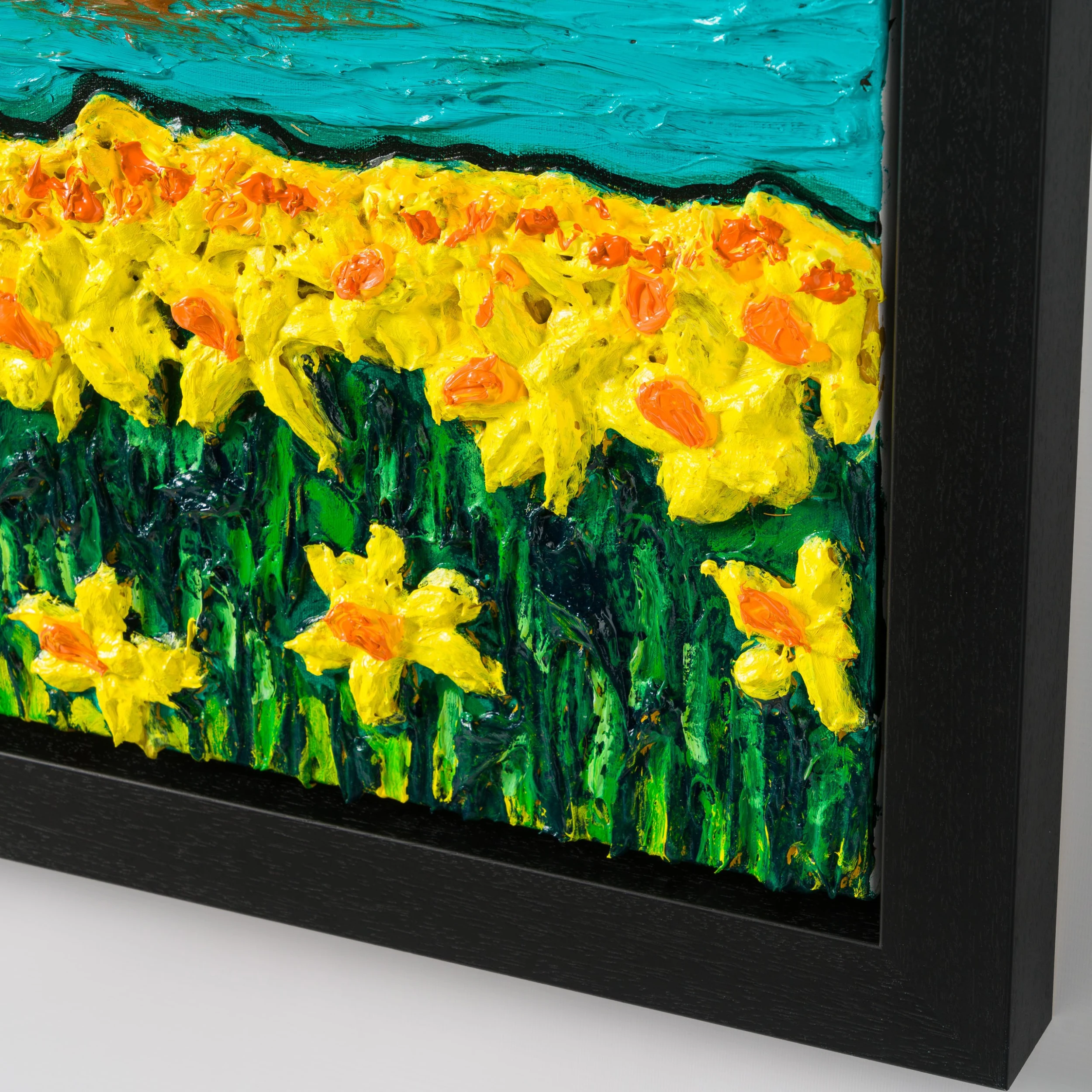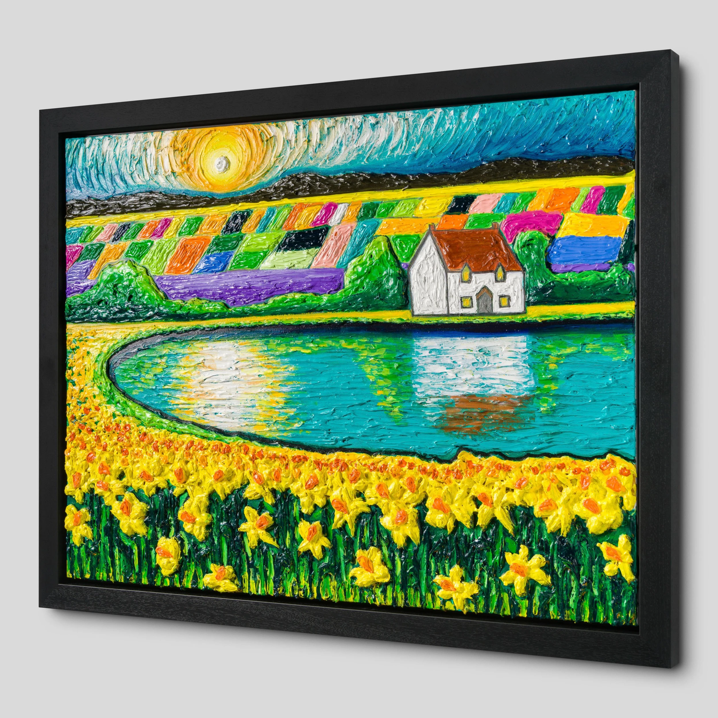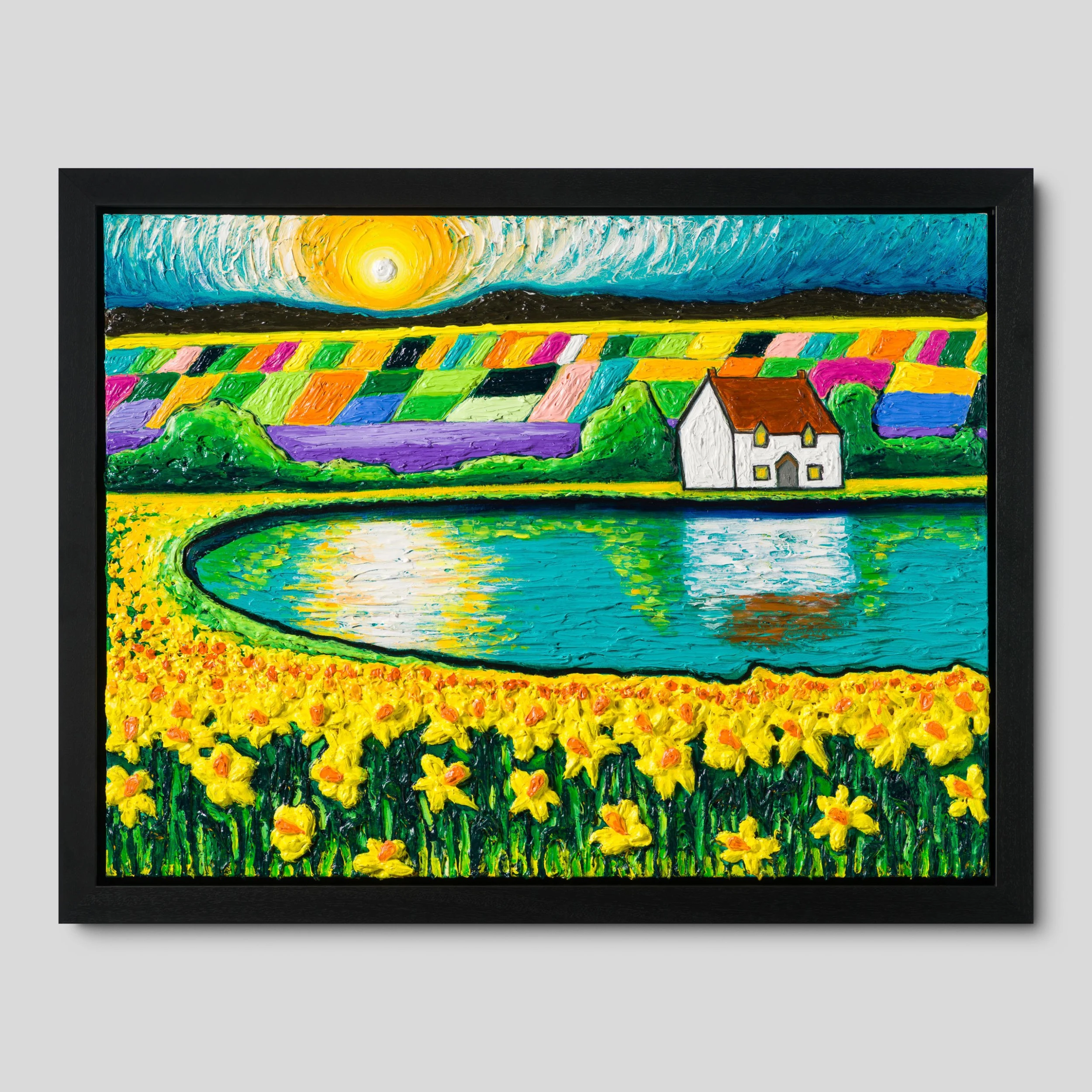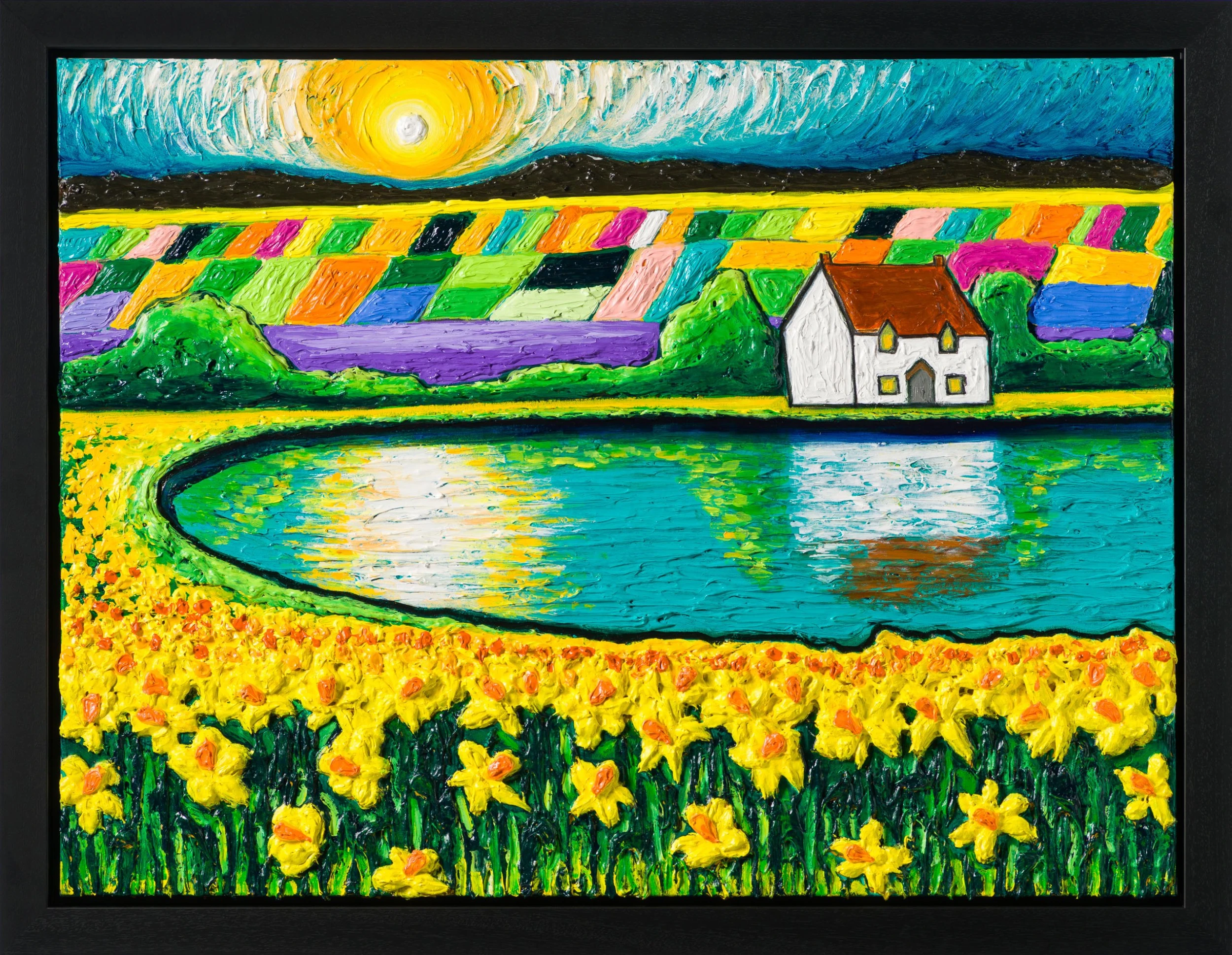 In “House By The Lake”, featuring characteristic and unique elements Raven is known for such as white cottage, the flowers and the colourful fields, the artist deconstructs a countryside landscape. The cottage’s reflection on the lake surrounded by bright yellow flowers adds a new dimension and movement to the textured original. The artist’s unique portrayal of the sky in circular textured brush strokes adds a beautiful depth to the piece. Similar to Van Gogh’s skies, Raven’s skies are fluid expressing the emotion behind the swirls.