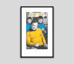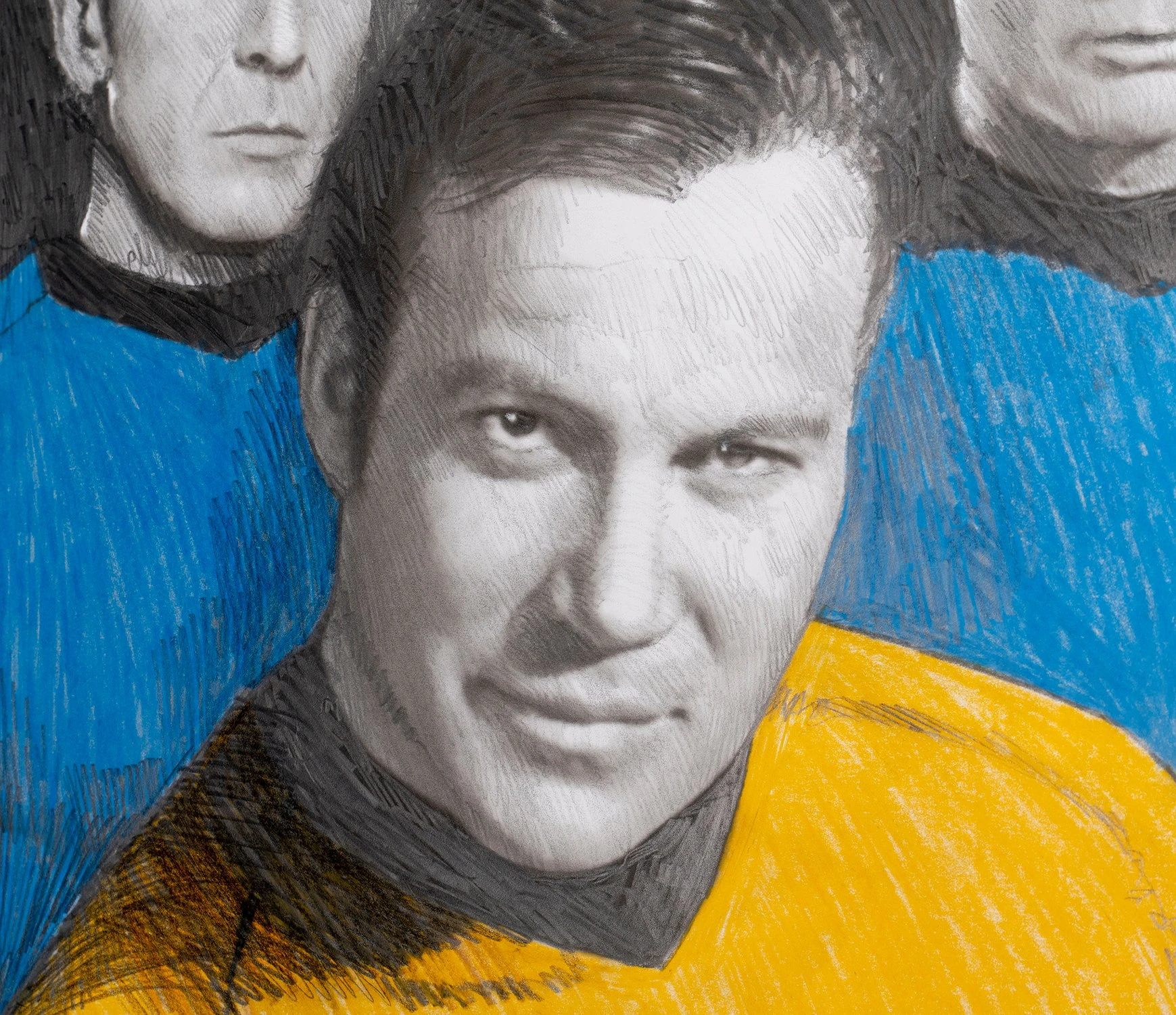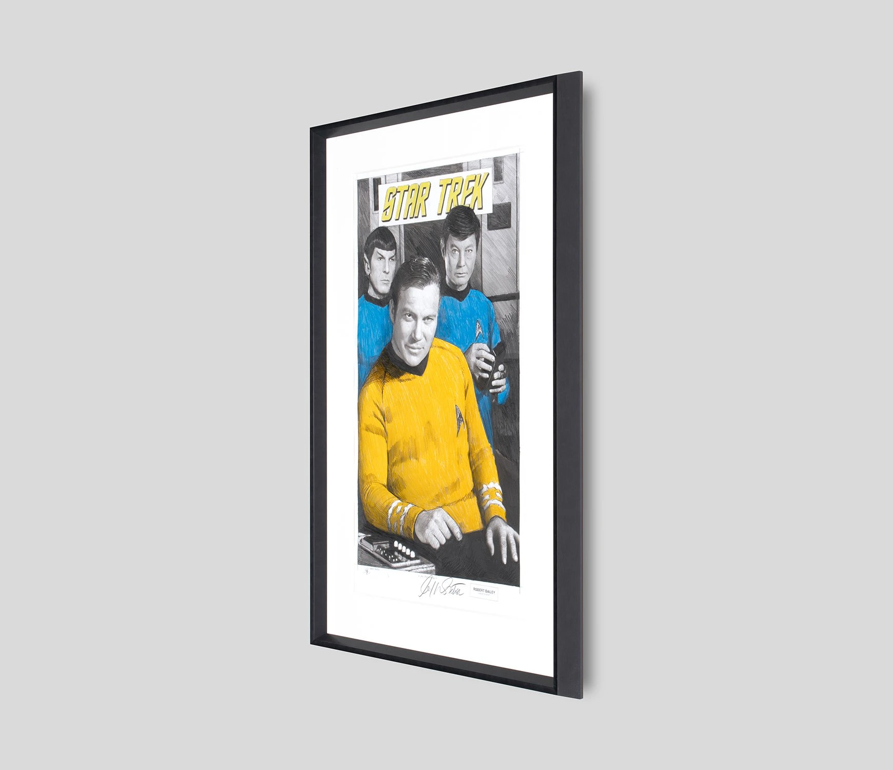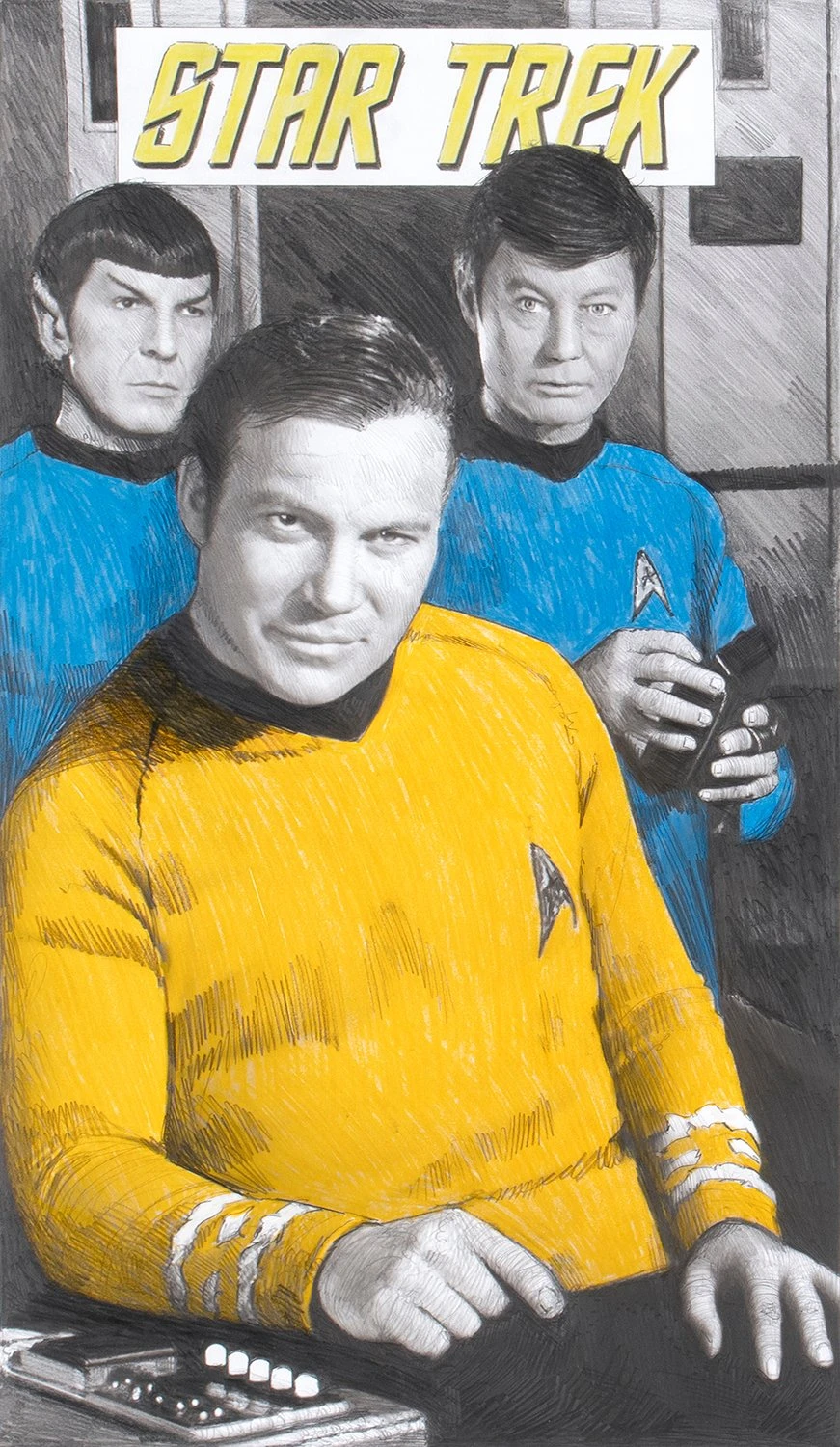 With bright pops of yellow and blue accentuating the different tones of delicate graphite, this otherworldly original drawing by Robert Bailey perfectly captures the iconic characters and retro quality of Star Trek: The Original Series.