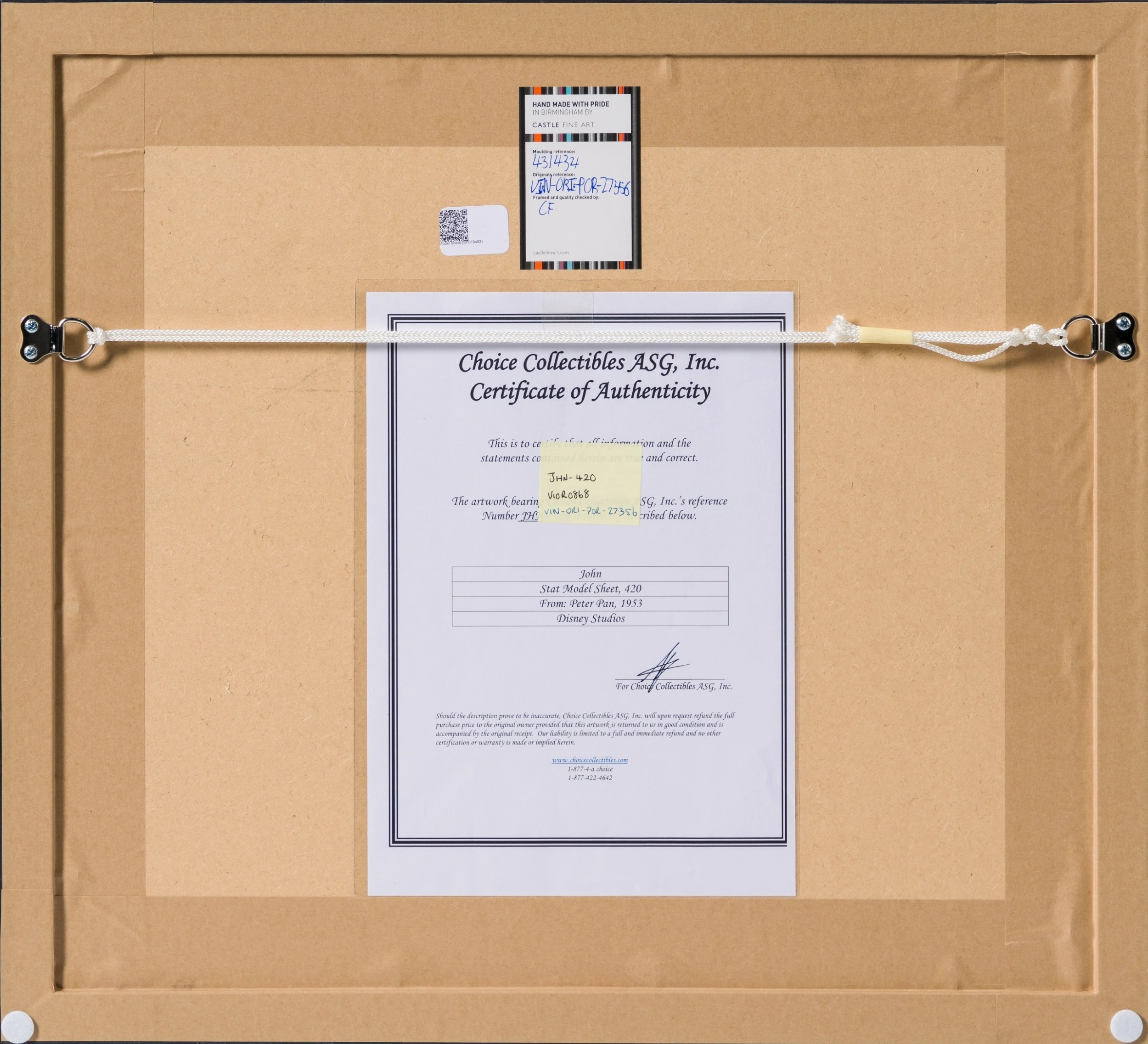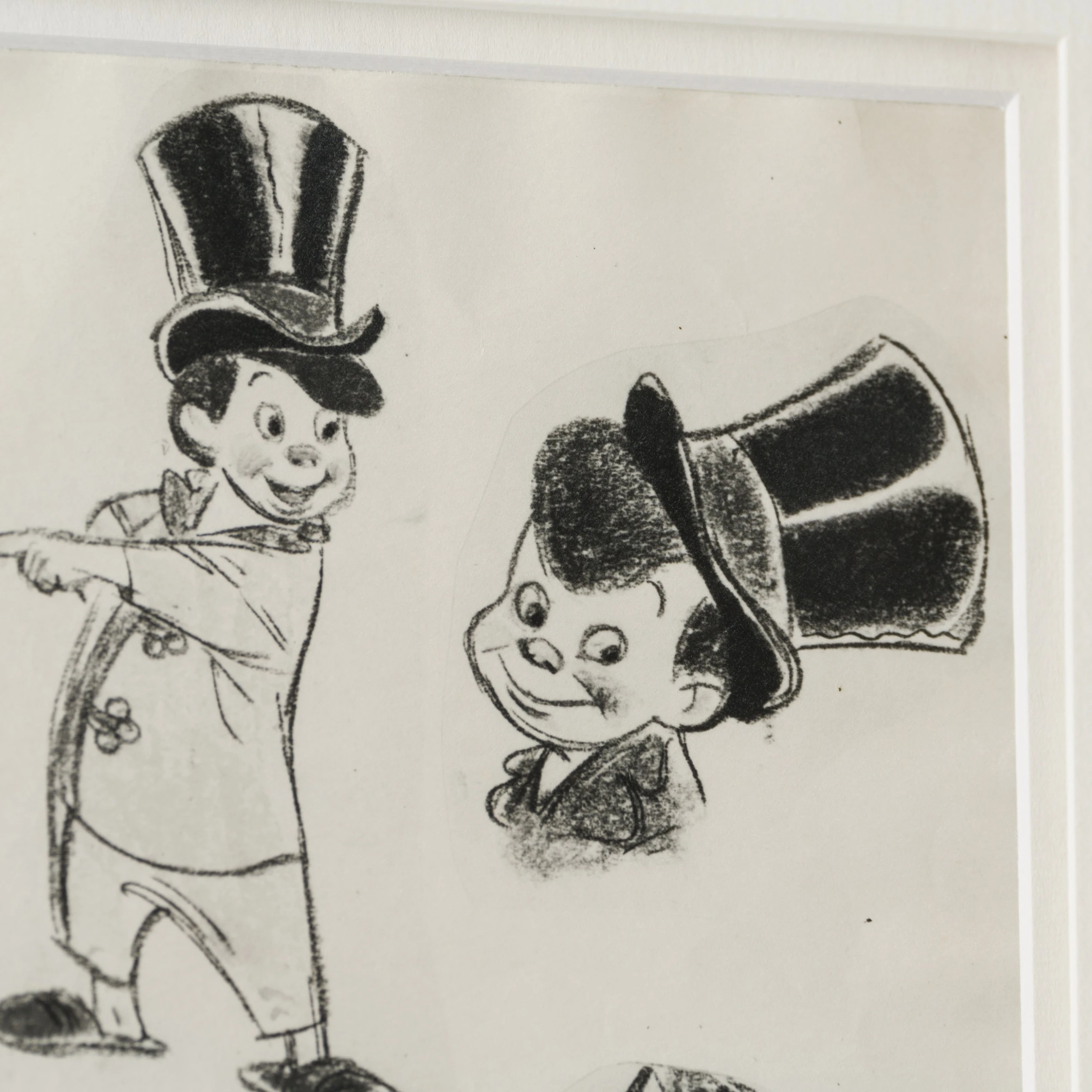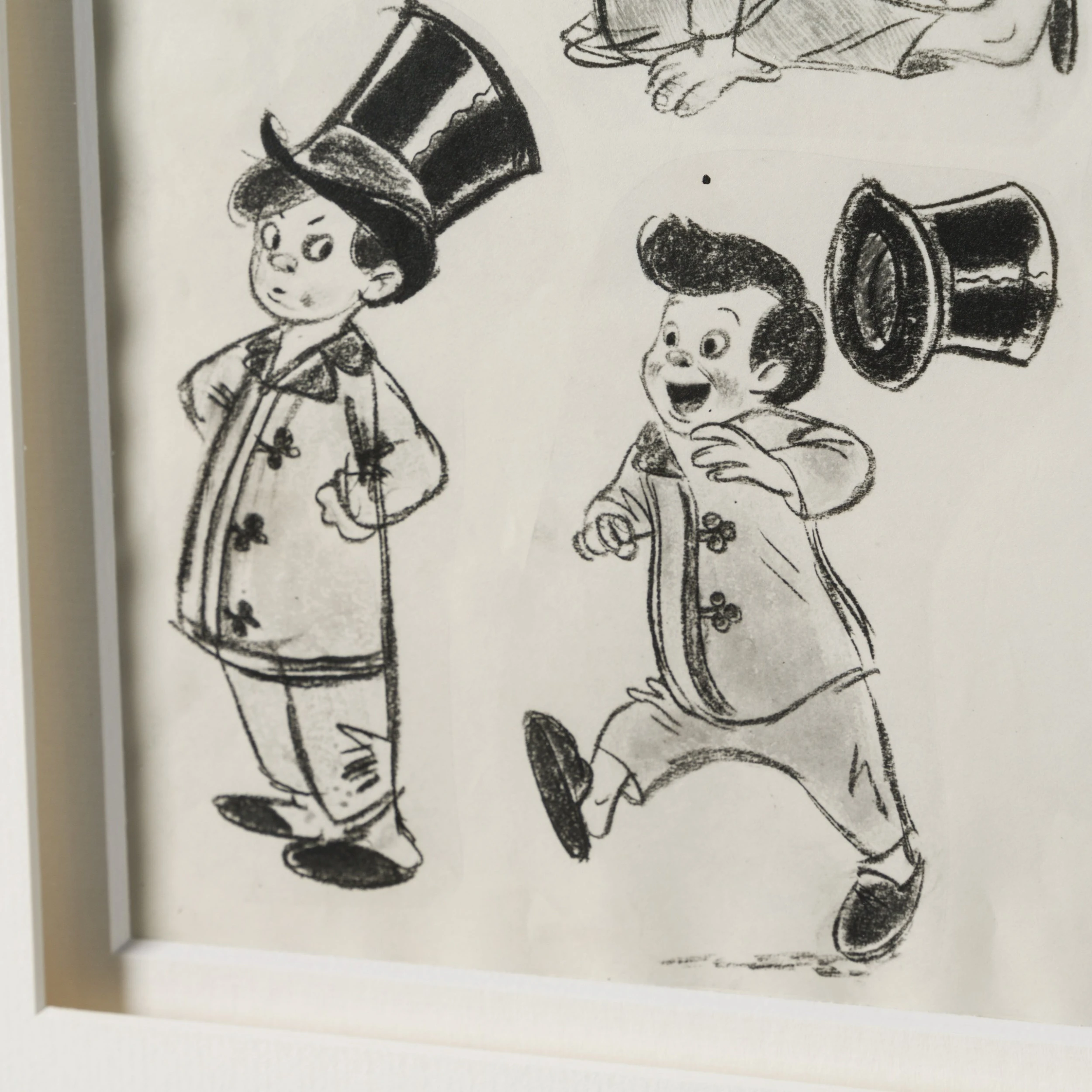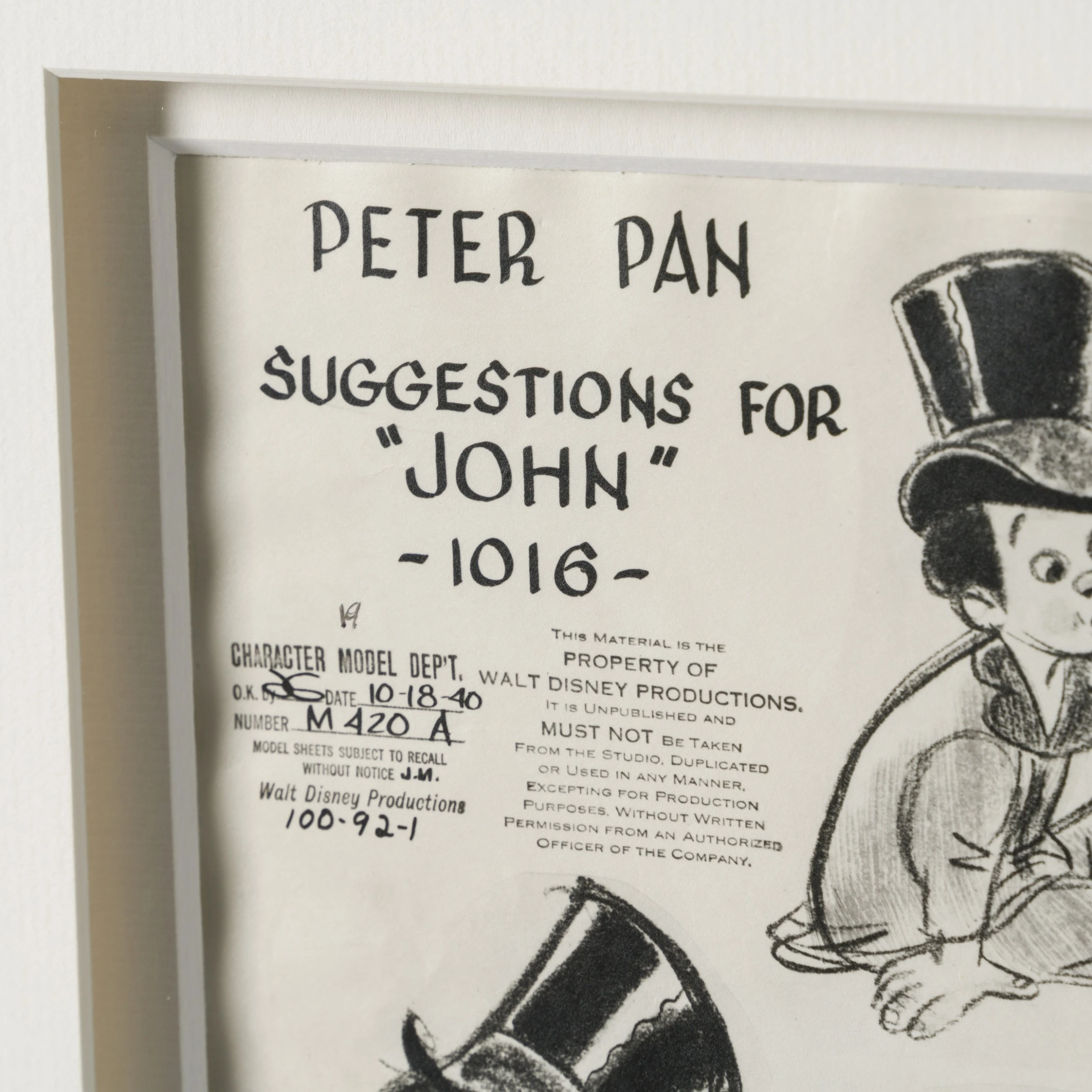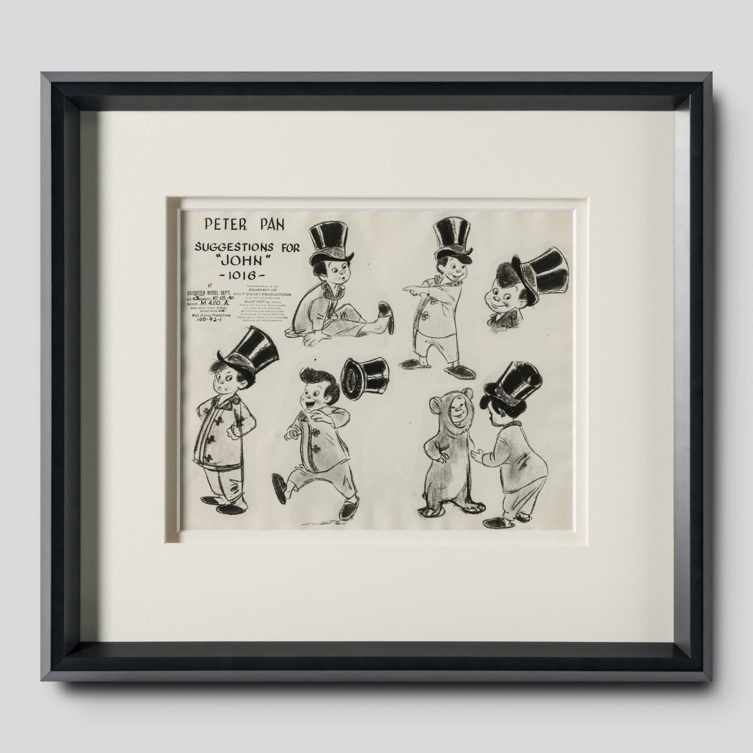 This authentic model sheet from the film’s production would have been used by animators at Walt Disney Studios for the character of John in Peter Pan. Displayed on its original, beautifully aged paper, this drawing showcases the artistic nature of the early animations and their warmly expressive forms. Now mounted and framed, this piece is the perfect way to add a sophisticated and muted touch of Disney magic to your home. Match with another drawing from our to create a perfect pair.
