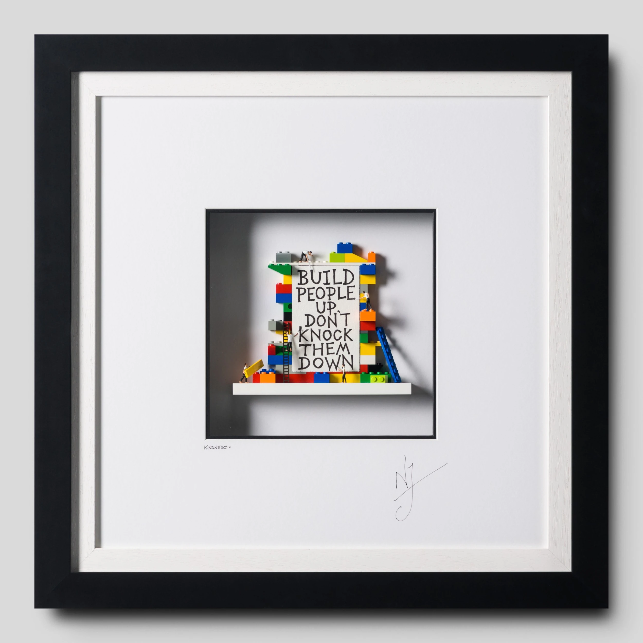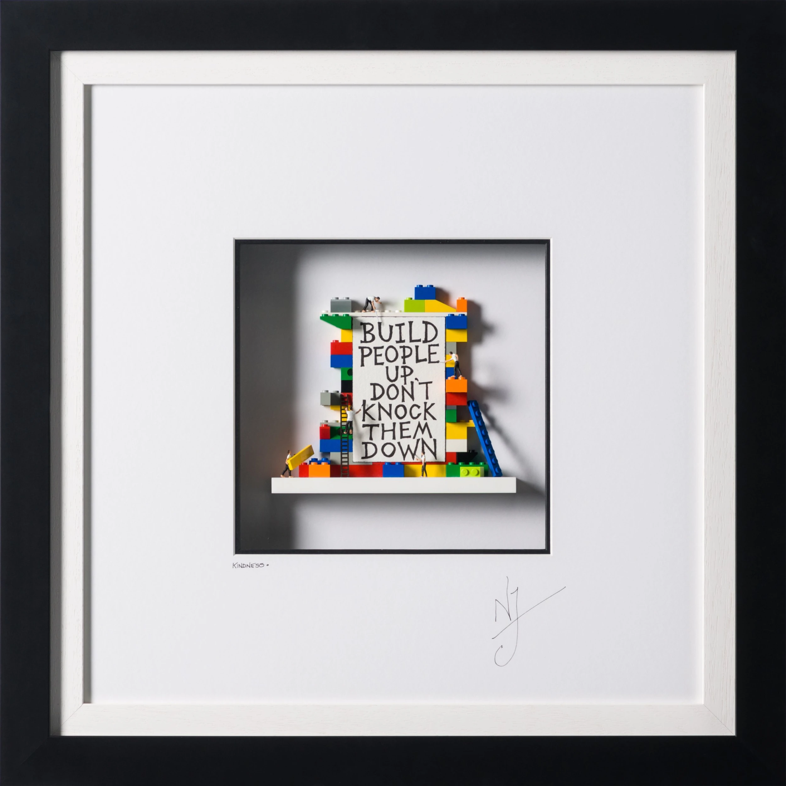 With his signature figurines in the background assembling the quote with small Lego pieces, the British artist represents the importance of kindness and of empathy. The artist was inspired to create this simplistic yet beautiful piece that reminds us that we should all strive to make the world a better place at all ages and walks of life. This piece is a 3D Wall sculpture.