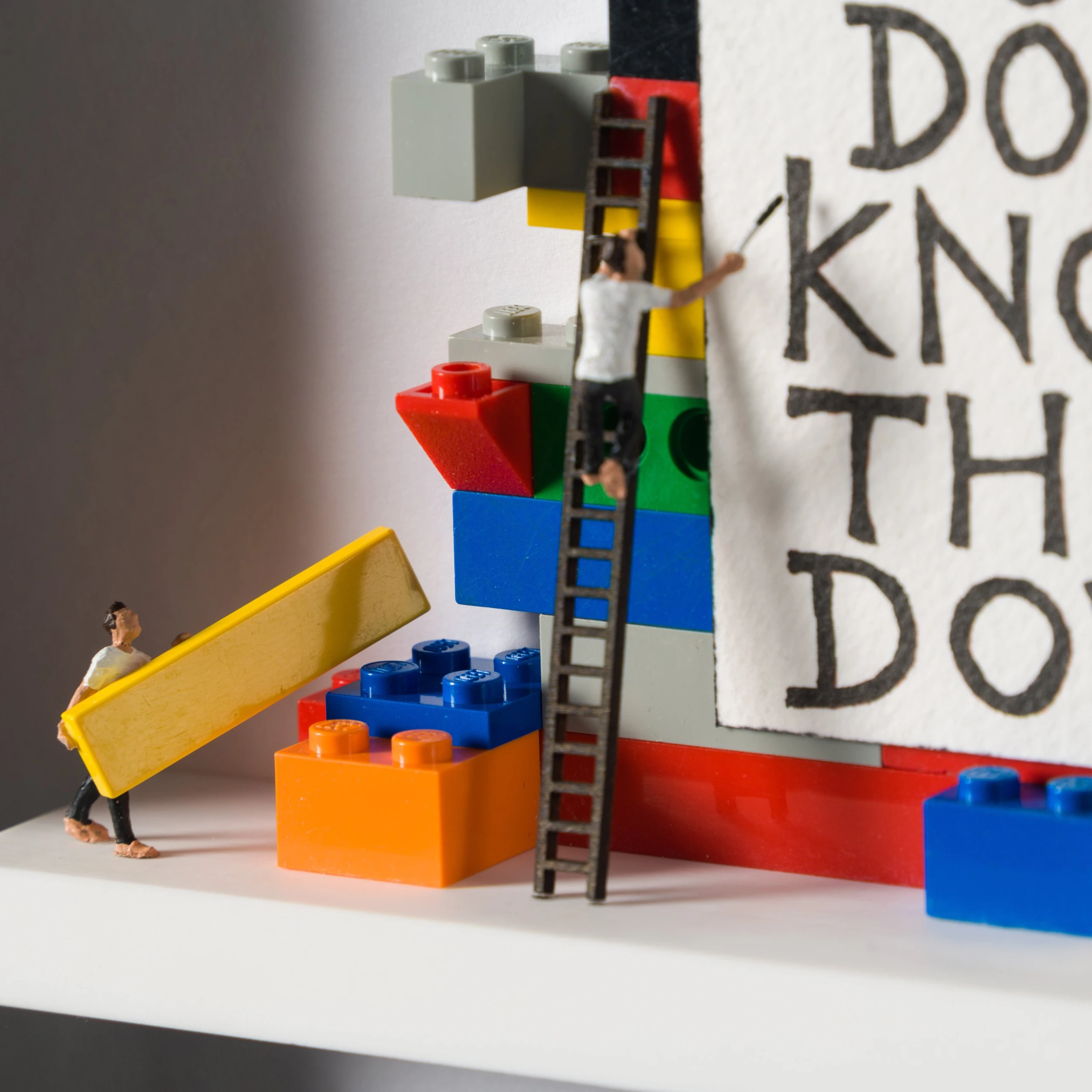 In his iconic wall sculptures, creates humorous depictions of everyday life, and the vices of the modern world are combined with touching explorations of subjects such as mental health. In “Kindness”, the artist created a smart playful way of materialising the famous quote “Build people up, don’t knock them down”. Nic uses his love for Lego in his first ever piece featuring the toy, evoking the sentiment of the artwork while mixing themes of his childhood with an adult message.