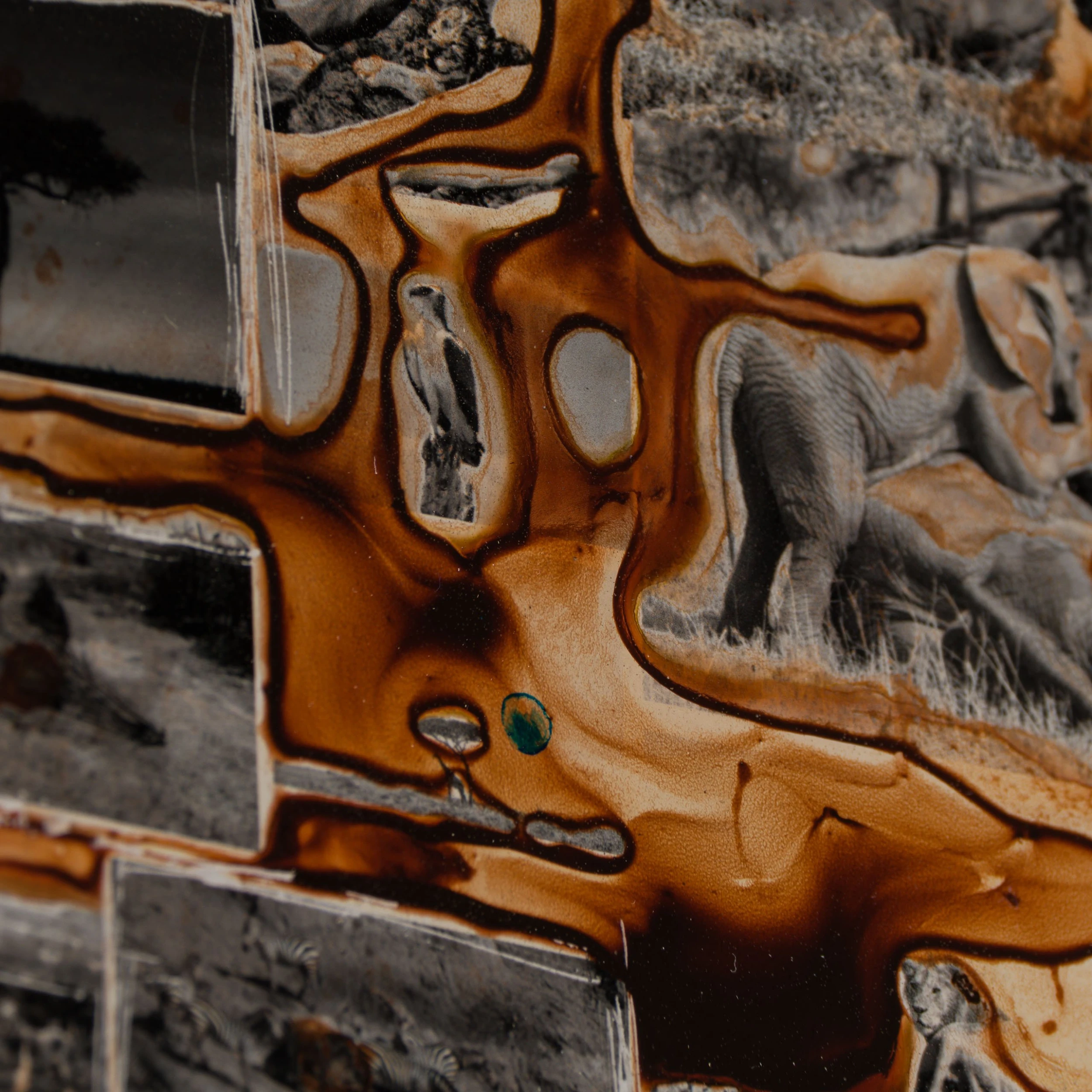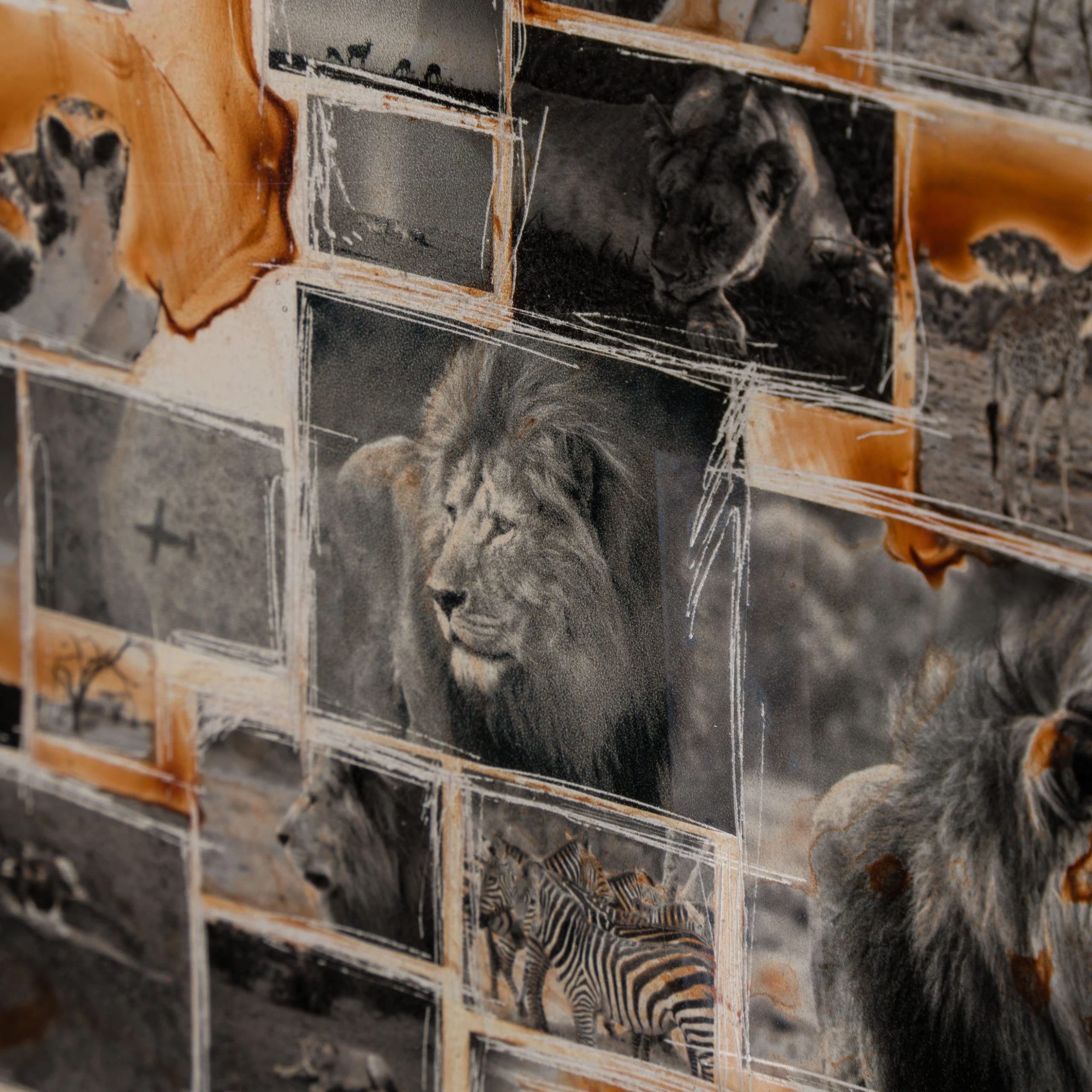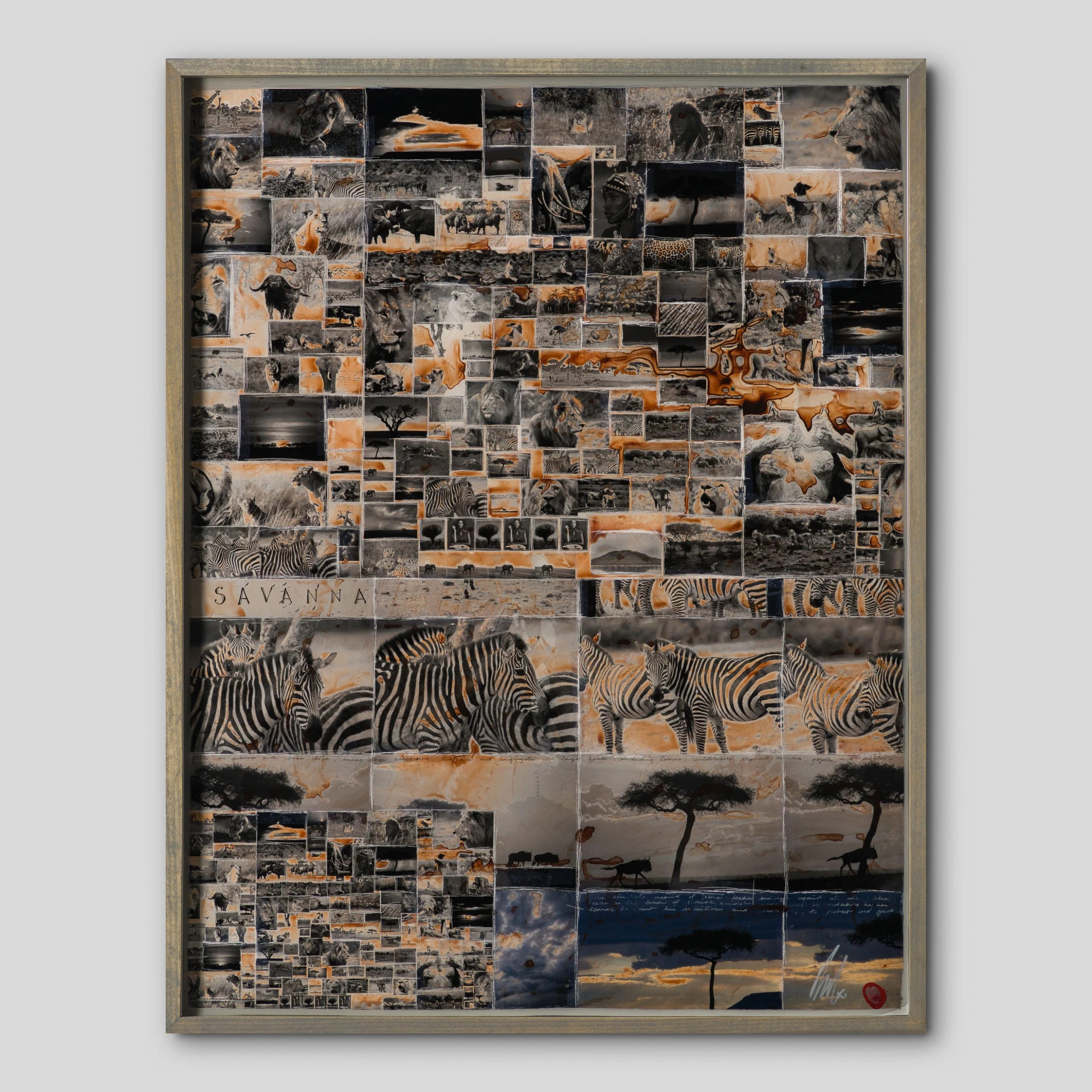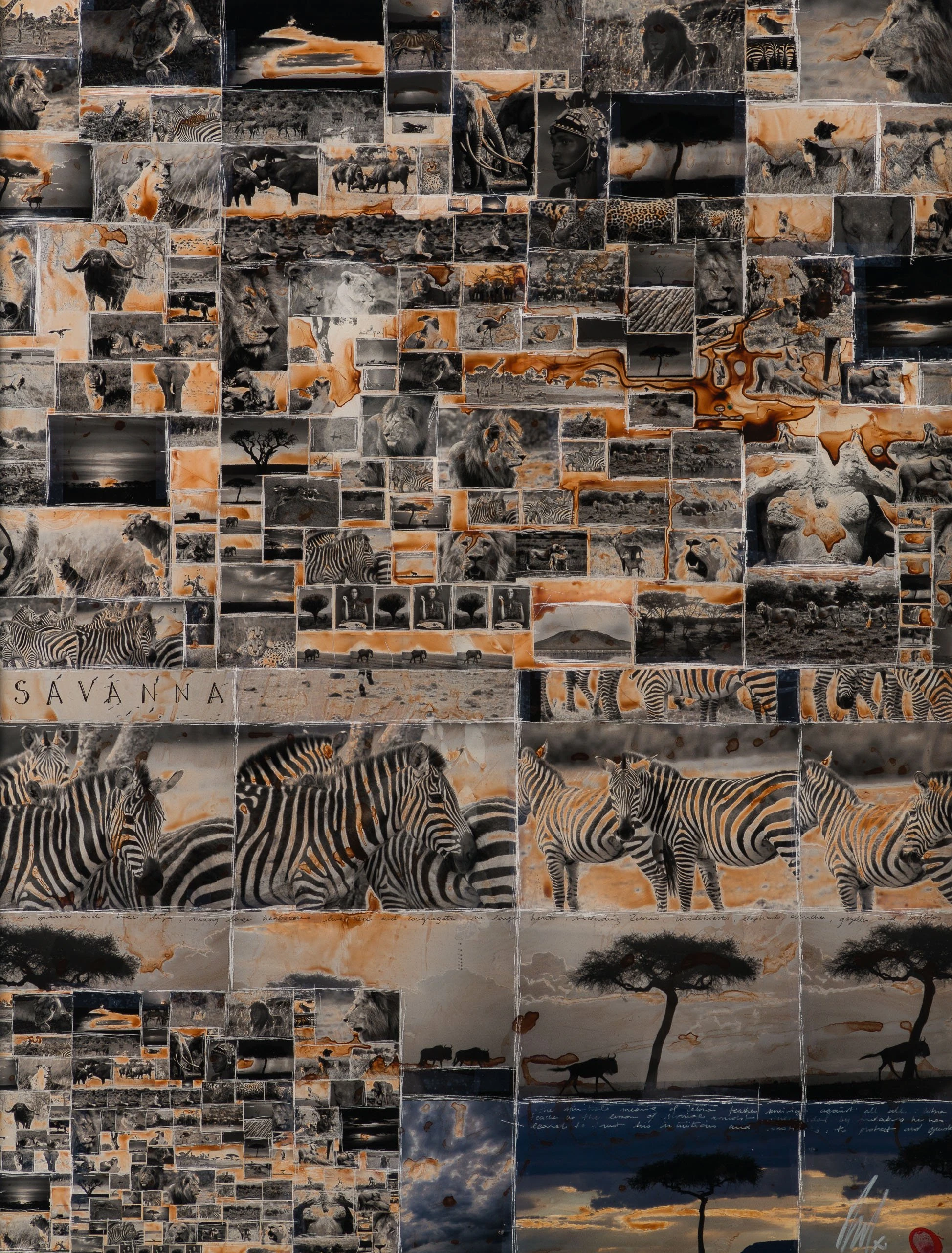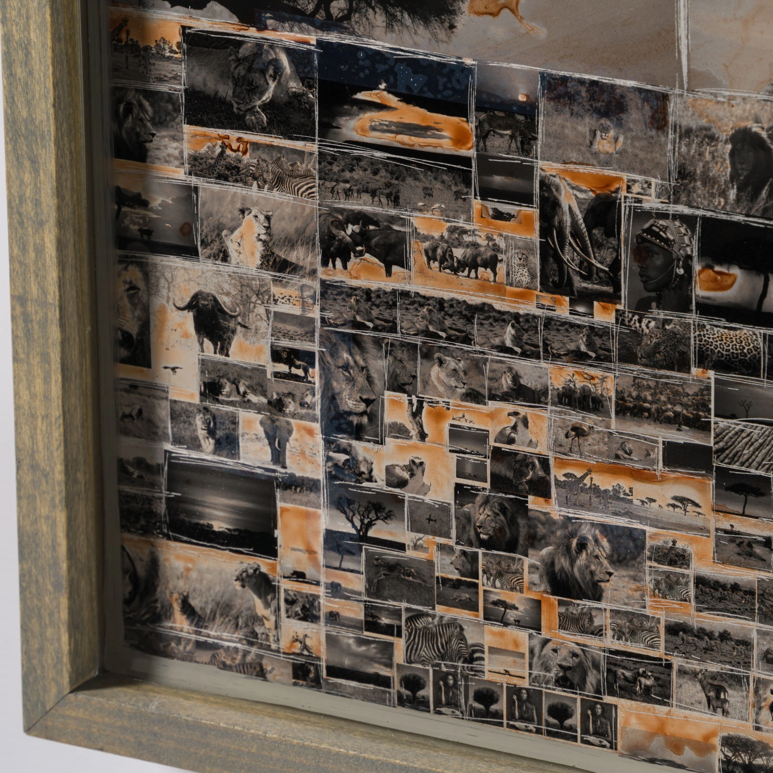 With Moroccan pigments and Vietnamese paints, Mazzucco’s pieces are characterised by the juxtaposition between wildlife and cultural photography, this incredible piece forms part of his introspective collection Grass Roots 2023. “Kuhama (Migrate)” features photography taken in Kenya, Africa mainly in sepia earthy tones, enhancing the raw beauty of the images. The piece tells a story in layers. The overlaying of photography, paint, and resin adds life into the composition, creating a statement original. The pops of colour added sporadically throughout the composition create the spontaneous dynamic that this wildlife piece represents. The use of different images sizes and its repetition create the intrinsic depth, characteristic of Mazzucco’s originals.