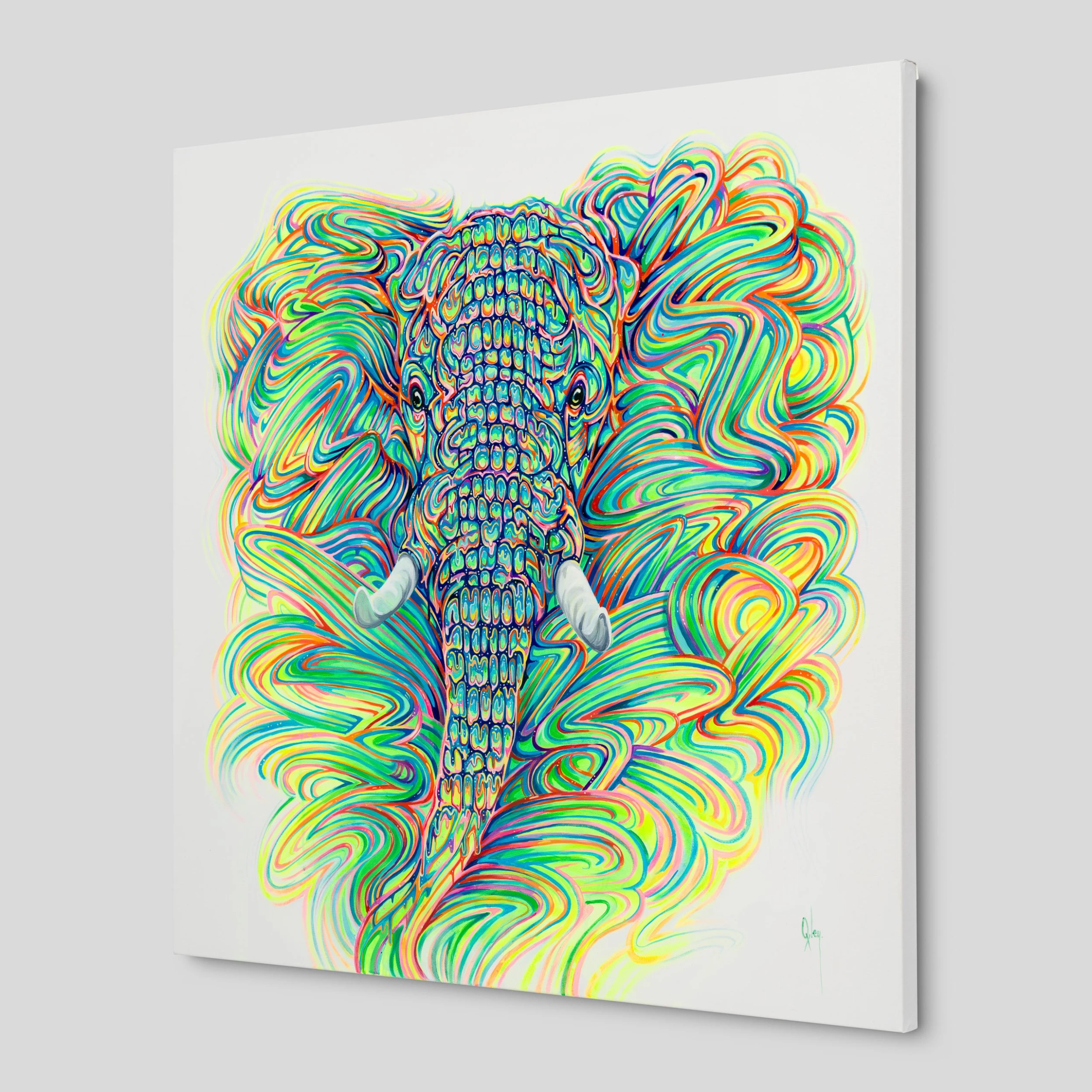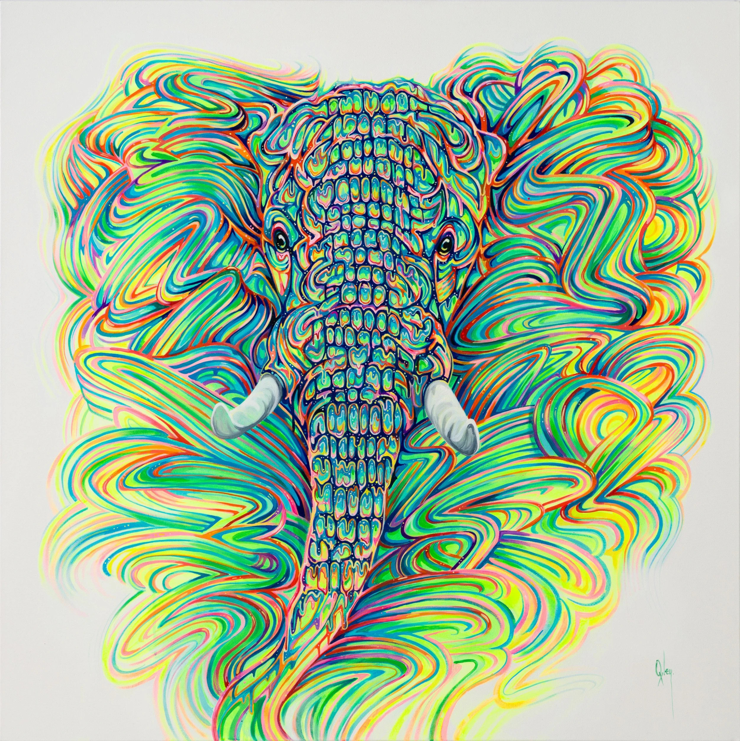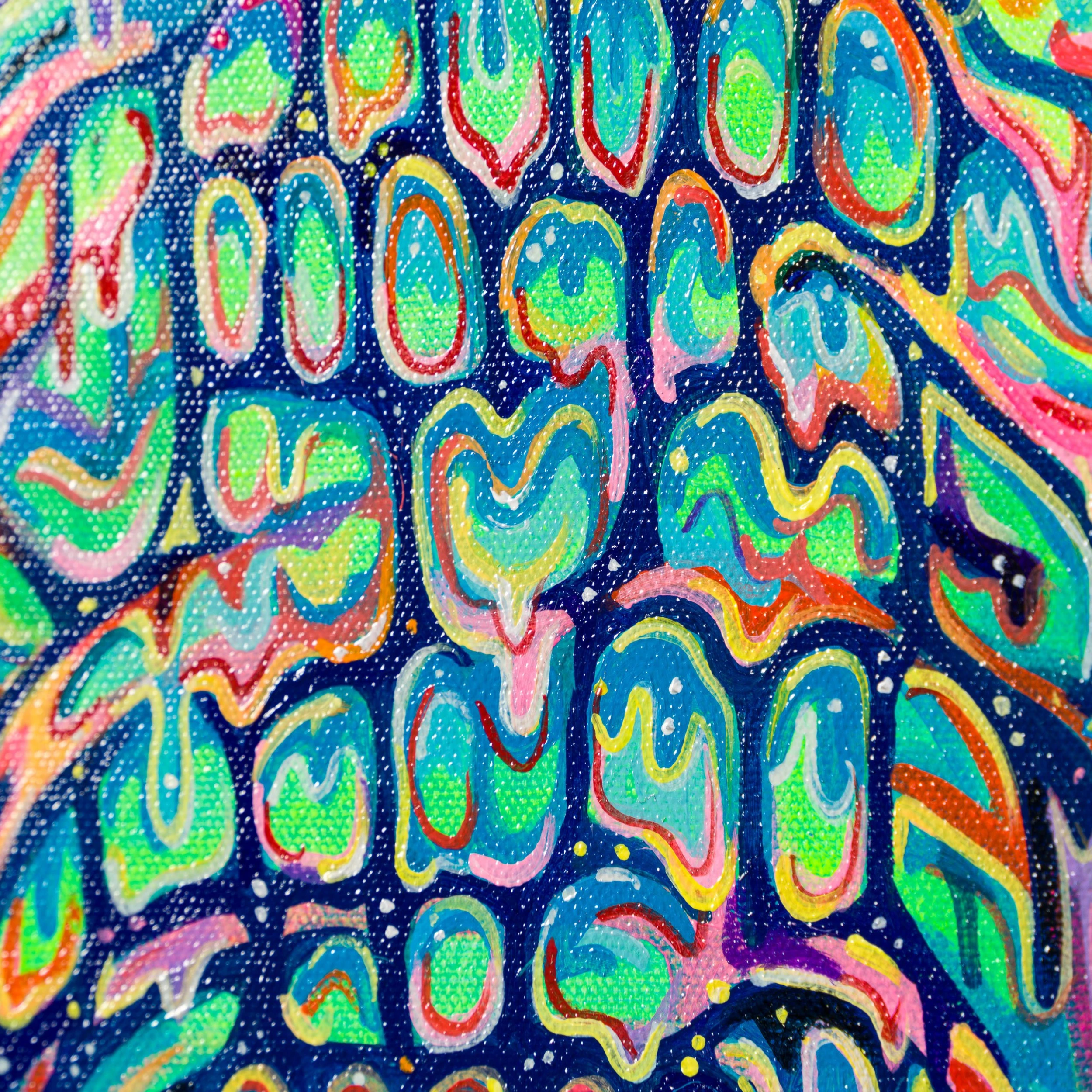 Many of Oxley’s pieces skilfully blend elements of surrealism and expressionism, infusing each piece with energy and emotion. His expressive brushwork is energetic and fluid, giving his paintings a sense of movement and spontaneity as his captivating portraits feature wild animals created through intense patterns and psychedelic colour. The traditional colours of the animal are overthrown by exciting vibrant shades, transforming it into an “ethereal, astral” being through his kaleidoscopic use of colour and form. The strong rainbow shades contrast beautifully with the white background.