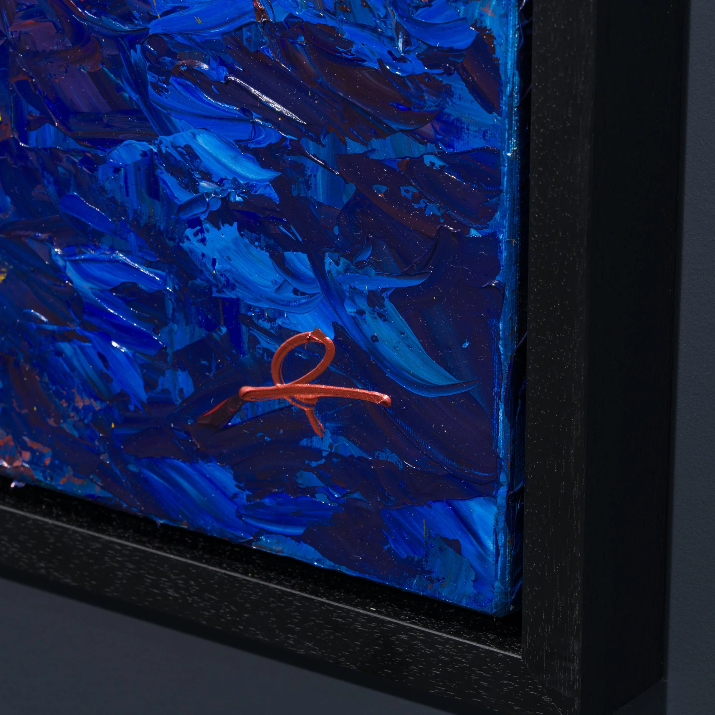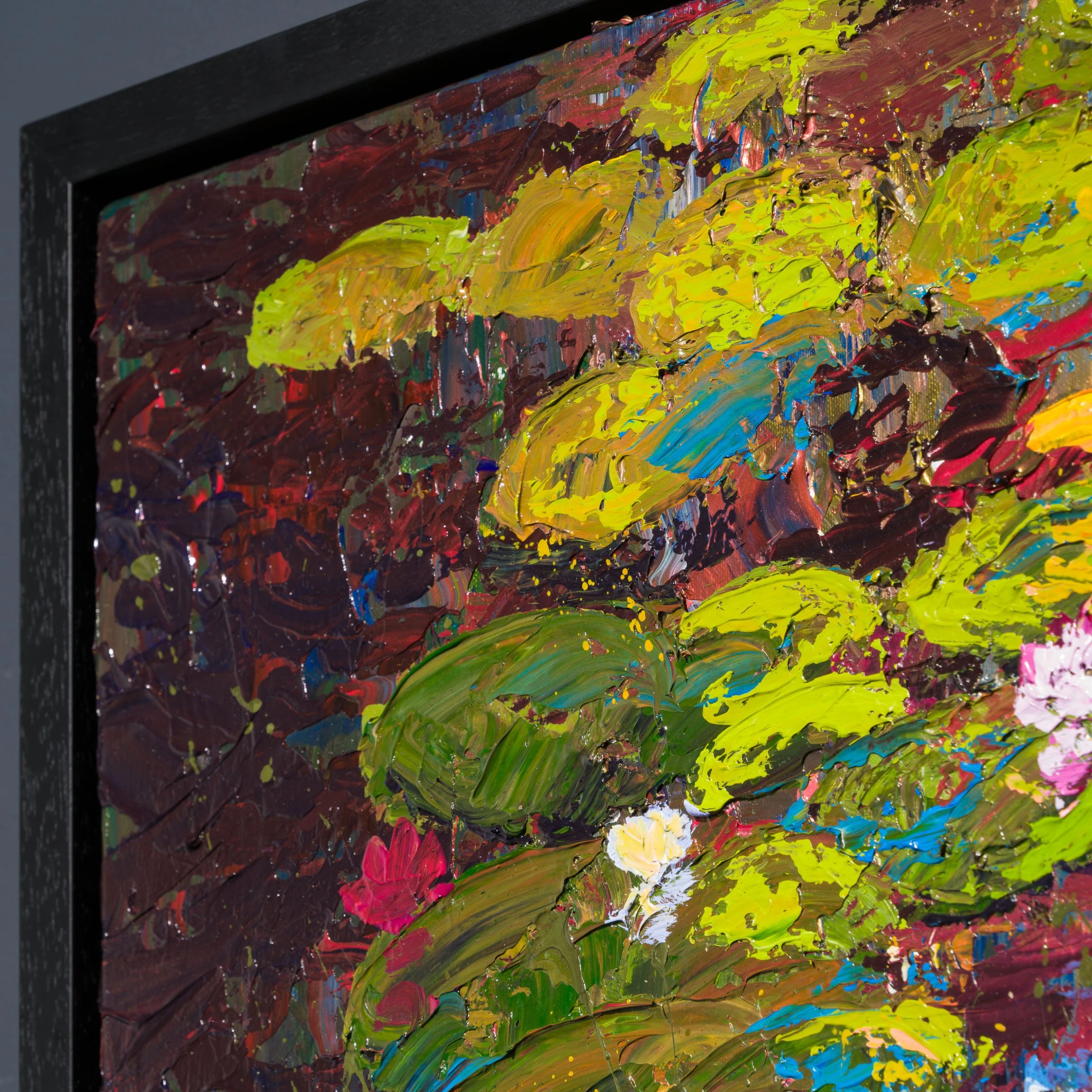 In “Lily Pond Luminosity”, Kenton captures the gentle movement and the depth of the pond water in beautiful soft hues. With the sunlight dancing on the pond’s surface, the artwork evokes a strong feeling of serenity and calm. Built up with layers of paint, the original has a highly textured surface. The piece’s ability to make a statement is unmatched, allowing collectors to have a hypnotising escape in their house.