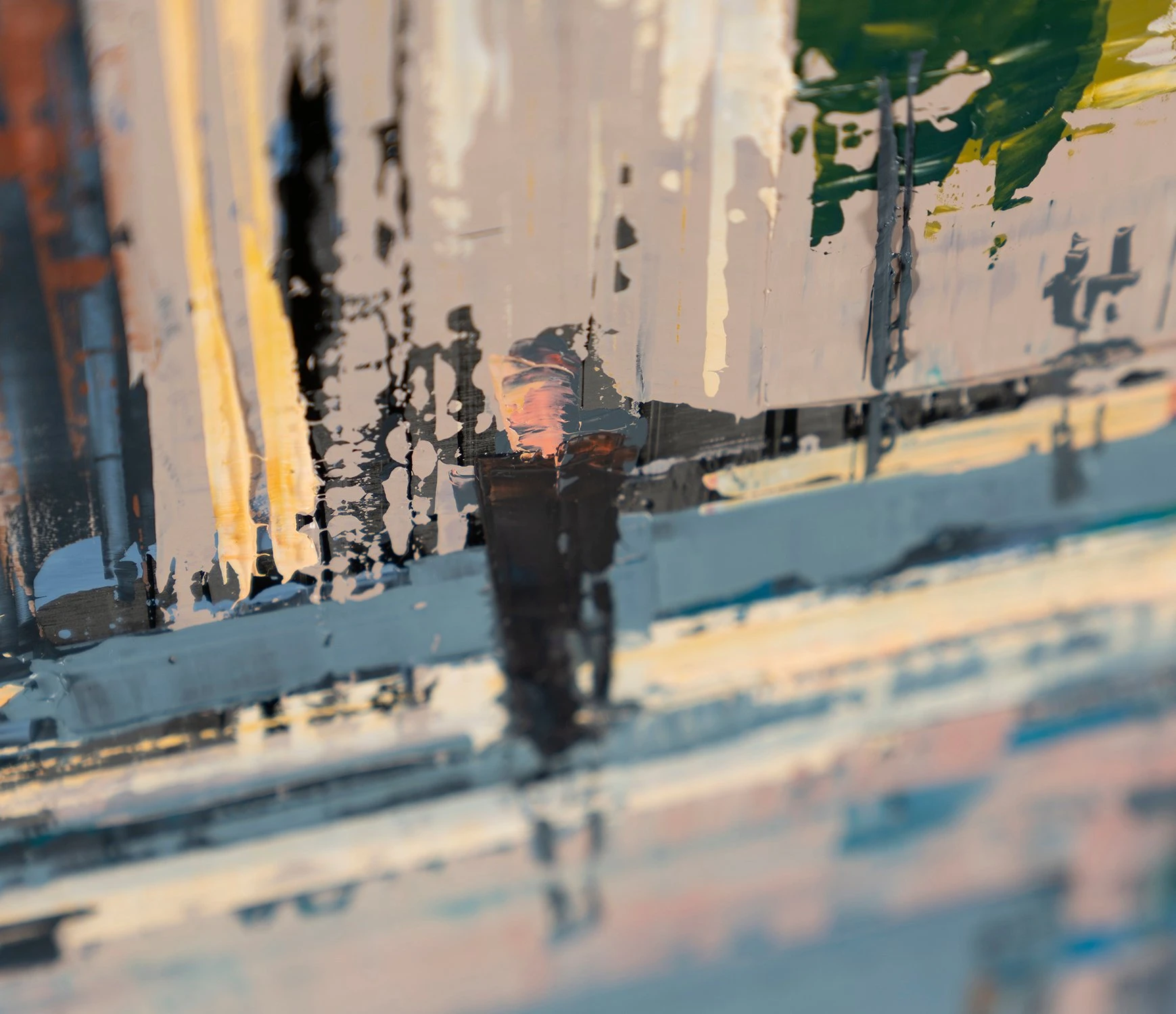 The genre of cityscapes in fine art was made famous by impressionist artists like Claude Monet and Camille Pissarro, although the genre can be traced back as early as the Middle Ages. Paul Kenton brings this genre into contemporary art through unconventional canvases, brushstrokes, tools and perspectives. The reflective metal in this artwork, for example, brings the industrial materials in London’s iconic buildings to life and creates a truly unique textured original artwork.