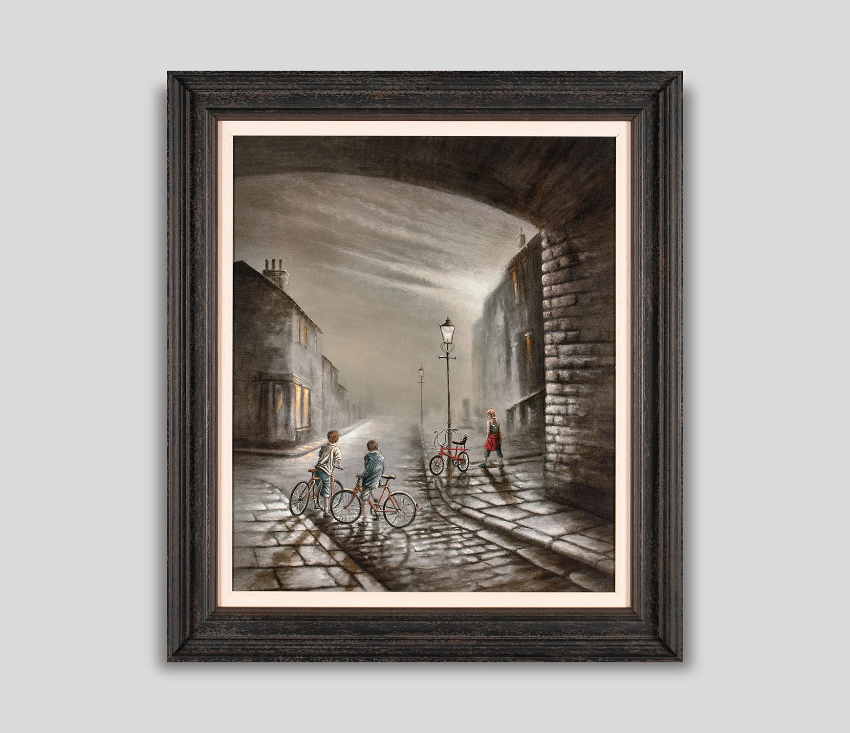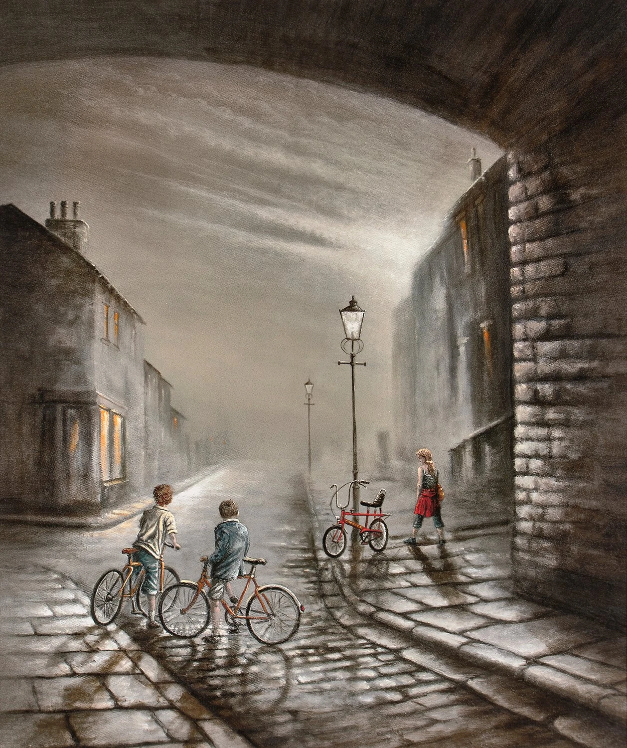 This dark and atmospheric artwork by Bob Barker explores a light and humorous theme. Across the cobbled street, two boys admire a girl with a chopper bike. Is it love at first sight of her or her iconic bike? Either way, the sweet and light-hearted piece epitomises Bob’s beautiful portrayal of industrial settings and artworks with double meanings.