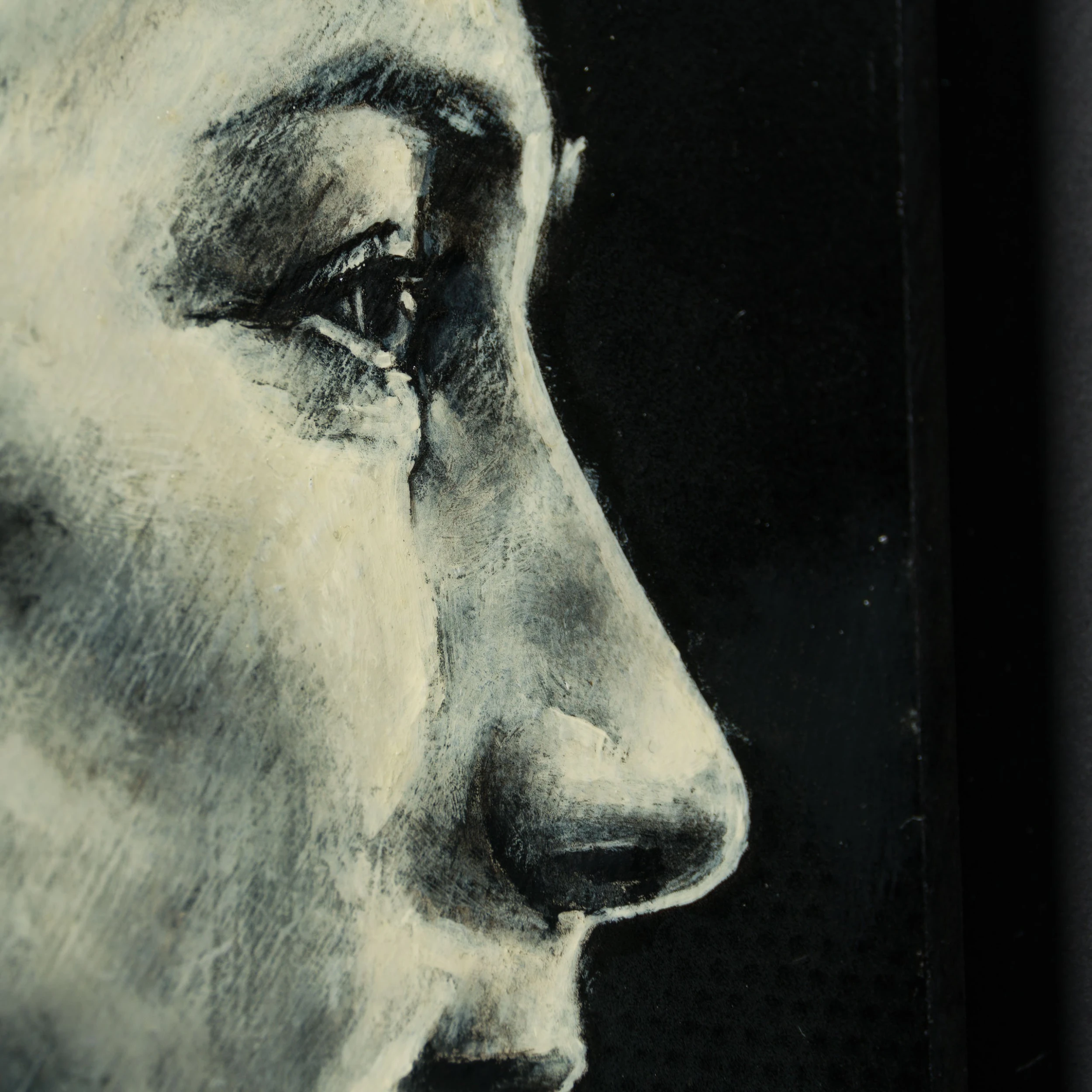 The deep swathes of black paint are skilfully blended and contrasted with white accents to create detailed and moving masterpieces. Working in an expressionist style, Jon creates representational artworks using mark making, a technique the artist has mastered throughout his career “The instant grab of attention and the ability to convey emotions so simplistically is not lost on me. Nevertheless, I want my work to be more than just a quick line drawing. These are personal paintings which if anything, I paint to make me smile, all the people portrayed have inspired, provoked, and interested me throughout my life.”