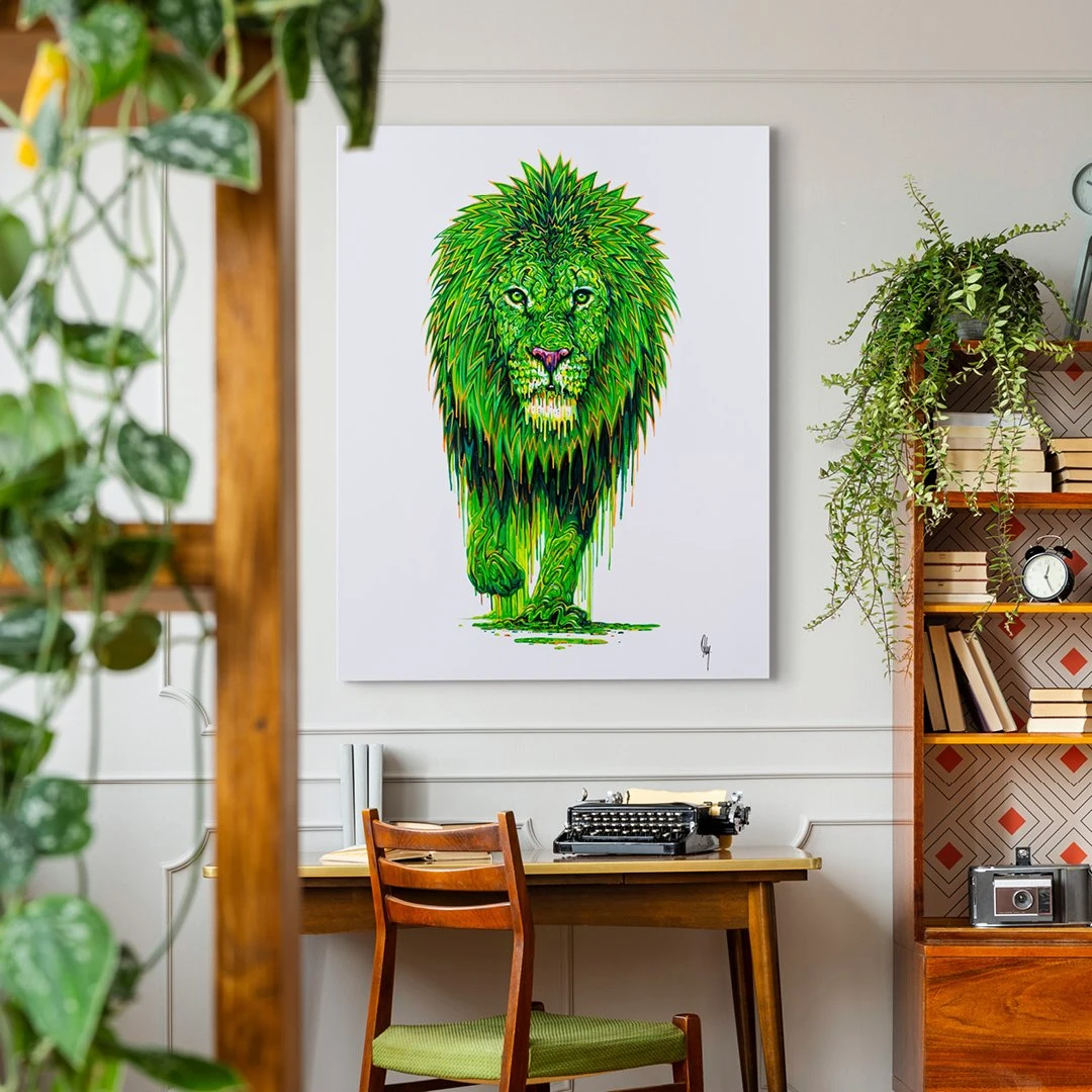 Named after the green mineral known for its vibrant colour, in this boutique edition of “Malachite”, the traditional colours of a lion are overthrown by exciting shades green, transforming the animal into an “ethereal, astral” being through his kaleidoscopic use of colour and form. Many of Oxley’s pieces skilfully blend elements of surrealism and expressionism, infusing each piece with energy and emotion. His expressive brushwork is energetic and fluid, giving his paintings a sense of movement and spontaneity as his captivating portraits feature wild animals created through intense patterns and psychedelic colour.