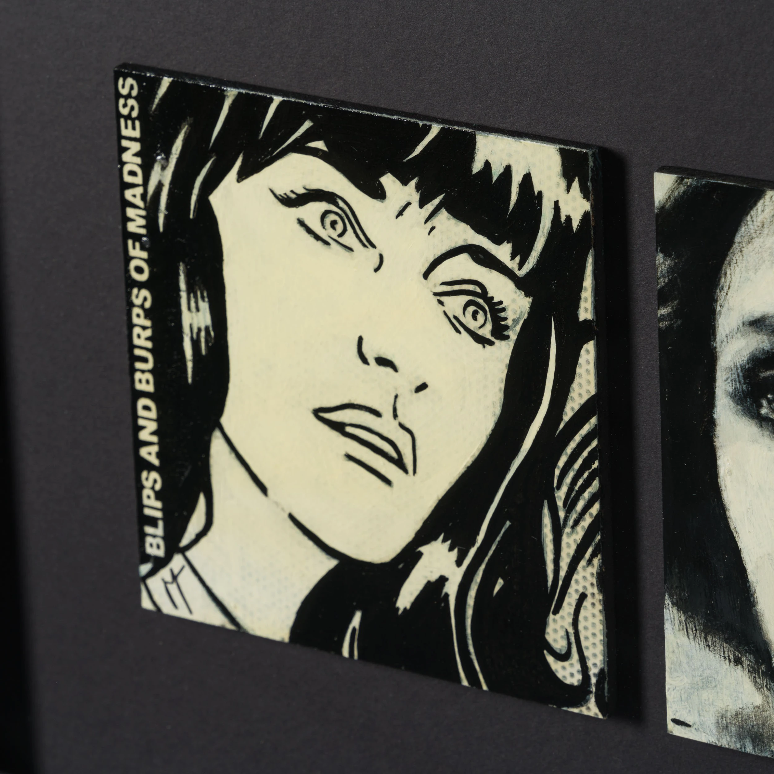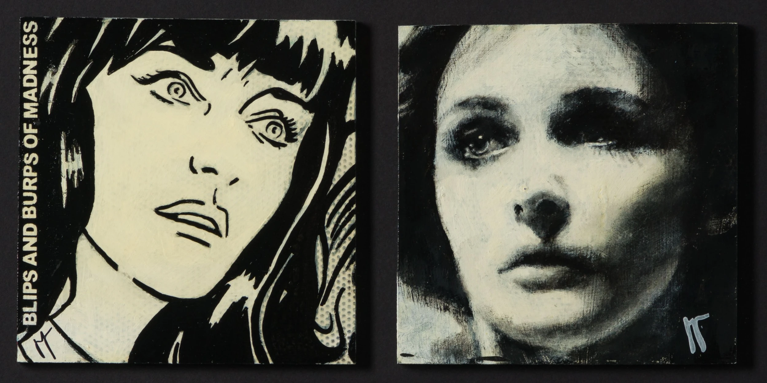 Perplexing, and melancholic, Jon’s work is created from the heart, and whilst striving to capture expressions, moods and feelings as a portrait painter, Jon loves the juxtaposition between the portraits with the “animated” portrait, bring a new humour element to the piece. All the individual portraits are from people who have interested or inspired the artist in this case the Canadian actress Margot Kidder. “When I painted them, it was a double portrait reminding me of fragility of life, that how we are viewed/ the mask we wear to the outside world, often hides the real persons fears, insecurities. She was a truly beautiful person”.