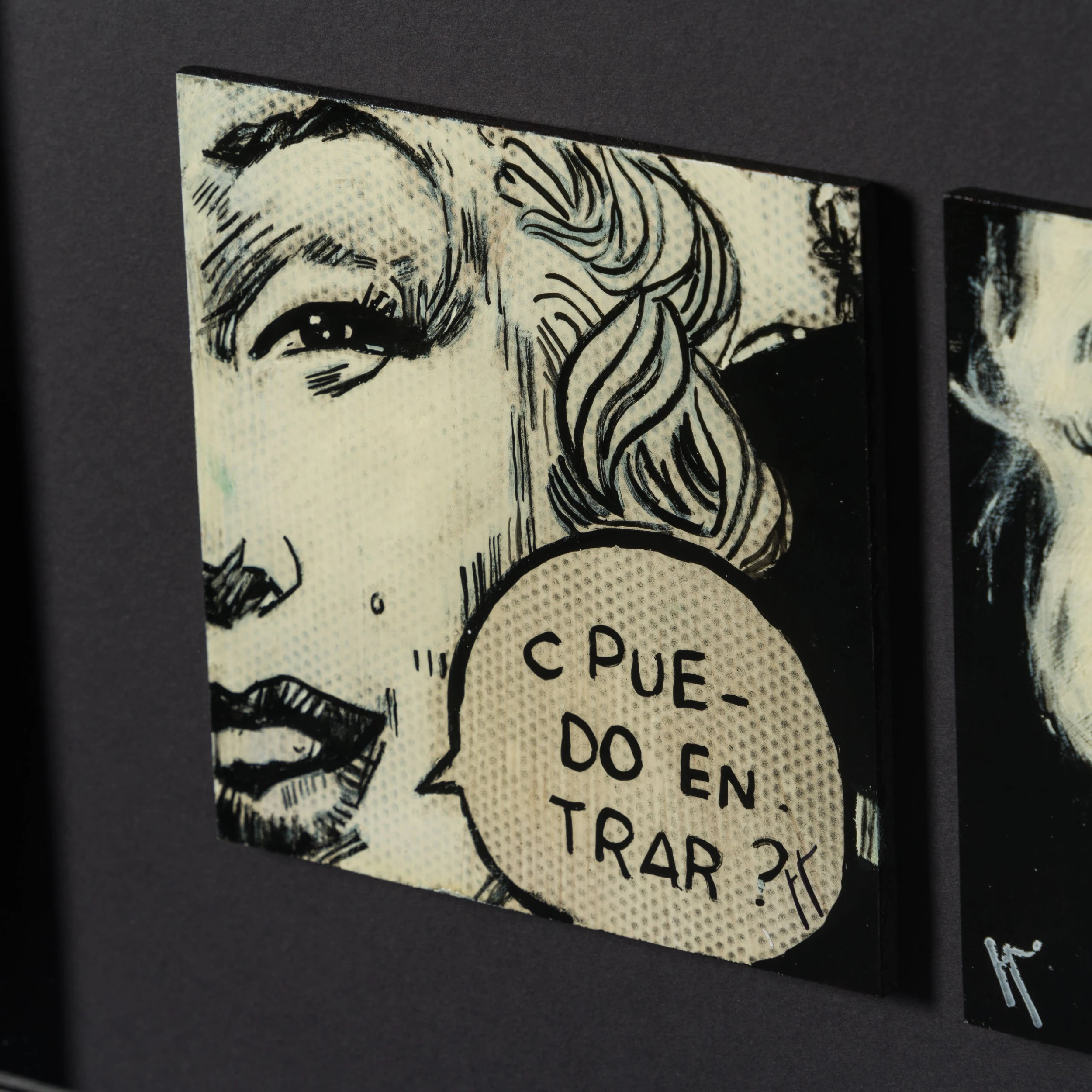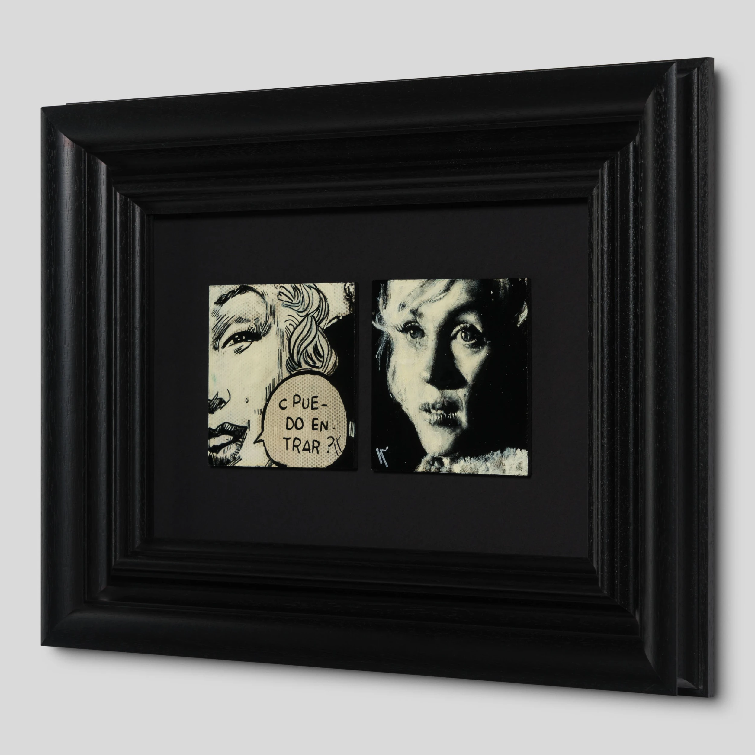 Perplexing, and melancholic, Jon’s work is created from the heart, and whilst striving to capture expressions, moods and feelings as a portrait painter, Jon loves the juxtaposition between the portraits with the “animated” portrait, bring a new humour element to the piece. All the individual portraits are from people who have interested or inspired the artist in this case Marily Monroe. Jon wanted to portrait both sides of the actress – the left side, inspired by a still from her last film “The Misfits” represents happy Marily, while the right side represents a sadden side of the famous actress.