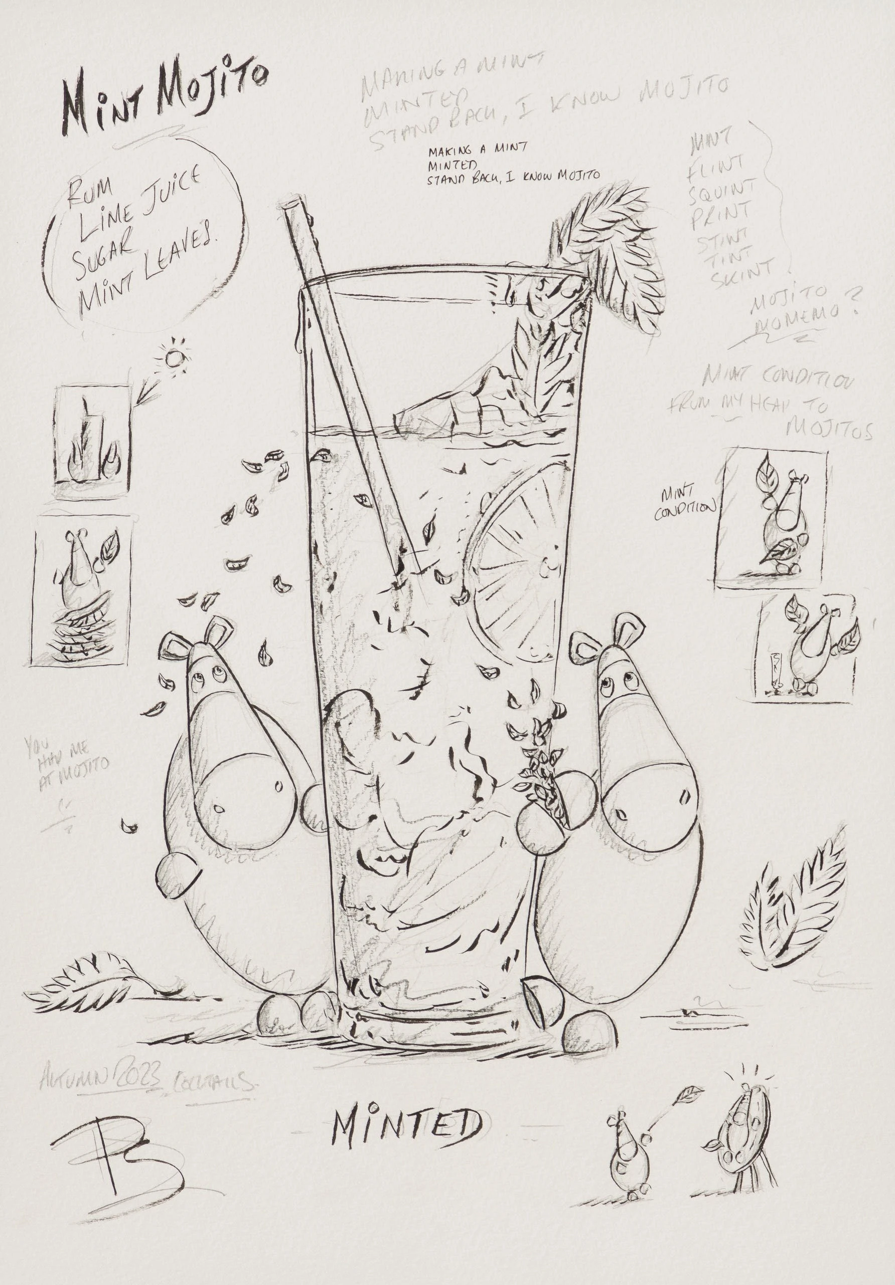 The artistic duo is back by popular demand with the latest in their Impossimal drinks series: ‘The Shaker Maker’, featuring their own twist on a menu of the classic cocktails we all know and love. The Shaker Maker sees the Impossimals bring out in glorious bold colour the fun we know and love, coupled with a bit of Dutch Courage and remind us to find the humour in life, ourselves, and the times we share with friends and family! In a traditional still-life composition creating a visually appealing and balanced image, “Minted” is a drawing the artist created before mastering the oil painting.