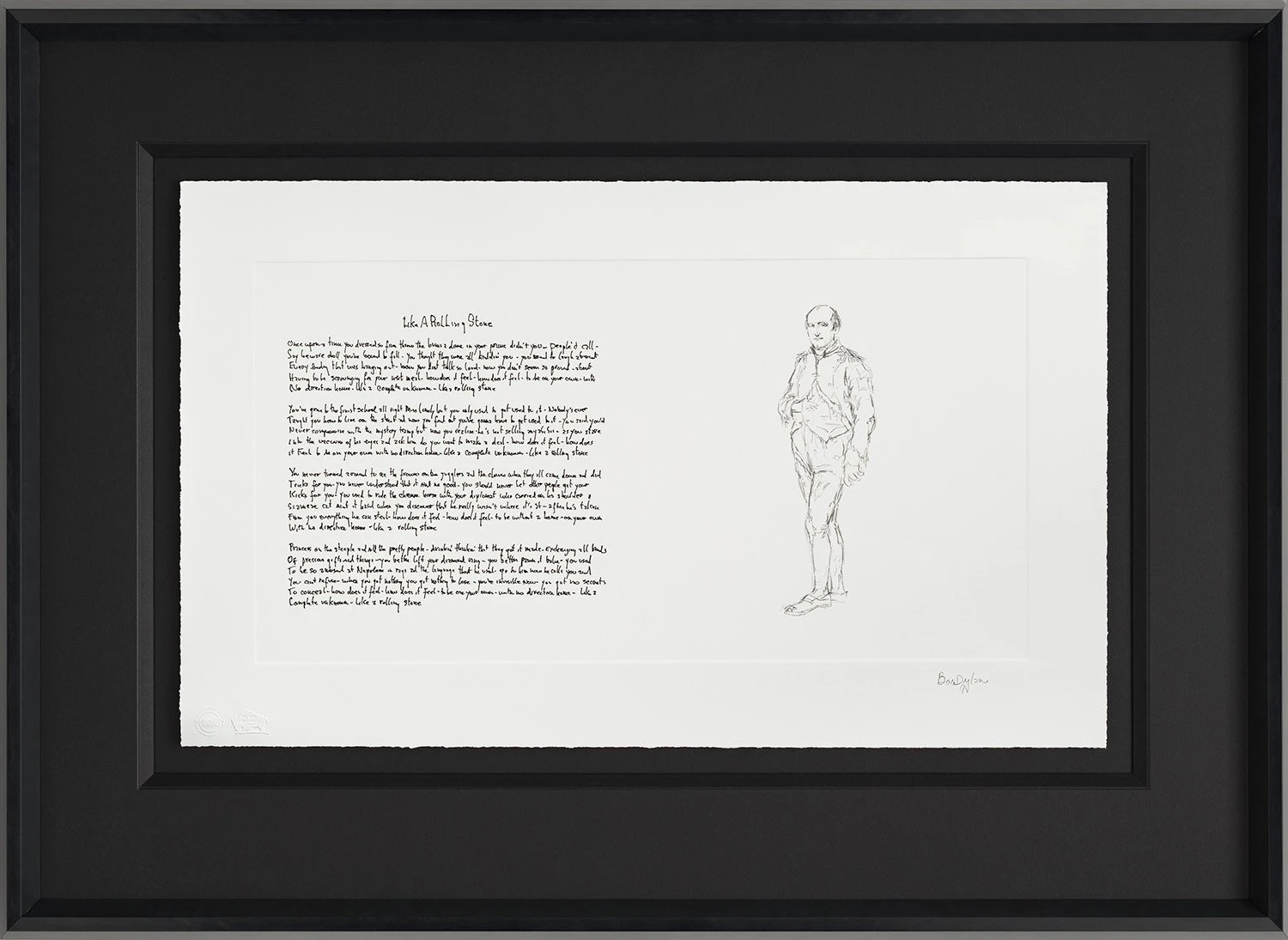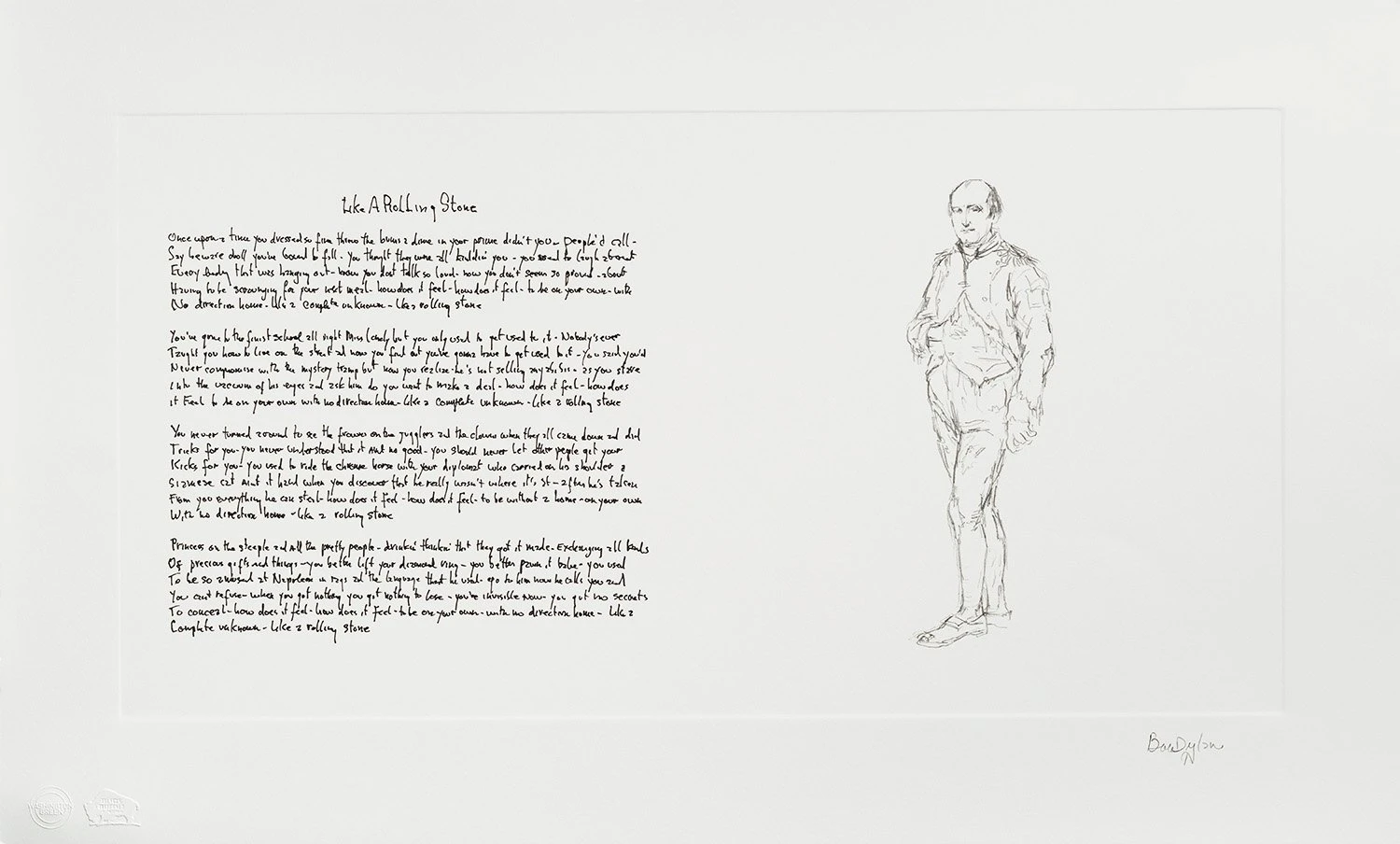 The collection features a selection of Bob Dylan’s most renowned lyrics, handwritten by him in pen on paper and accompanied by an original pencil drawing – offering for the first time ever a visual representation of his lyrics.