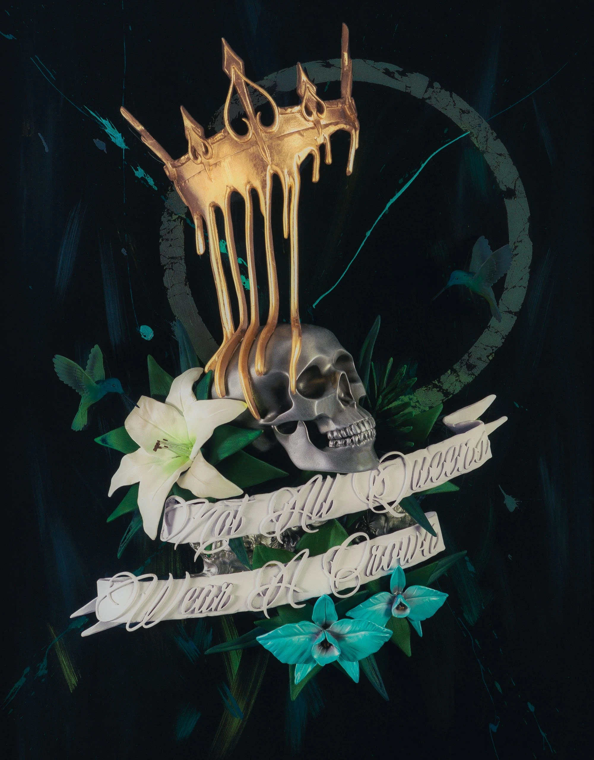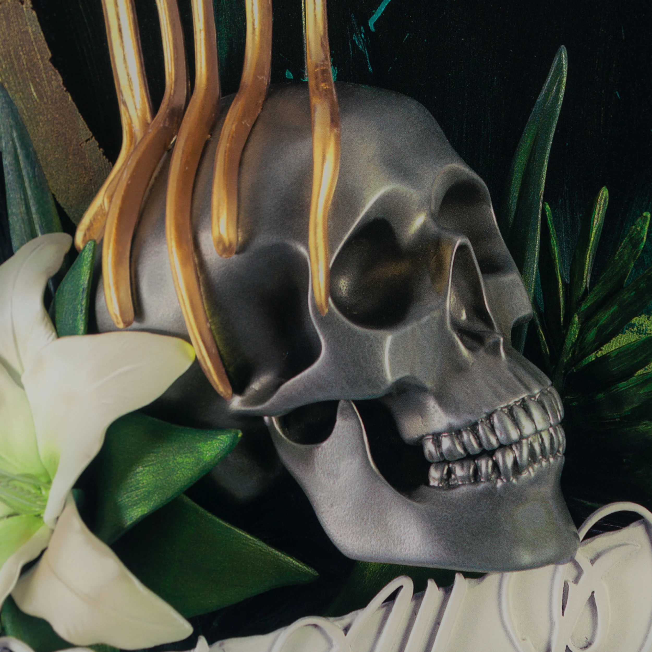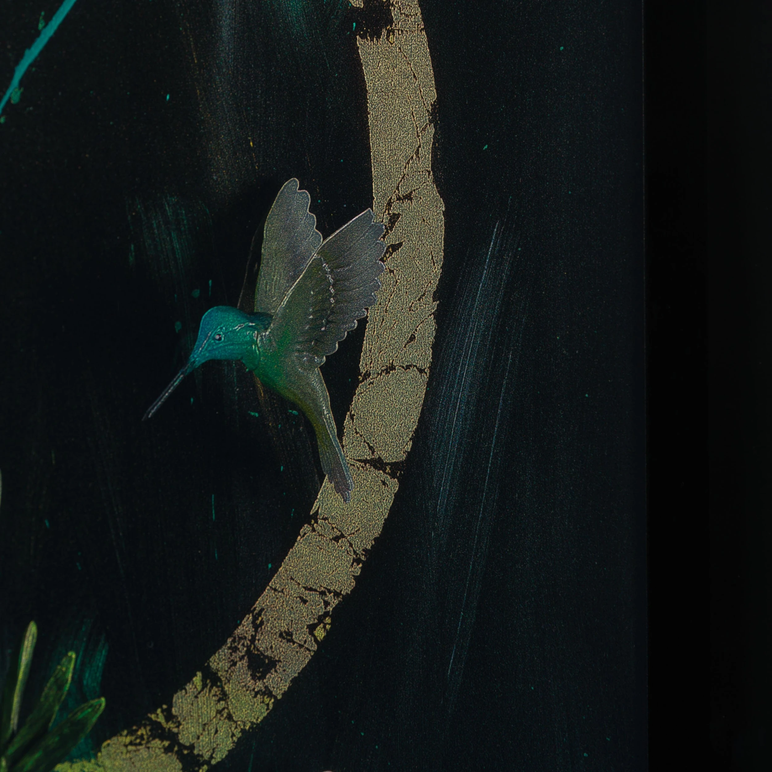 The highly popular works have a contemporary, urban edge, but as an artist, Dan is hugely influenced by the creation of the Renaissance and it’s the fusion of the two different styles that make the pieces so special. The dark and thoughtful piece is full of contrasting details, incorporating elements in a balanced way, such as the hummingbirds and flowers alongside skulls and crowns. Nature influences Dan’s art heavily, with many pieces featuring flowers, insects, and birds.