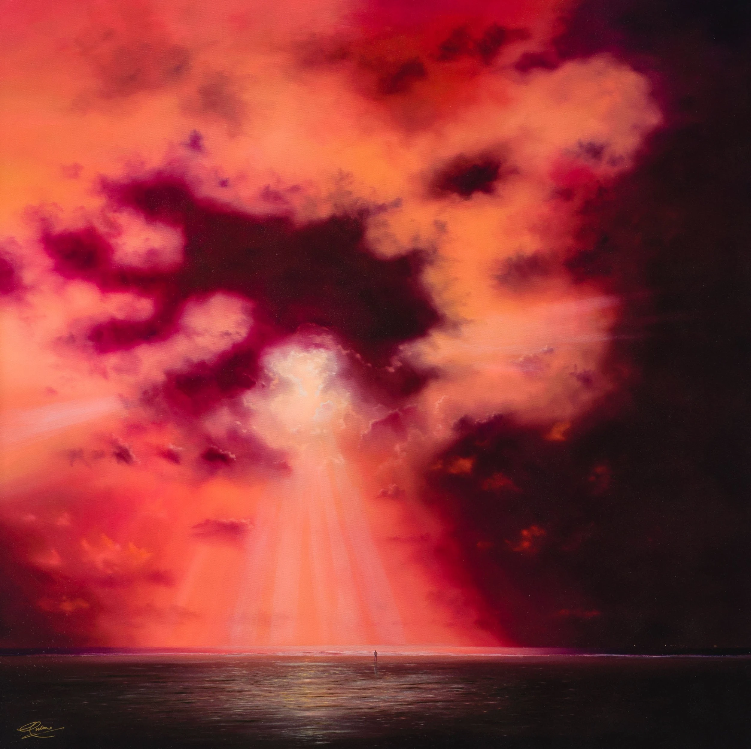 In ‘One Man Show’, the artist creates a magnificent piece where the main focal narrative is the beam of light, making the painted figure an added elements with expressive detail and creating the perfect dreamlike atmosphere. This evocative painting illustrates the power of nature. The light peering through the soft coloured clouds to the beams of light on the shoreline, this artwork has an ethereal surreal feeling to it. With the title phrase and the musical, theatrical feelings it encompasses as inspiration, Coulson created this piece around it. As a conductor of the epic display in front of him, the human figure is witnessing nature at its greatest, but in that moment it’s his ‘One Man Show’.