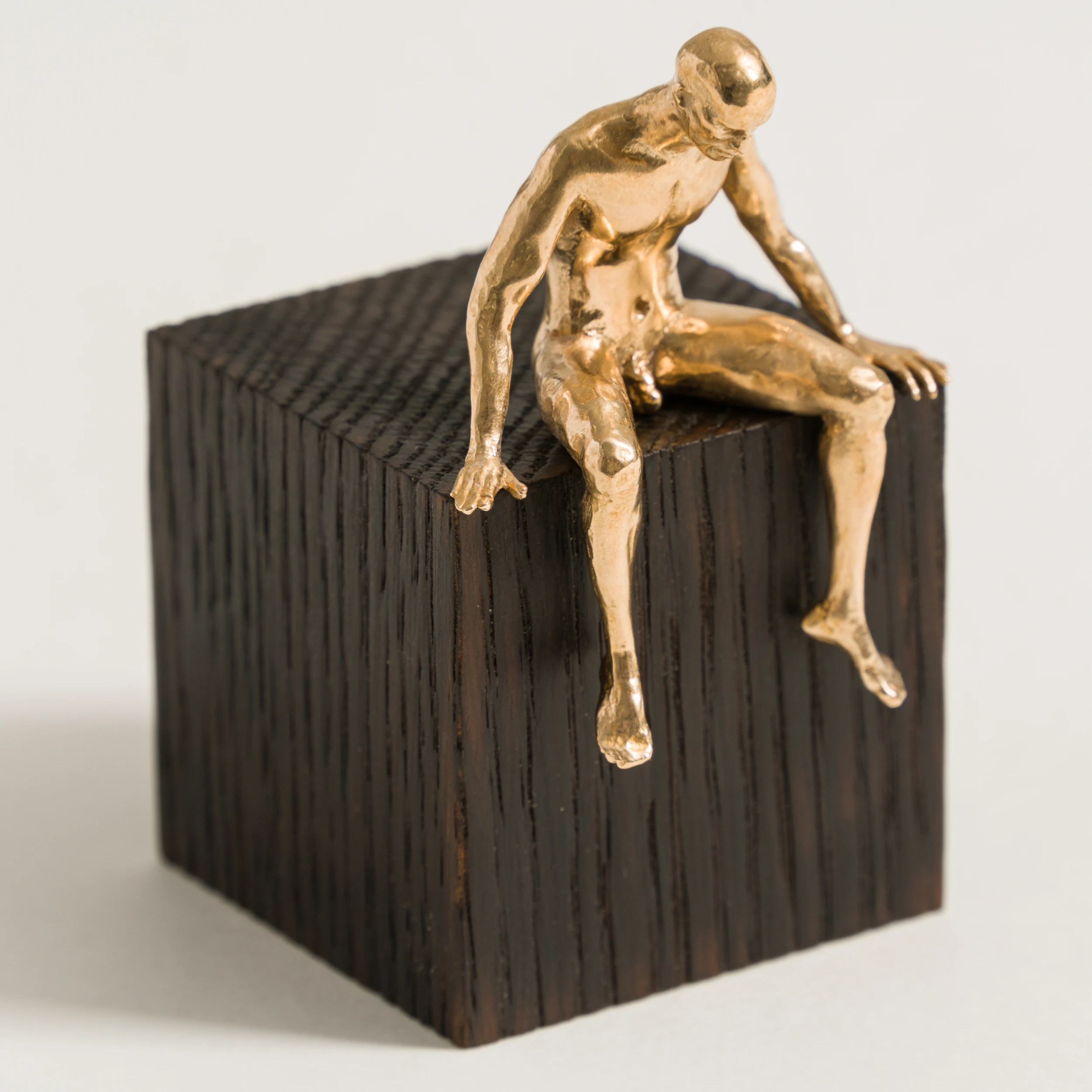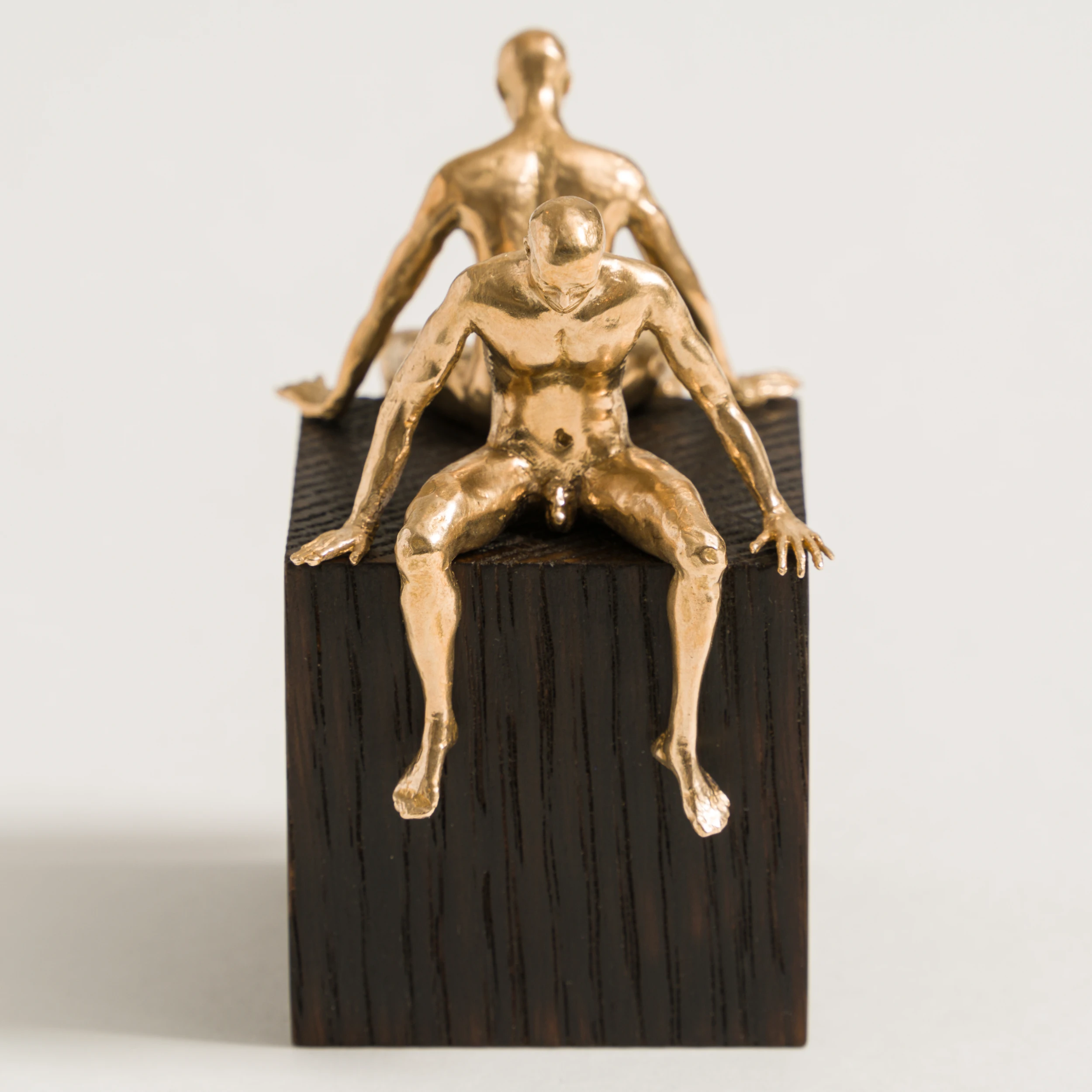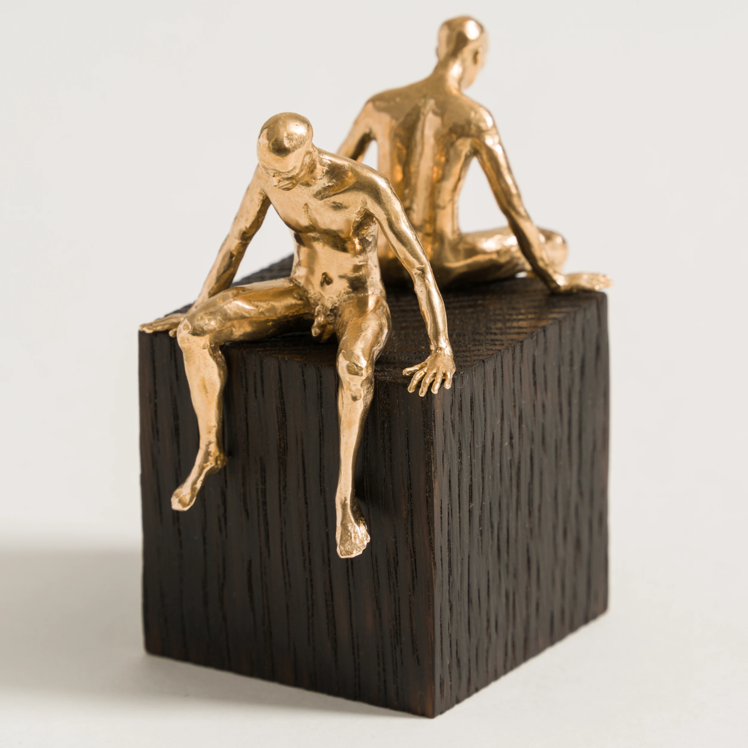 Two handmade bronze figures on a scorched oak cube by Nic Joly.