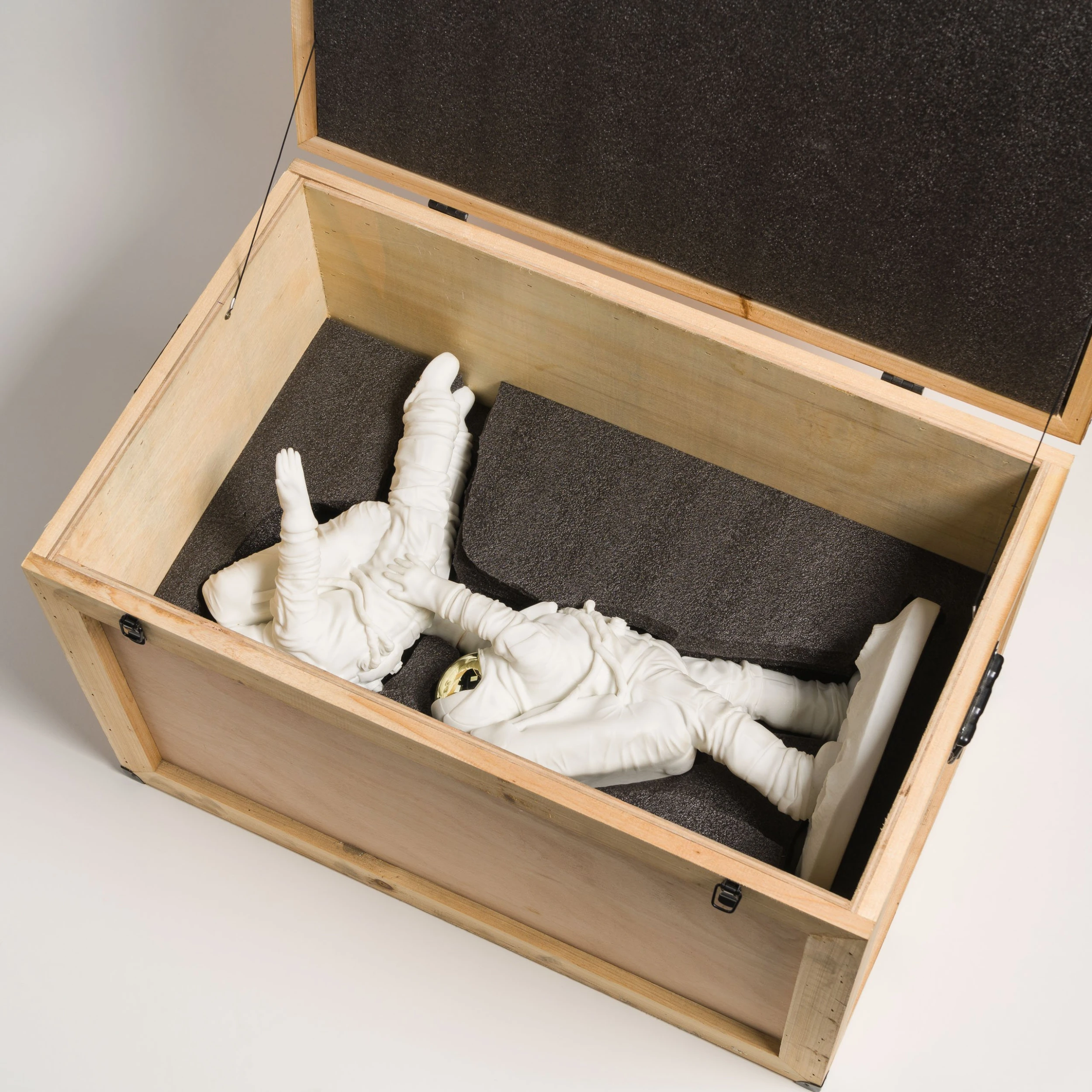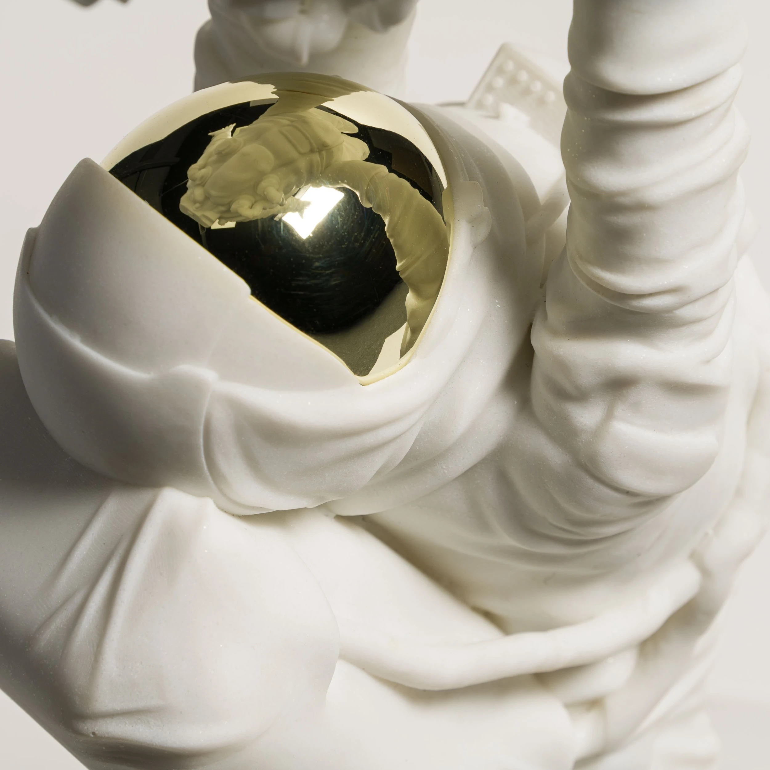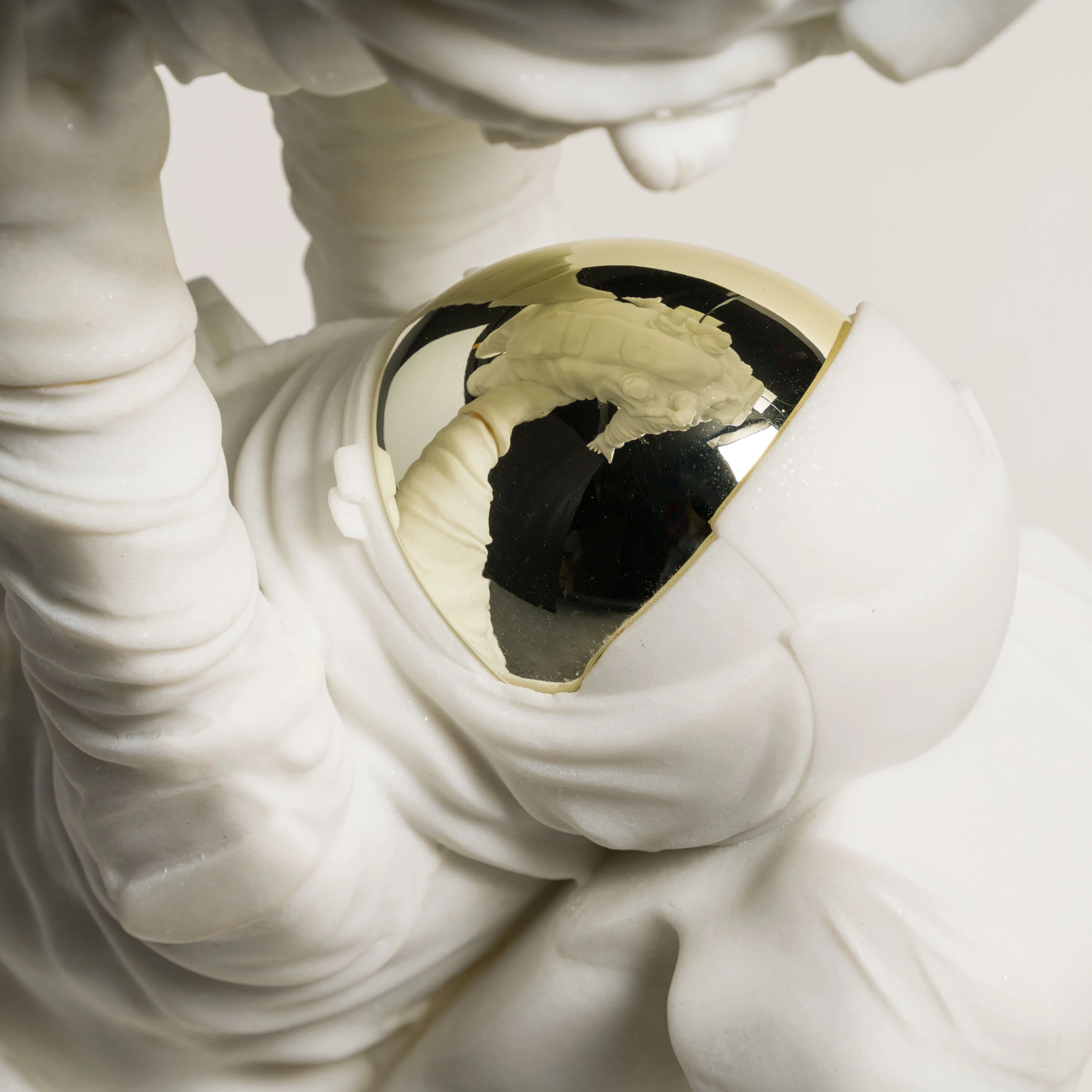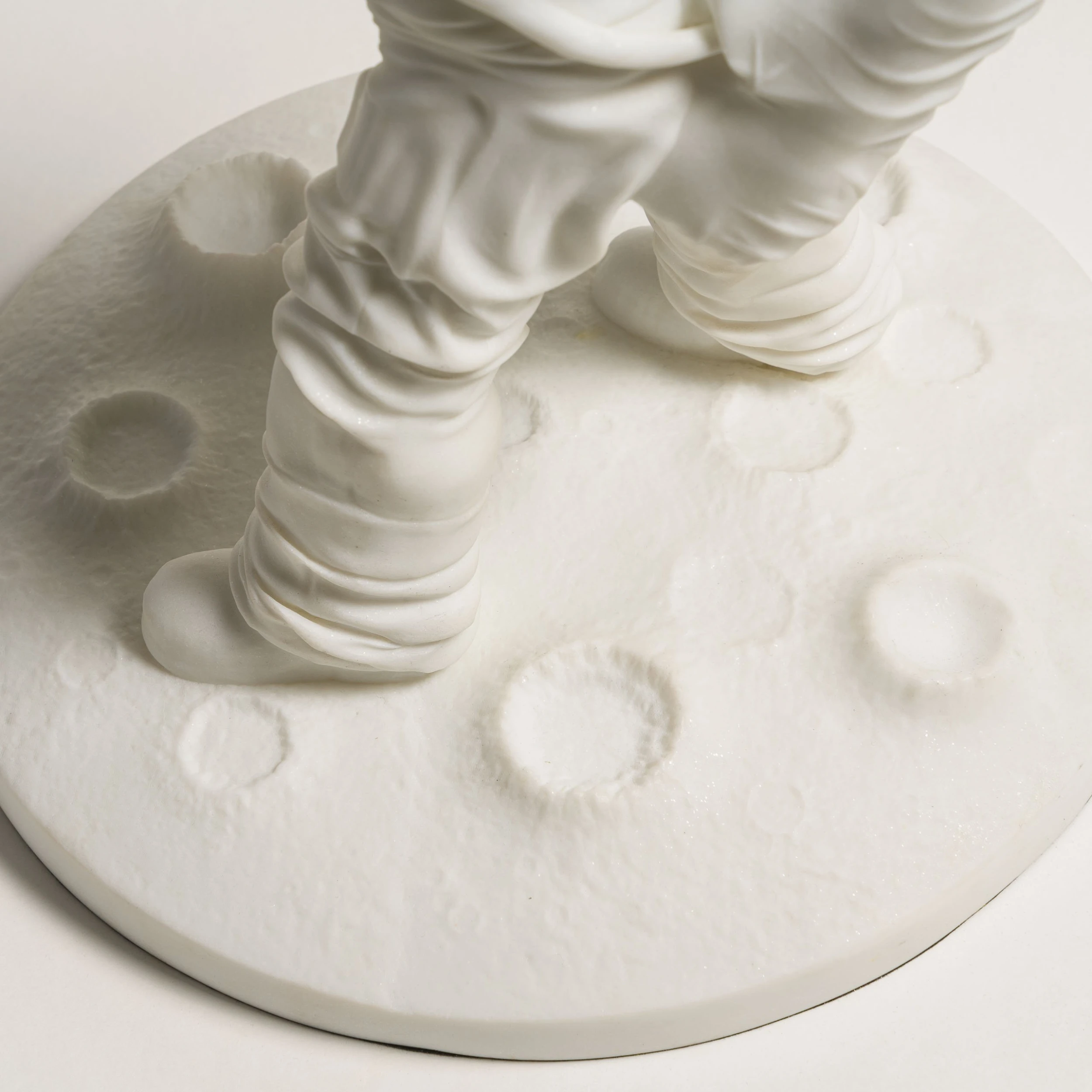 Representative of the artist’s creative take on the moon landing, the pose of the astronaut is set to imply the weightlessness of the Moon’s low gravity. “One Small Step: Lift Off” is a fun, beautiful, limited-edition sculpture by the mysterious artists Whatshisname.