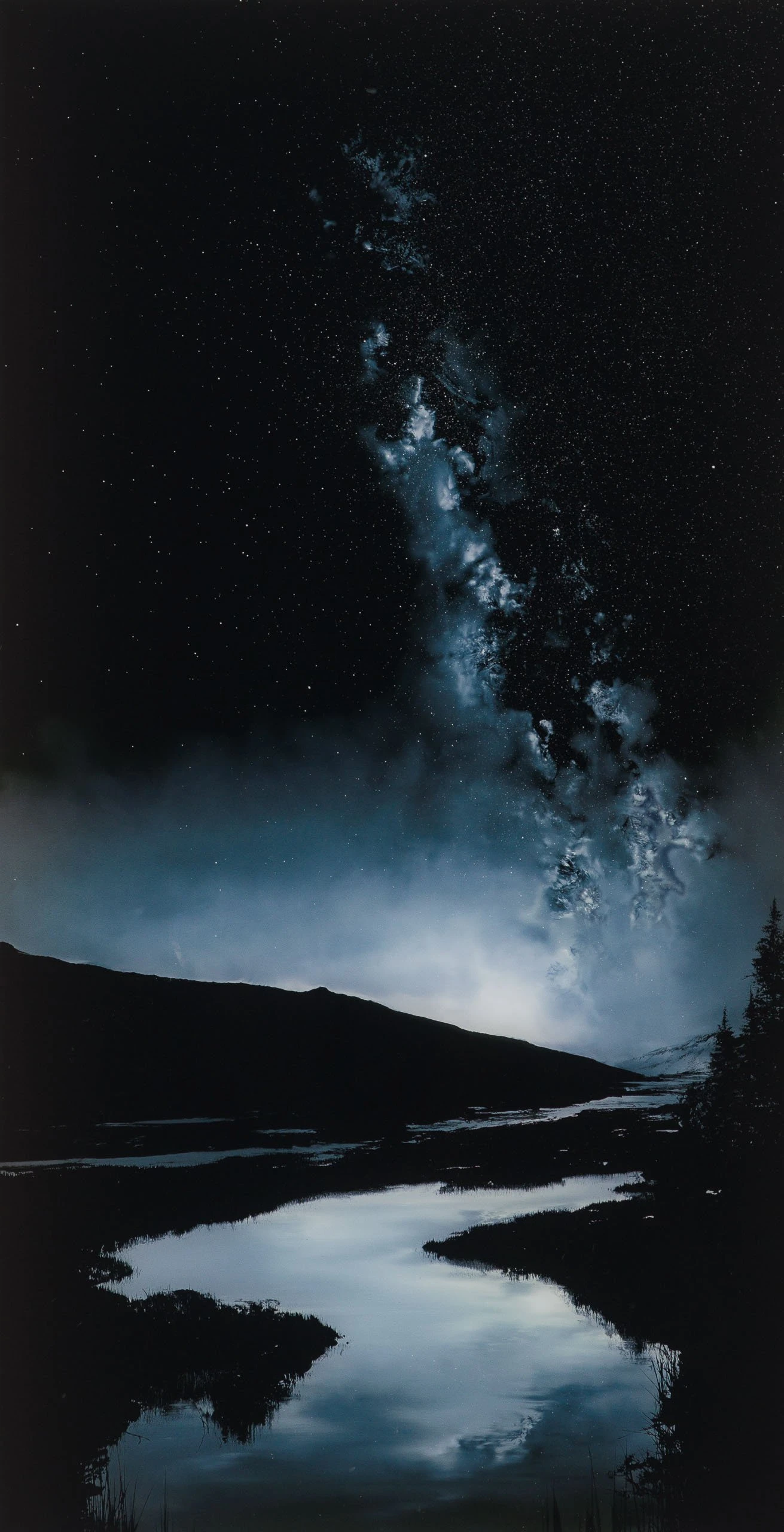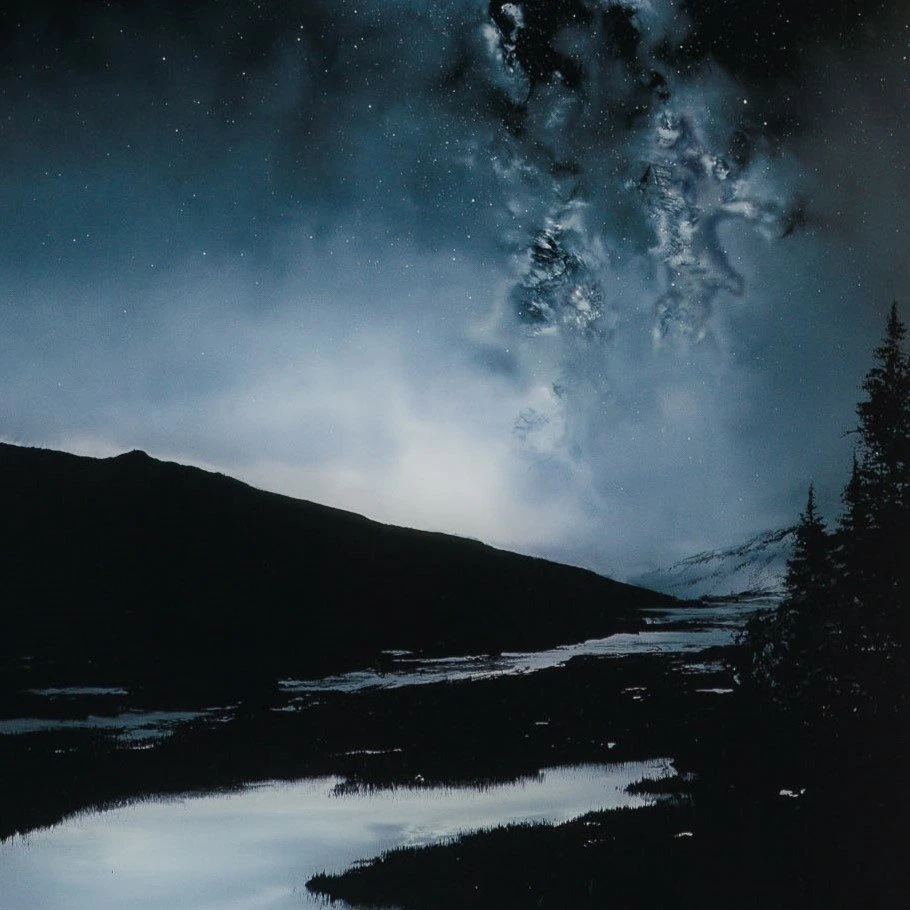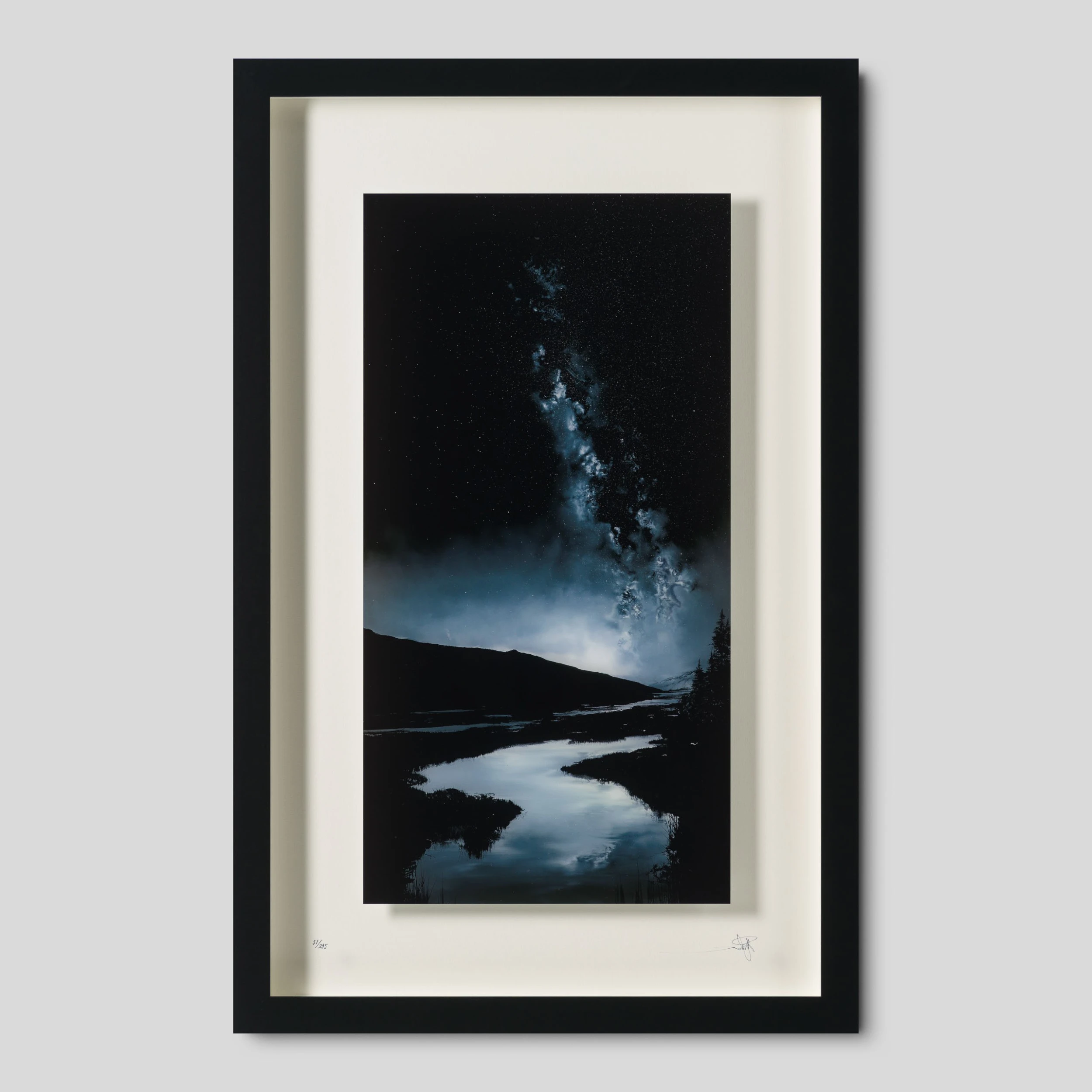Rowan brings us a new instalment to his , with the addition of two monochromatic limited-edition prints. Inspired by Icelandic landscapes and the beauty of the Scottish Highlands, the artist wanted to work on a project focused on capturing his surroundings and memories of the places he’s seen the milk way. By combining his environment with the milky way, the artist reminds us to find awe in the world we live in and the night sky. Given the difficulty of creating a glass painting with a reduced palette as opposed to with vivid aurora colours, the artist wanted to experiment in portraying the beauty of the sky in just two monochromatic tones. Testing his skills, specially shading, was the hardest part of the process, but the artist created a really atmospheric painting with monochrome shading.