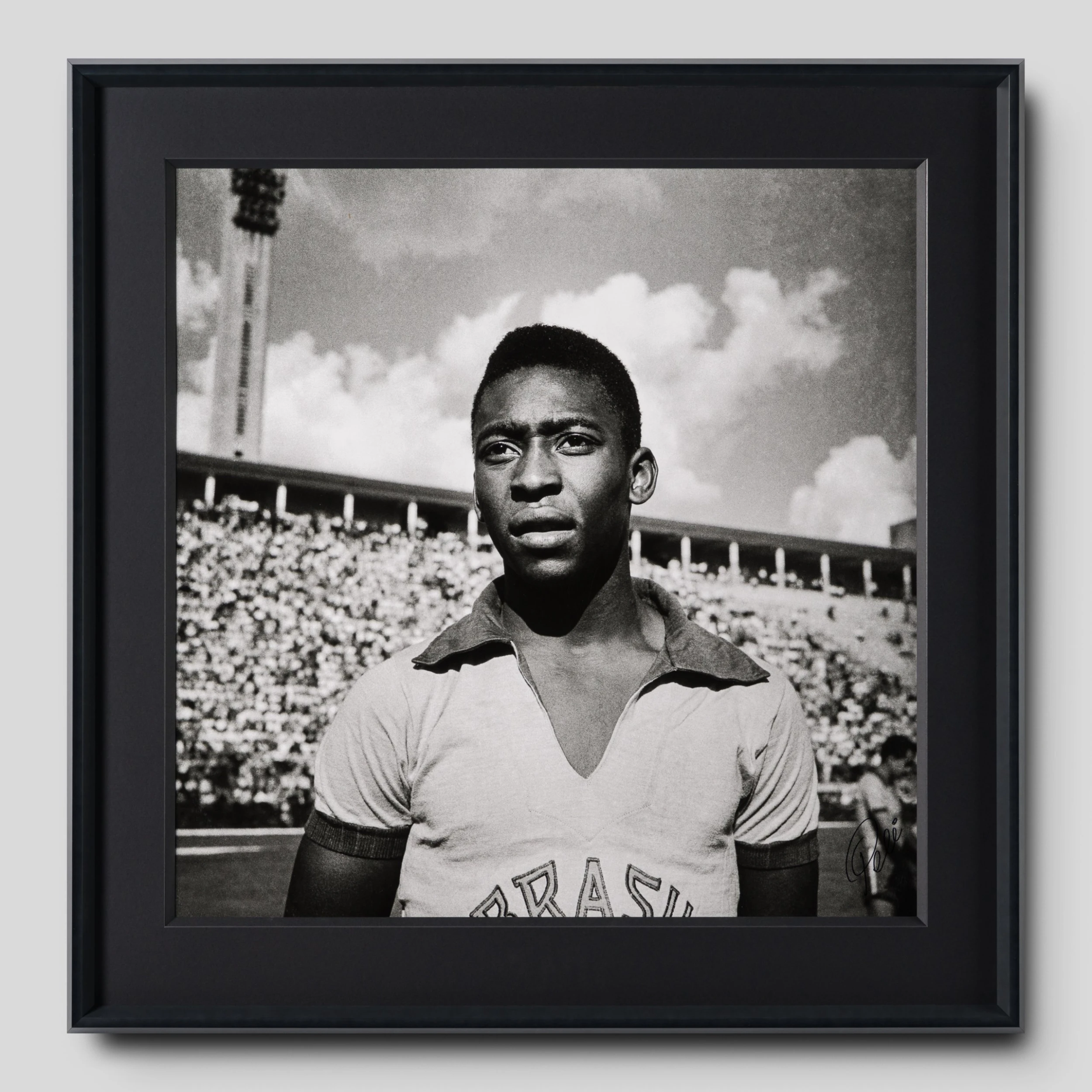 Photographed by José Dias Herrera – a Brazilian photographer who marked his legacy through sports history and who often shot Pelé, recording the biggest moments in history of football – “Pelé” is a Pelé hand-signed limited edition Silver Gelatin 60×60 artwork depicting world-famous footballer.