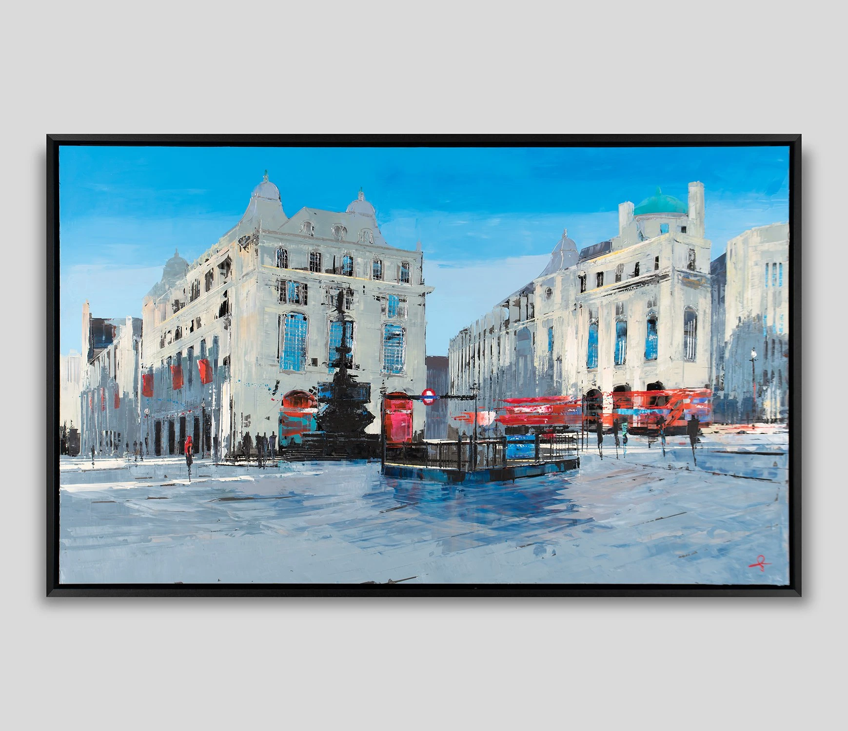 The genre of cityscapes in fine art was made famous by impressionist artists like Claude Monet and Camille Pissarro, although the genre can be traced back as early as the Middle Ages. Paul Kenton brings this genre into contemporary art through unconventional canvases, brushstrokes, tools and perspectives. The reflective metal in this artwork, for example, brings the industrial materials in London’s iconic buildings to life and creates a truly unique textured original artwork.
