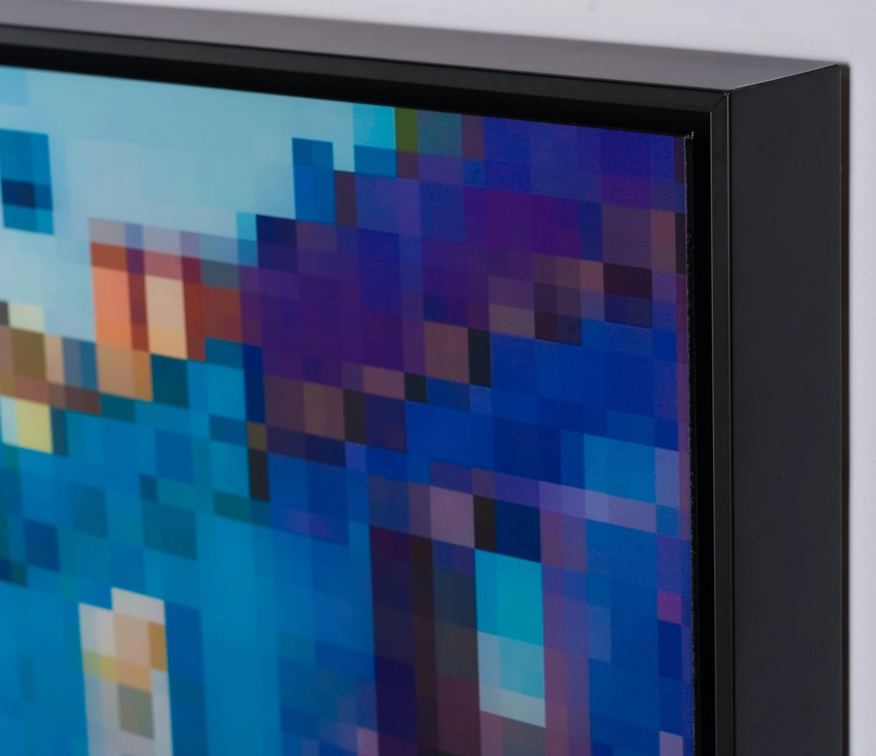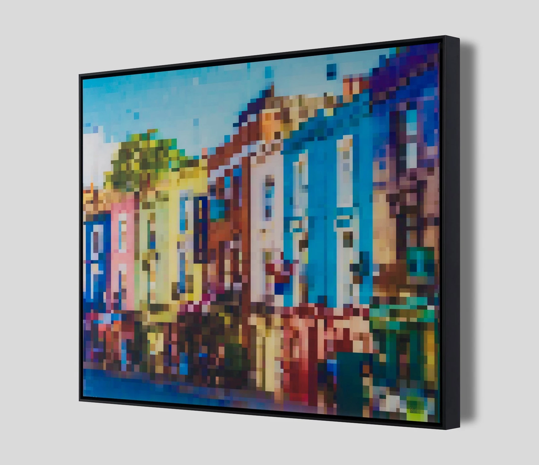 Here, Alex Echo has combined his abstract and colourful artistic approach with digital media to create this contemporary and abstract landscape of a famous London landamark, Portobello Road. Using vibrantly coloured pixels, the well-known image has been distorted but remains recognisable; commenting on the role of images in the digital age.