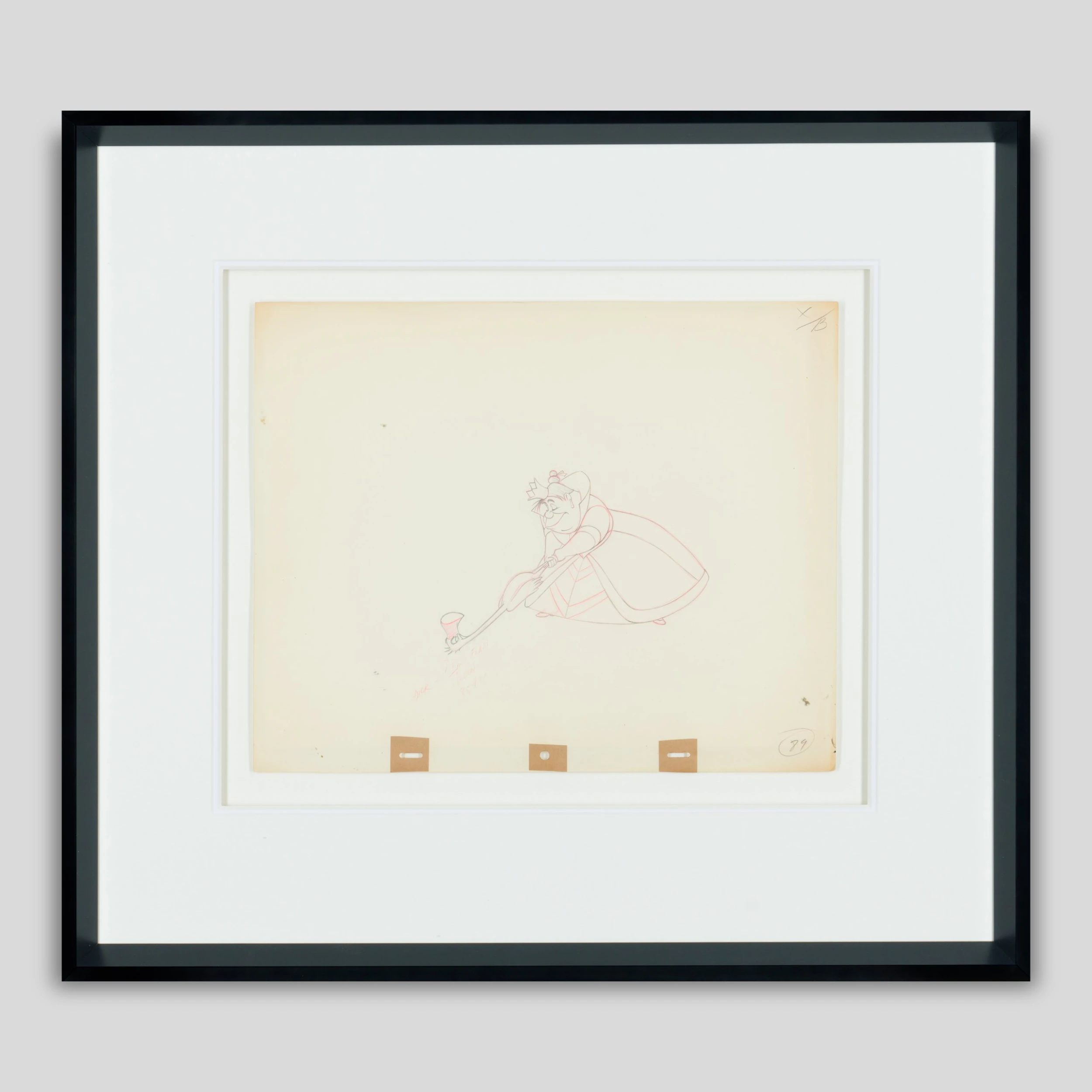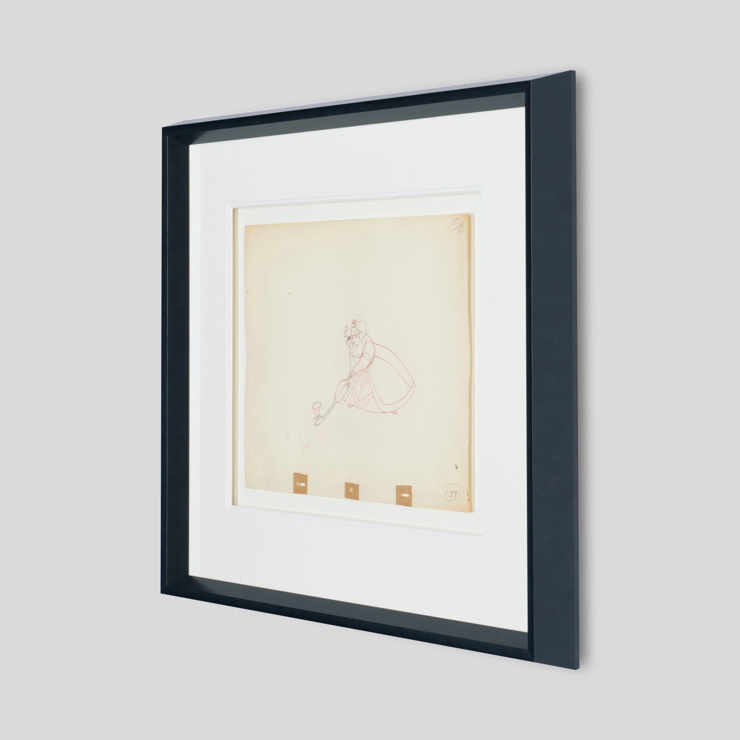 Displayed on its original, beautifully aged paper, this drawing showcases the artistic nature of the early animations and their warmly expressive forms. Following the initial script-writing and storyboarding, lead animators would draw – by hand – each of the 24 frames per second of animation. These drawings formed a flip-book that would be held in place with pins on the animators’ desk before they were hand-copied onto celluloids and filmed in colour.