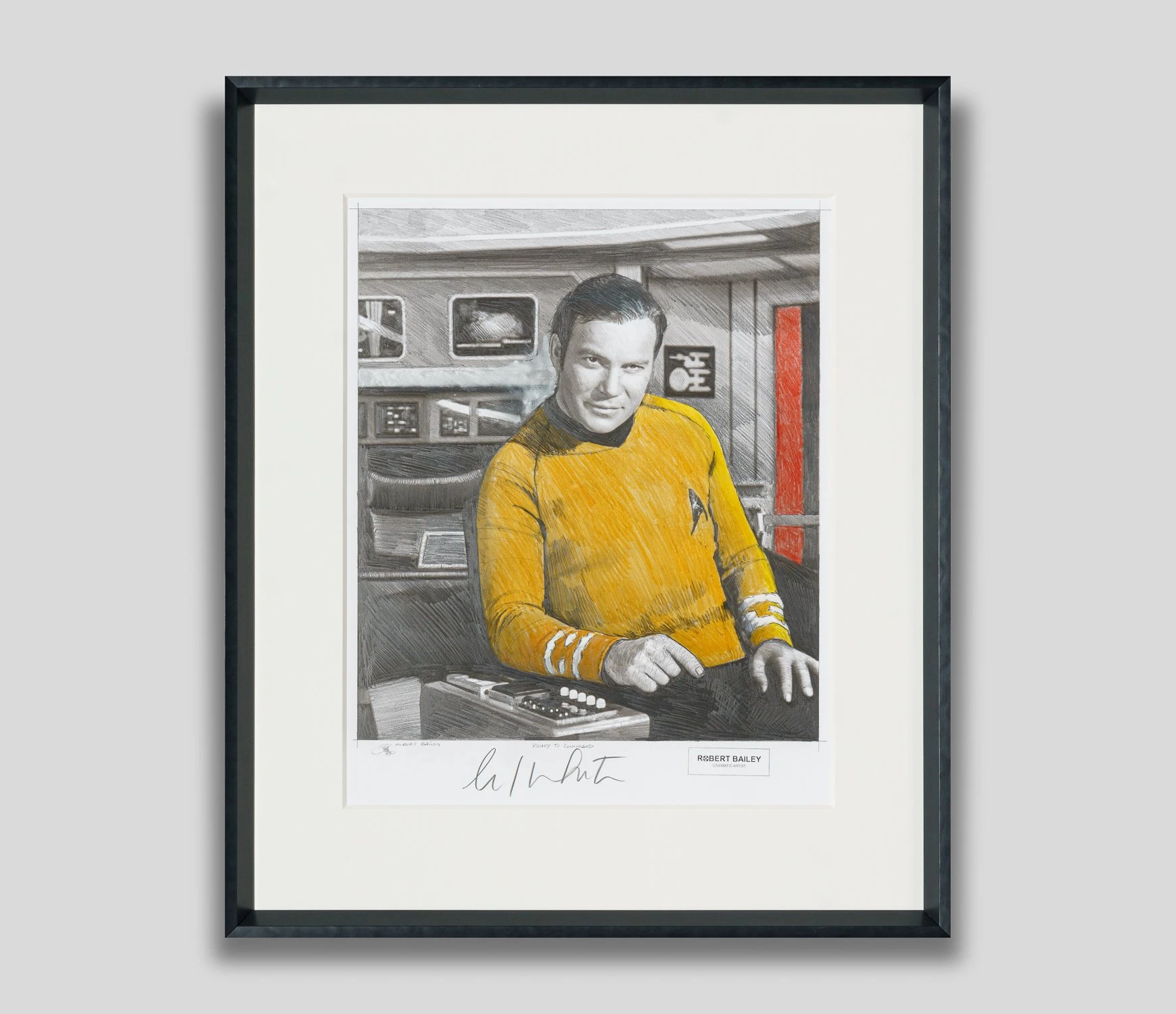 With bright pops of yellow accentuating the different tones of delicate graphite, this otherworldly original drawing by Robert Bailey perfectly captures the iconic characters and retro quality of Star Trek: The Original Series.
