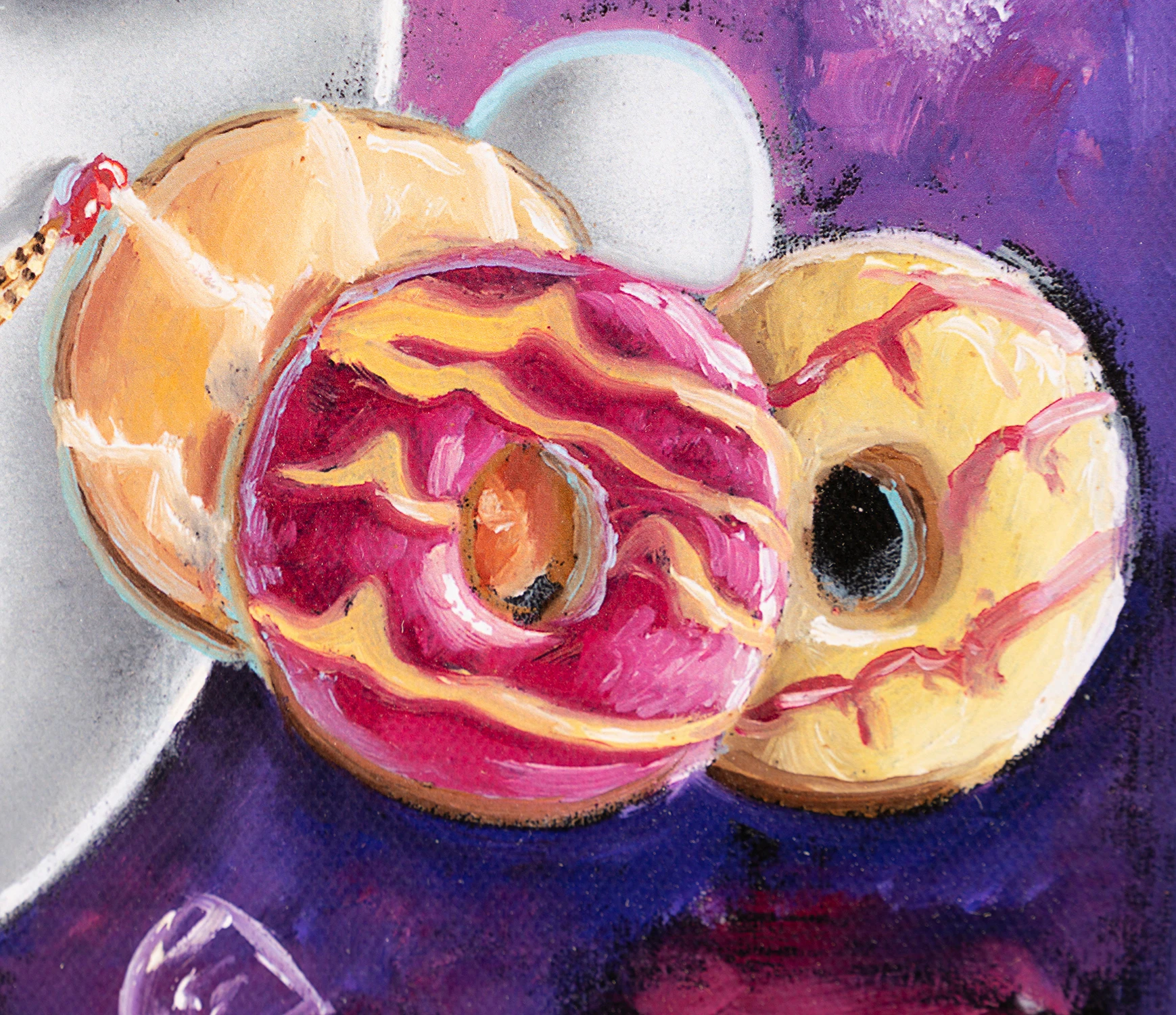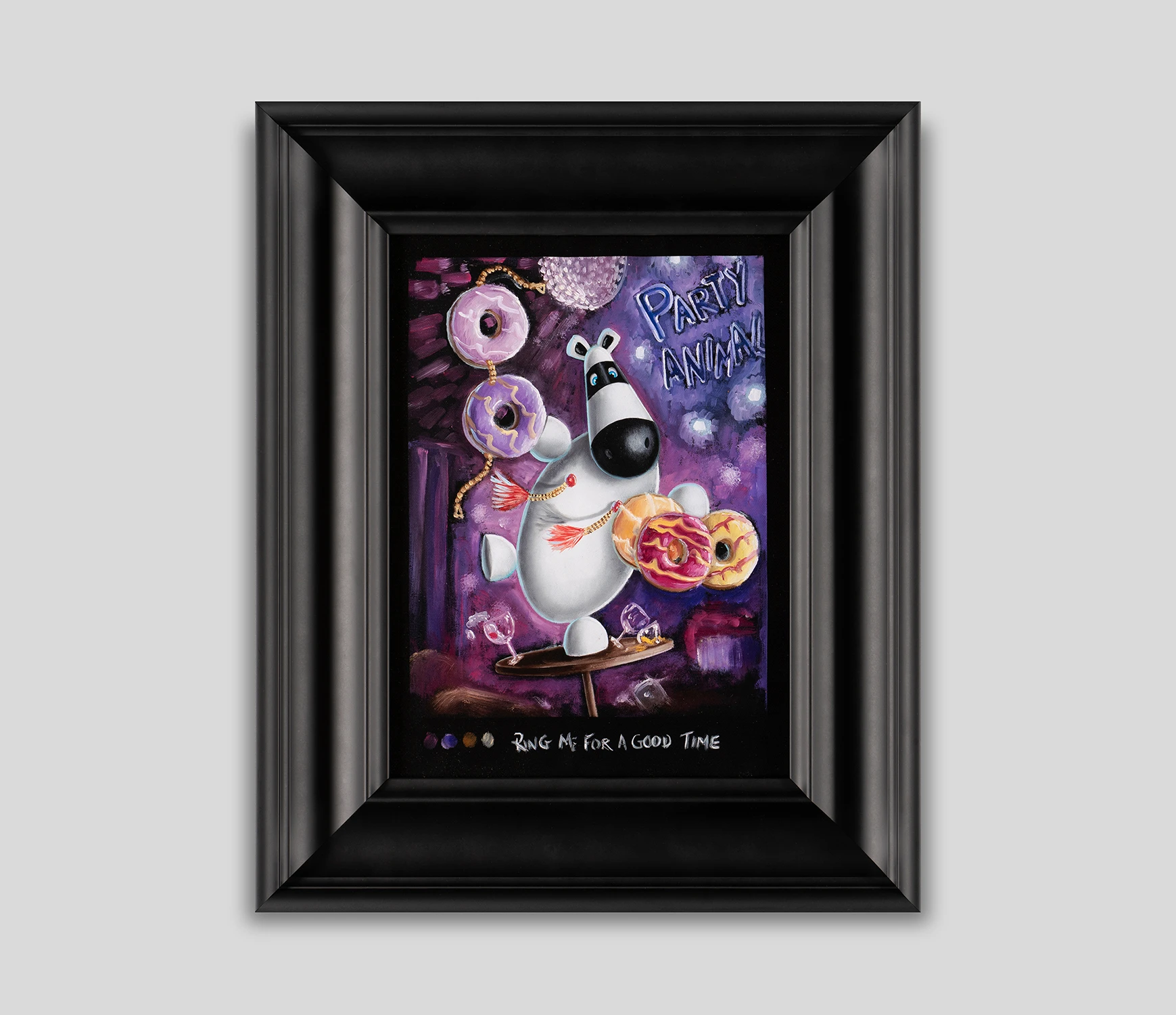 Bright and vivid colours pop out of a dark yet detailed background in this hilarious limited edition artwork by Peter and Jayne Smith. Part of their 2022 collection Ticklish Allsorts, here the artists playfully mix provocative themes with imagery of delectable delights and crafty cocktails to create a beautifully bonkers masterpiece.