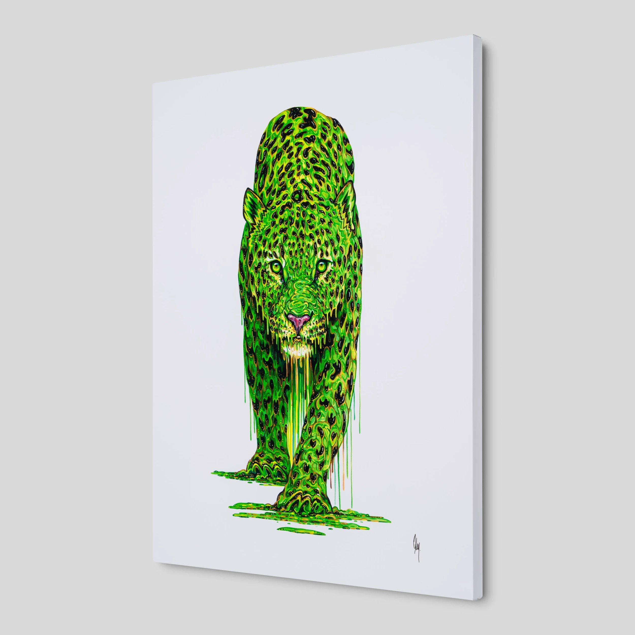 Named after the herb known for its soft and calming greyish-green leaves, in this boutique edition “Sage”, the traditional colours of a leopard are overthrown by exciting shades green, transforming the animal into an “ethereal, astral” being through his kaleidoscopic use of colour and form. Many of Oxley’s pieces skilfully blend elements of surrealism and expressionism, infusing each piece with energy and emotion. His expressive brushwork is energetic and fluid, giving his paintings a sense of movement and spontaneity as his captivating portraits feature wild animals created through intense patterns and psychedelic colour.