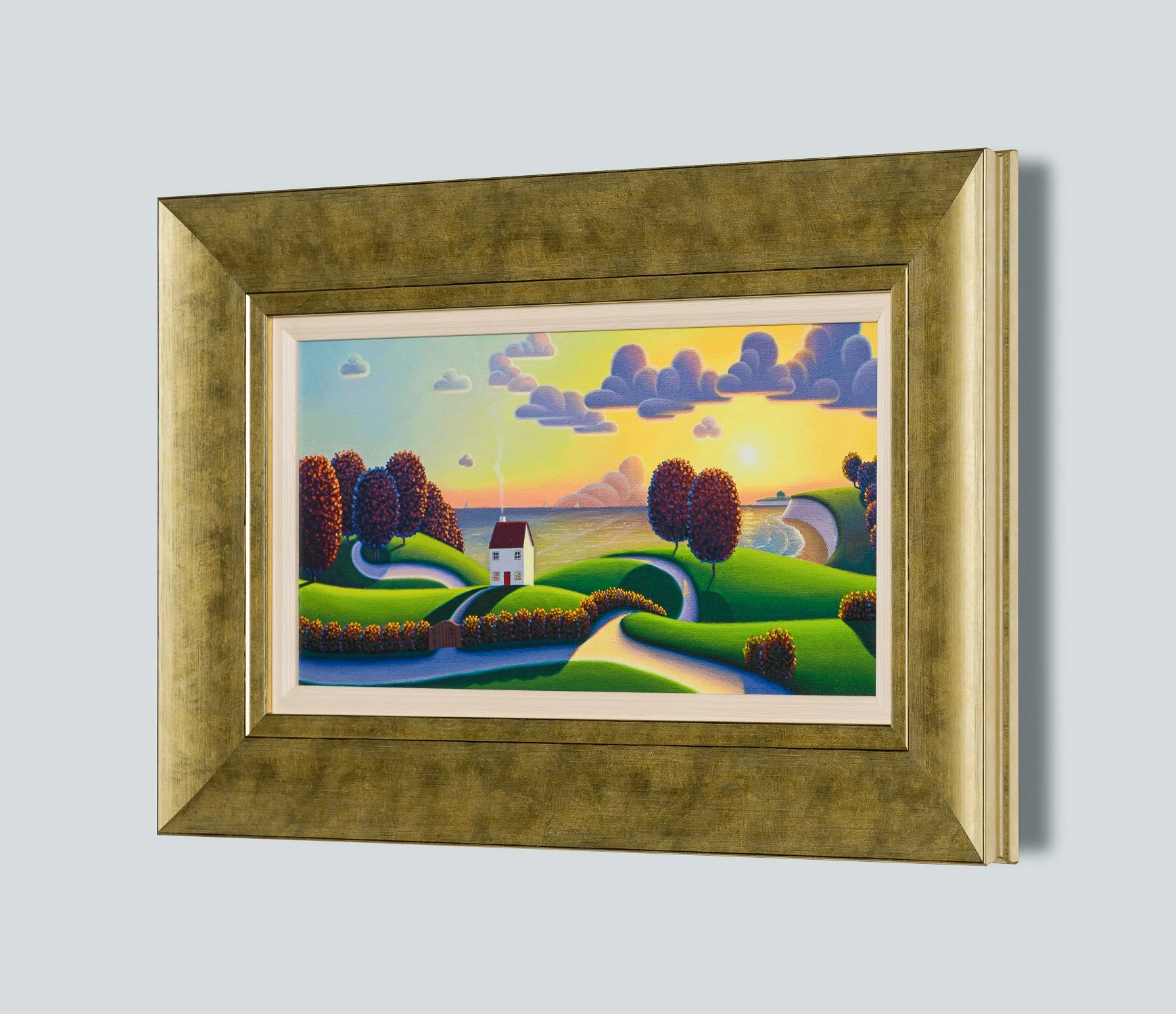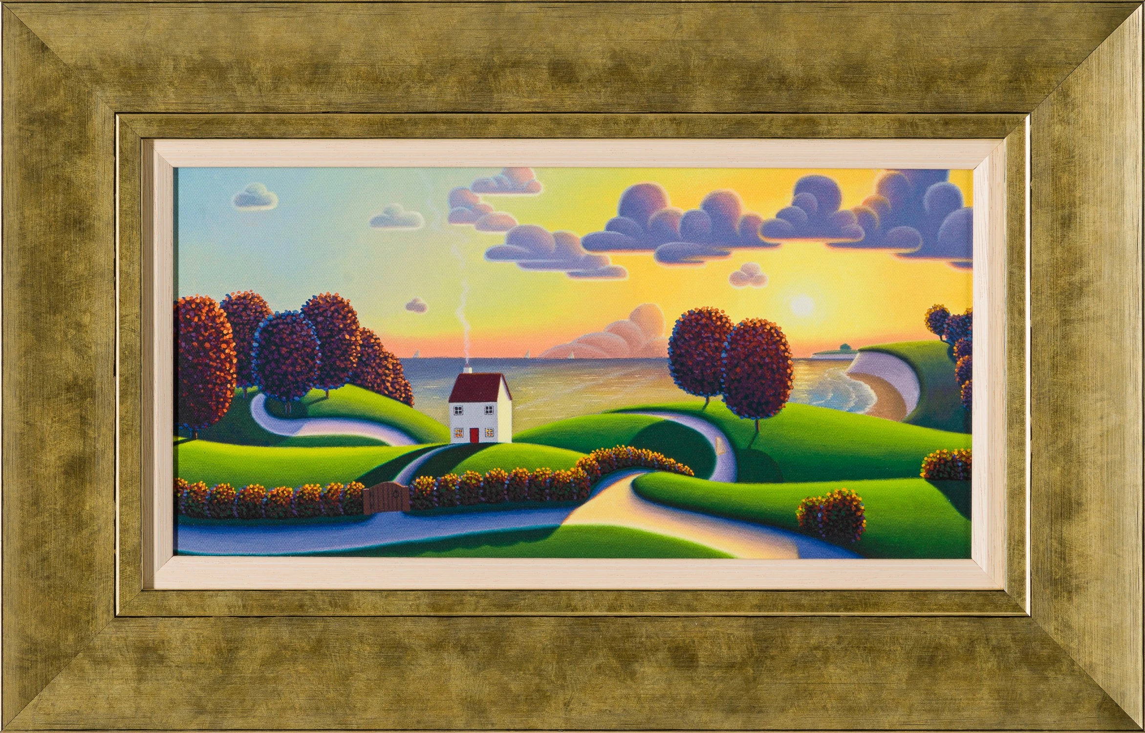 This idyllic limited edition artwork by Paul Corfield alludes to a view along the Dorset coast, a familiar scene for the artist having lived nearby and with family ties to Swanage since his birth. The bright and graduated sky leads the viewer’s eye across the composition before being aided back by the winding roads.